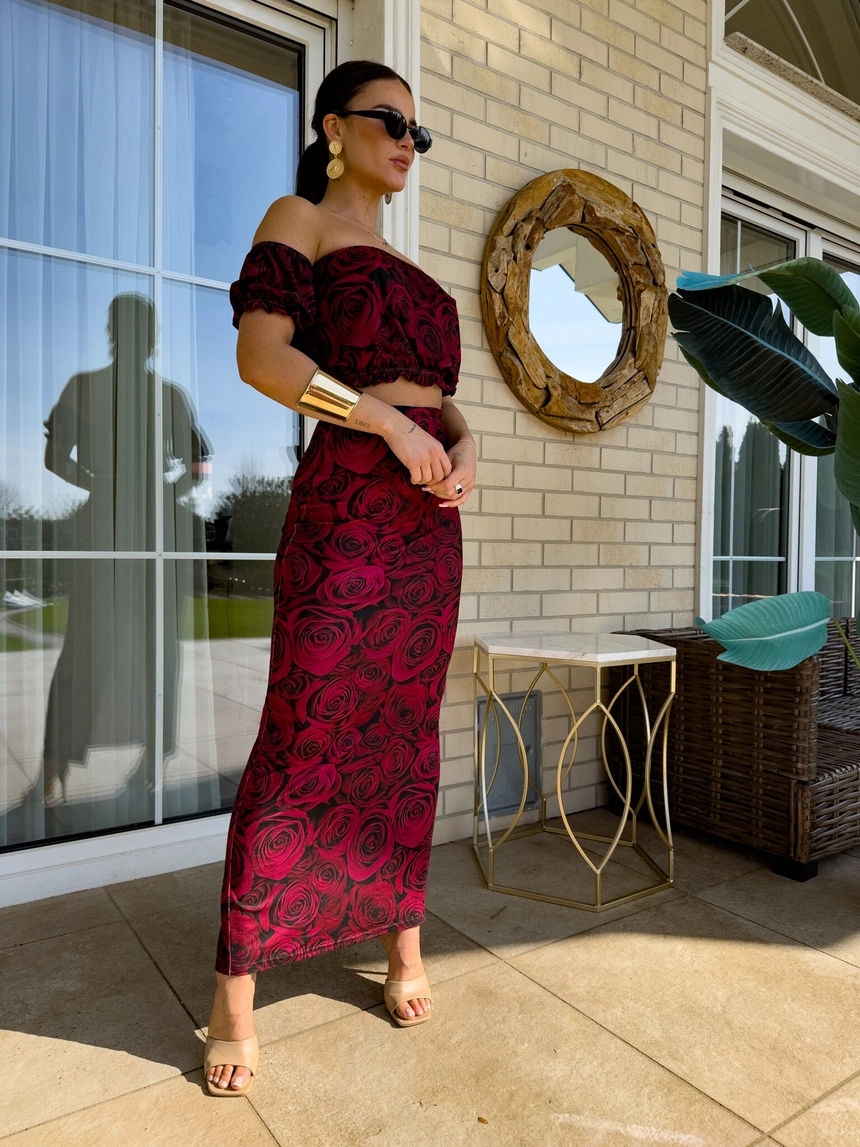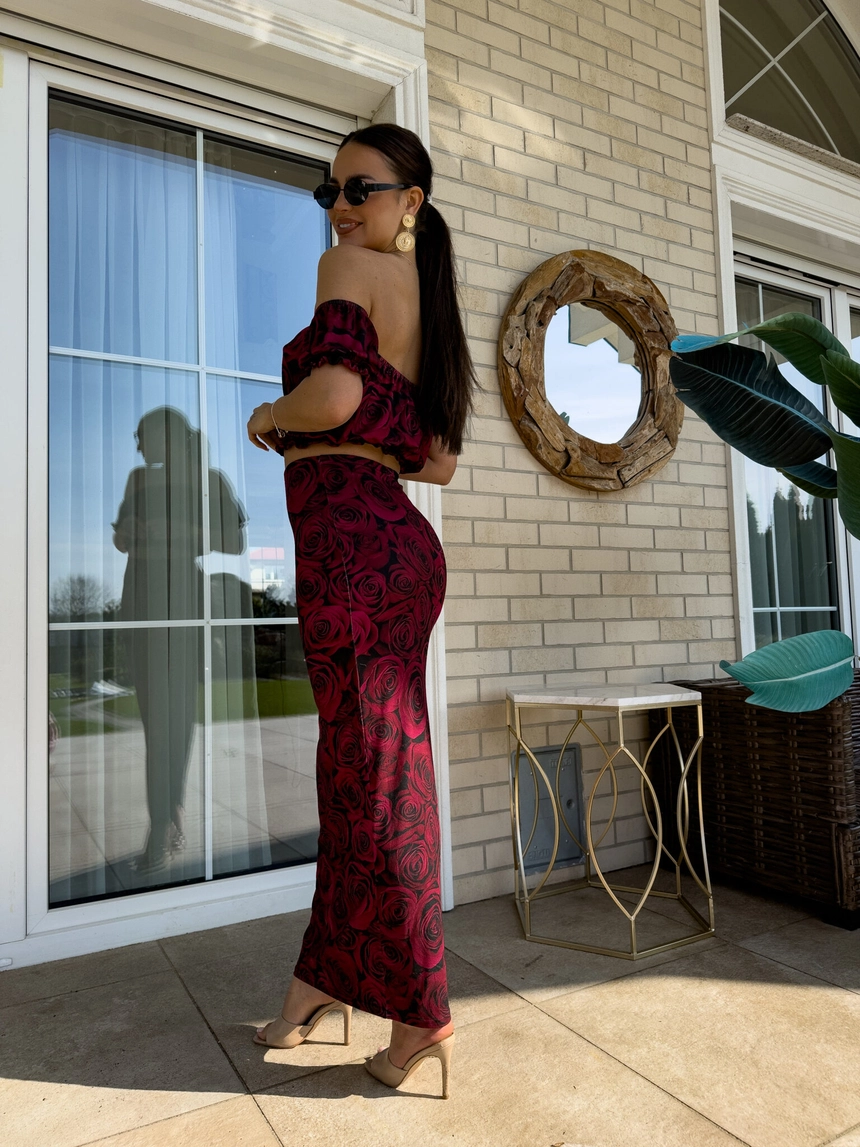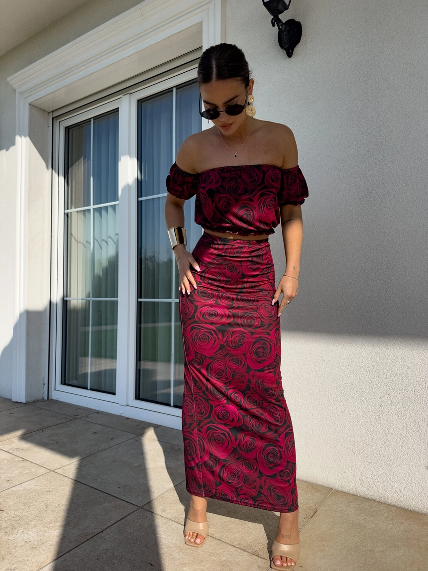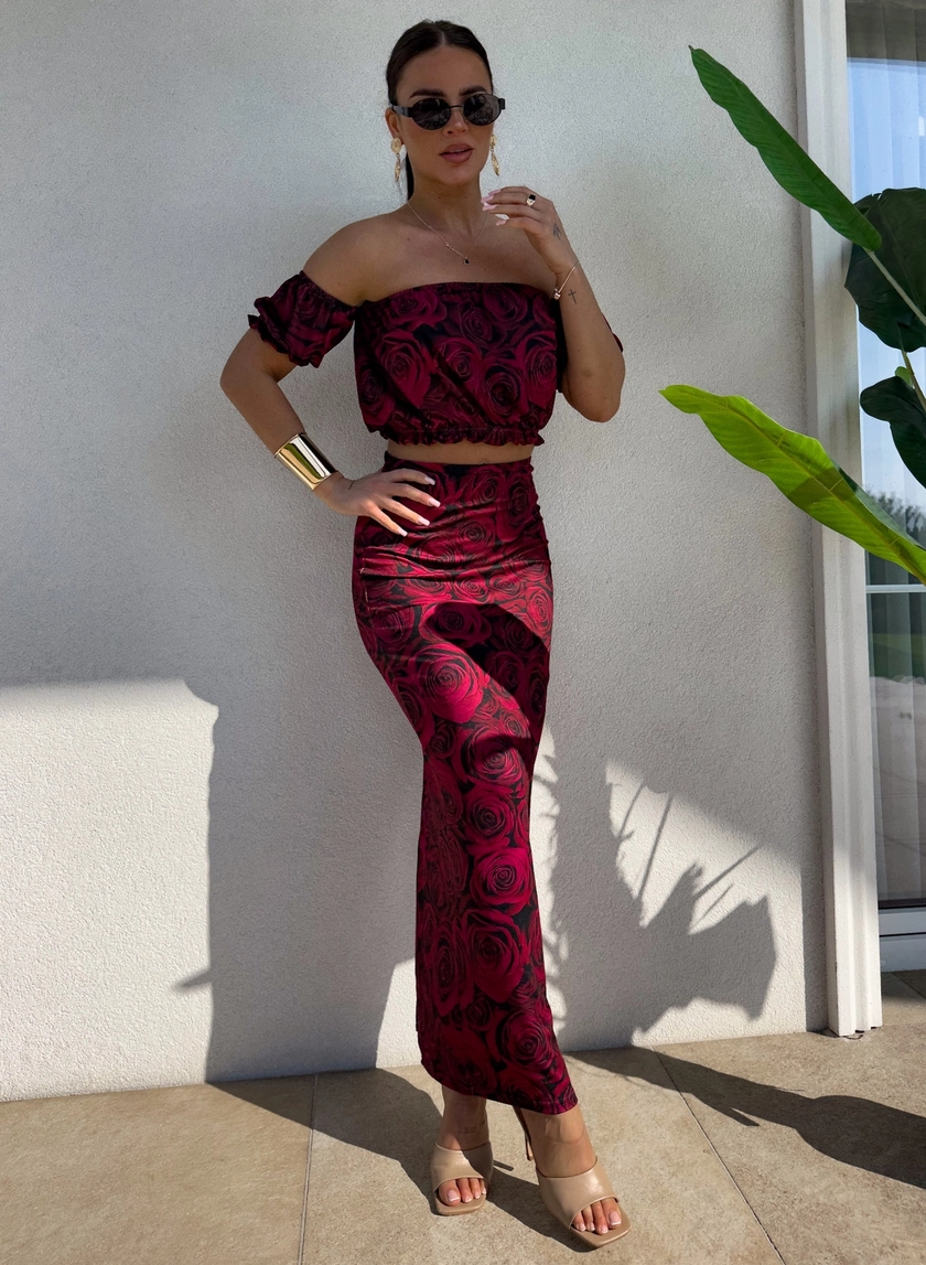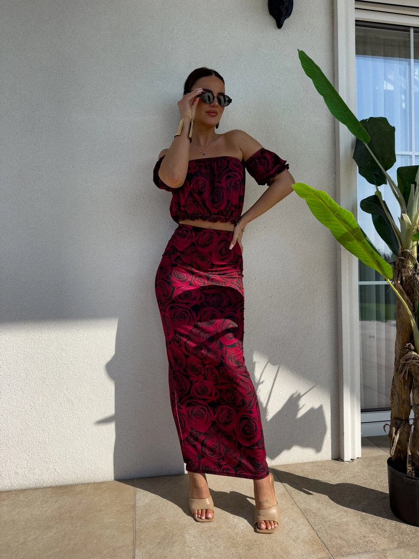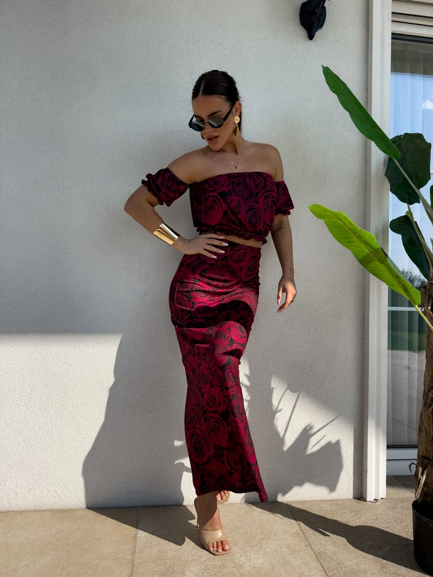 Komplet składający się z krótkiej bluzki hiszpanki oraz klasycznej spódnicy maxi to idealne połączenie elegancji i komfortu. Bluzka wykonana jest z elastycznego, ciągliwego materiału, który doskonale dopasowuje się do ciała, zapewniając swobodę ruchów. Krótki krój podkreśla sylwetkę. Spódnica maxi jest klasyczna, o długości do ziemi, z eleganckim rozcięciem z tyłu, które dodaje lekkości i zmysłowości. Gumka w pasie gwarantuje wygodę i perfekcyjne dopasowanie do figury. Całość stanowi doskonały wybór na letnie dni, na wyjątkowe okazje lub codzienne stylizacje z nutą elegancji.