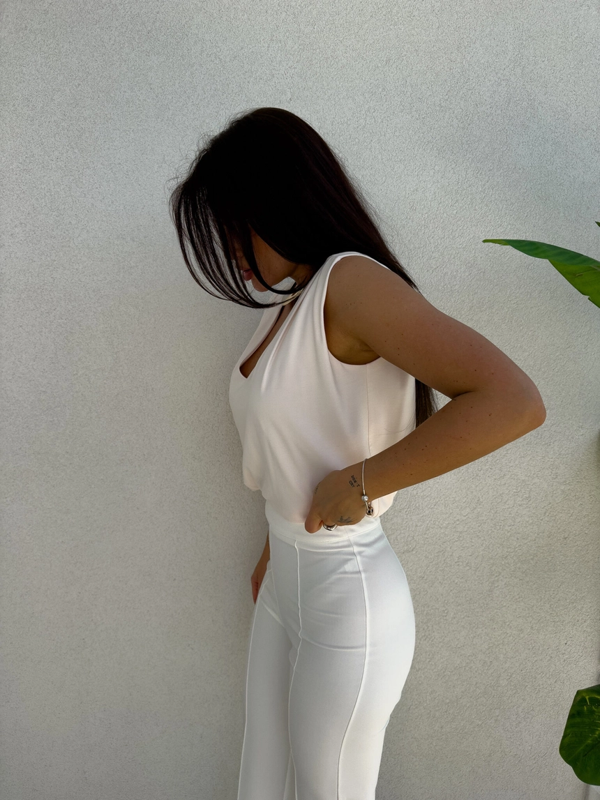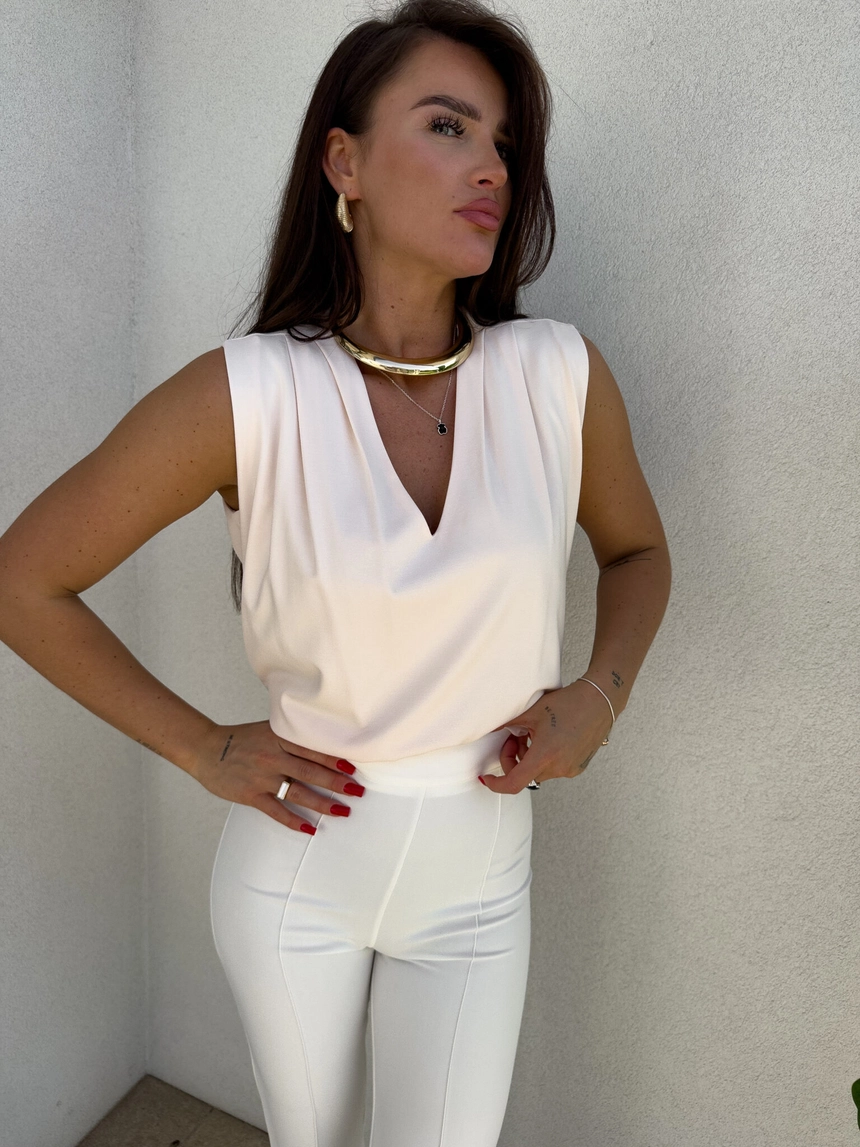 Stylowa bluzka wykonana z podwójnej warstwy przyjemnego w dotyku materiału to idealna propozycja na cieplejsze dni. Klasyczny dekolt w kształcie litery V subtelnie podkreśla szyję i obojczyki, dodając kobiecego uroku. Luźniejszy, delikatnie marszczony przód nadaje sylwetce lekkości i swobody, a brak rękawów sprawia, że model doskonale sprawdzi się zarówno w codziennych, jak i bardziej eleganckich stylizacjach.
