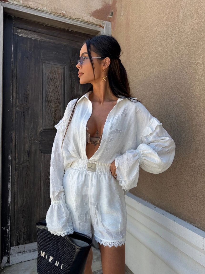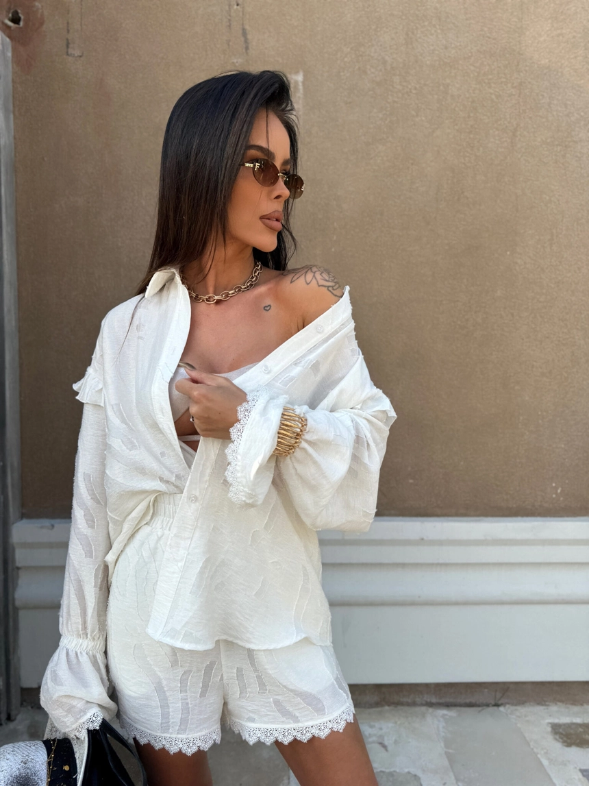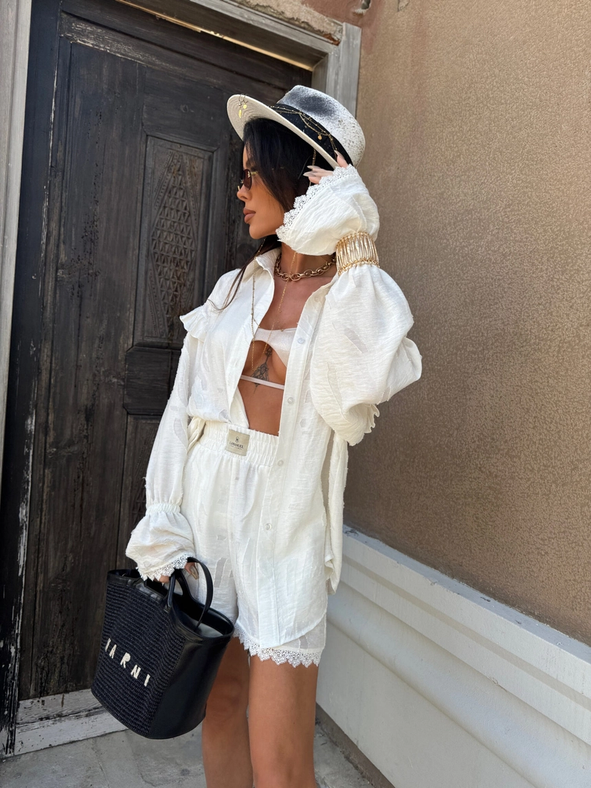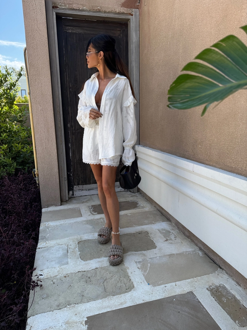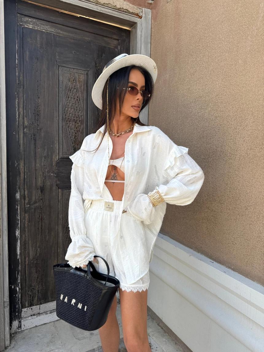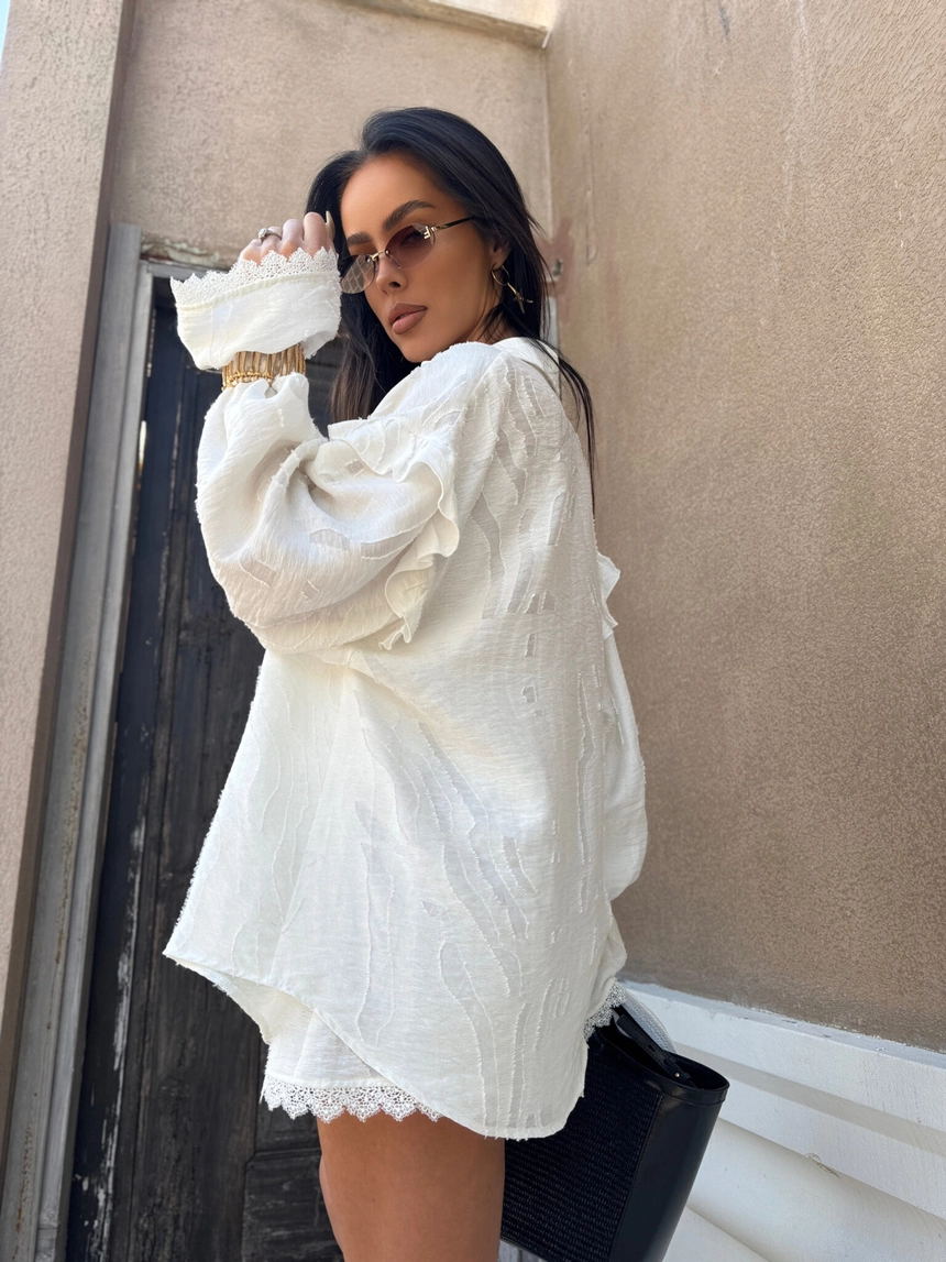 Koszula wykonana z półtransparentnej tkaniny o subtelnym, tłoczonym wzorze w kwiatowym stylu ma luźny, oversize’owy krój z długim rękawem wykończonym falbaną i koronką oraz lekko opadającym ramieniem, co nadaje jej wakacyjny, swobodny charakterSkład: 64% wiskoza 24% len 12% nylon