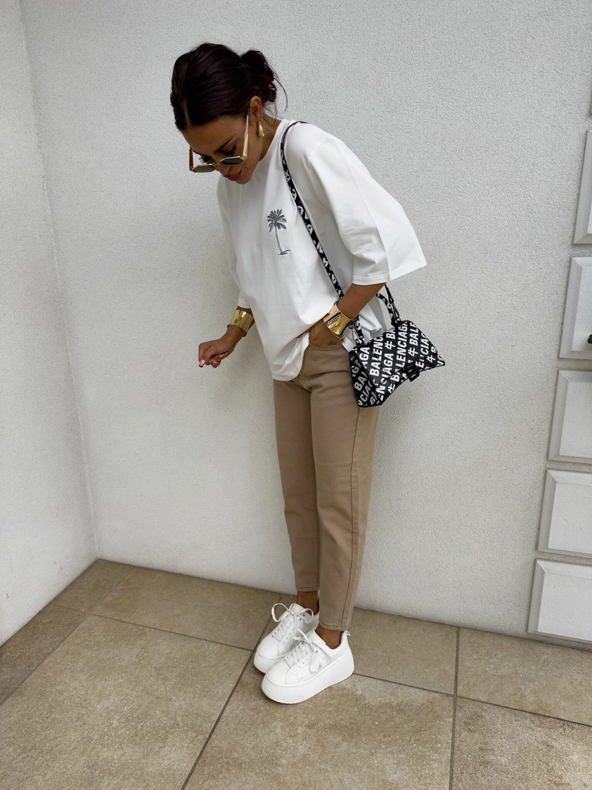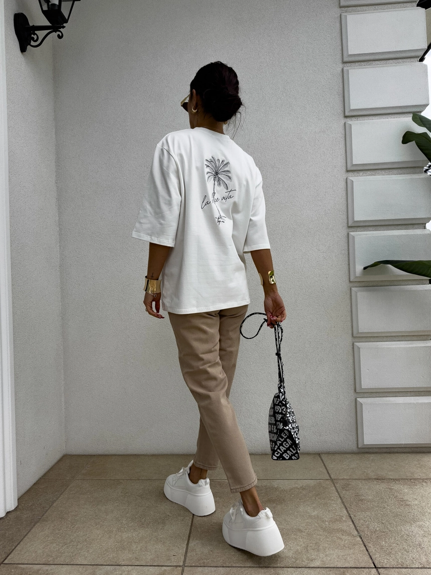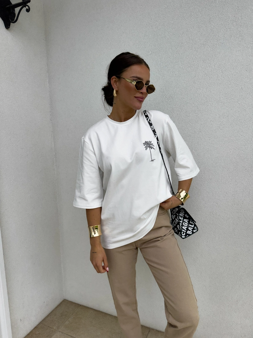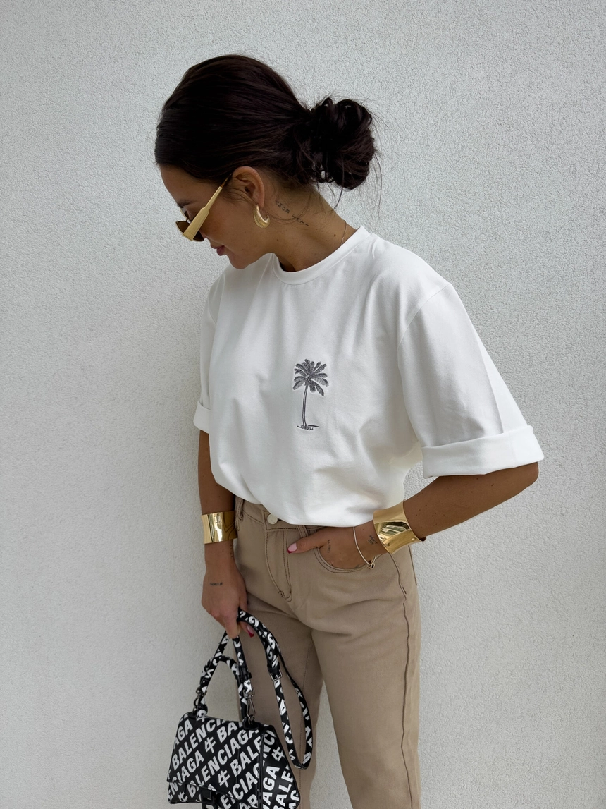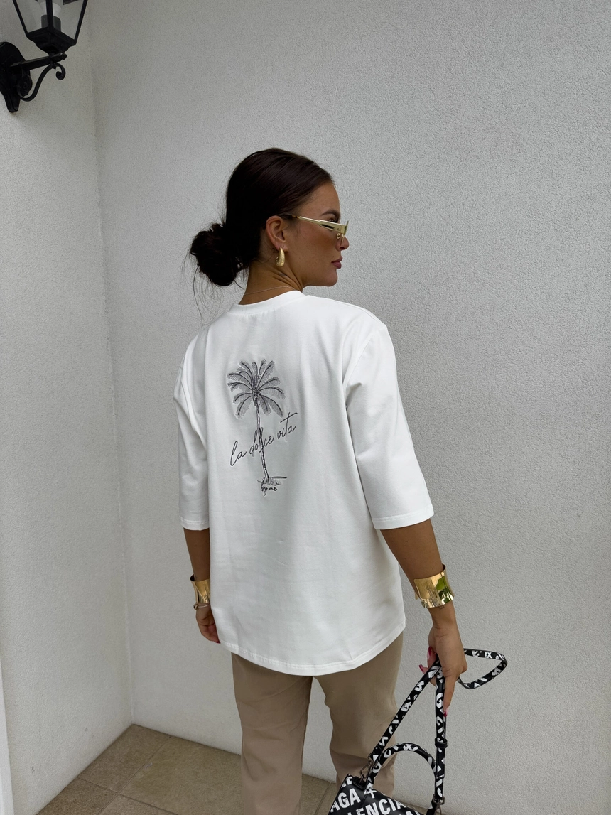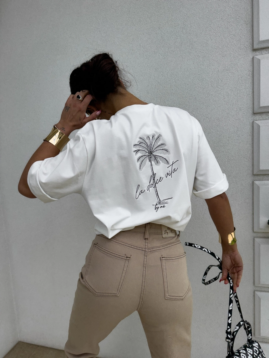 T-shirt PALMS z wysokiej jakości bawełny, posiada dłuższe rękawy. Z przodu koszulki znajduje się subtelny haft przedstawiający palmę, natomiast z tyłu – większy haft z motywem palmy oraz napisem „LA DOLCE VITA”, co w tłumaczeniu z języka włoskiego oznacza „słodkie życie”. To stylowy detal, który przywołuje na myśl letnie dni, relaks i wolność. Idealna propozycja na wakacyjne wypady, spacer po plaży lub po prostu – gdy chcesz poczuć klimat lata niezależnie od pory roku.