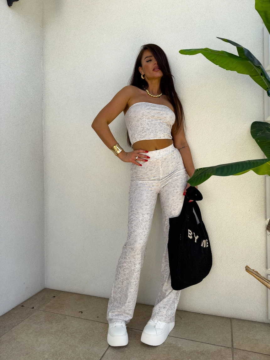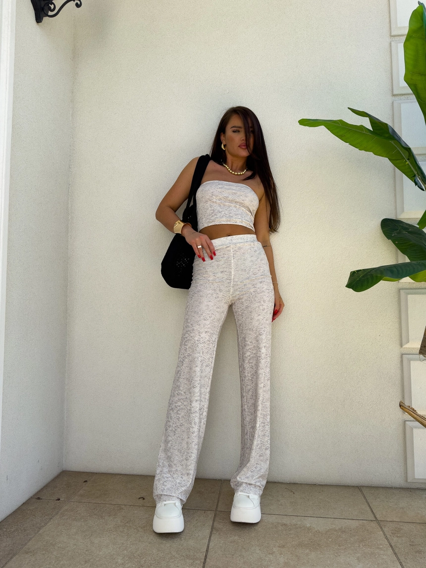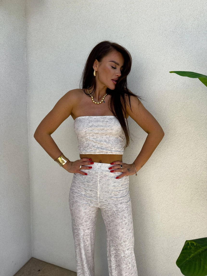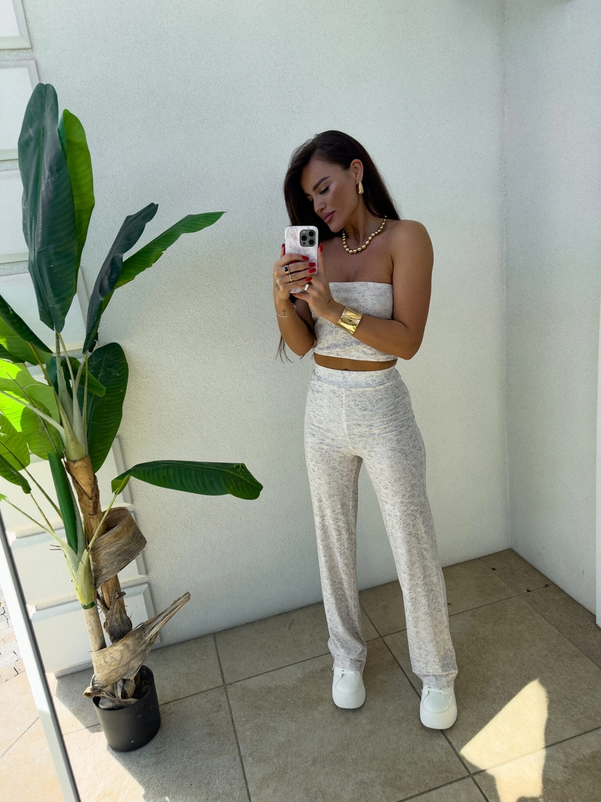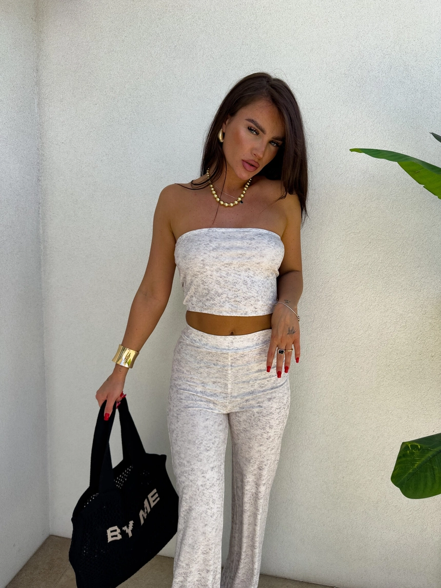 Komplet NYC to nowoczesna i stylowa propozycja w sportowo-casualowym wydaniu. Składa się z dopasowanego topu typu opaska bez ramiączek oraz spodni z wysokim stanem i prostą nogawką. Całość wykonana z miękkiego materiału, co zapewnia komfort noszenia.