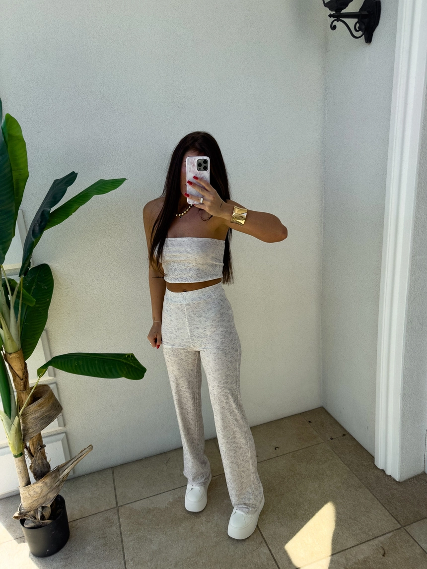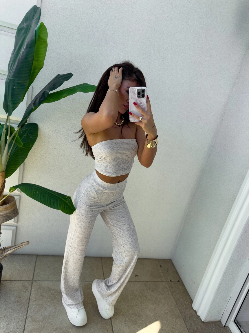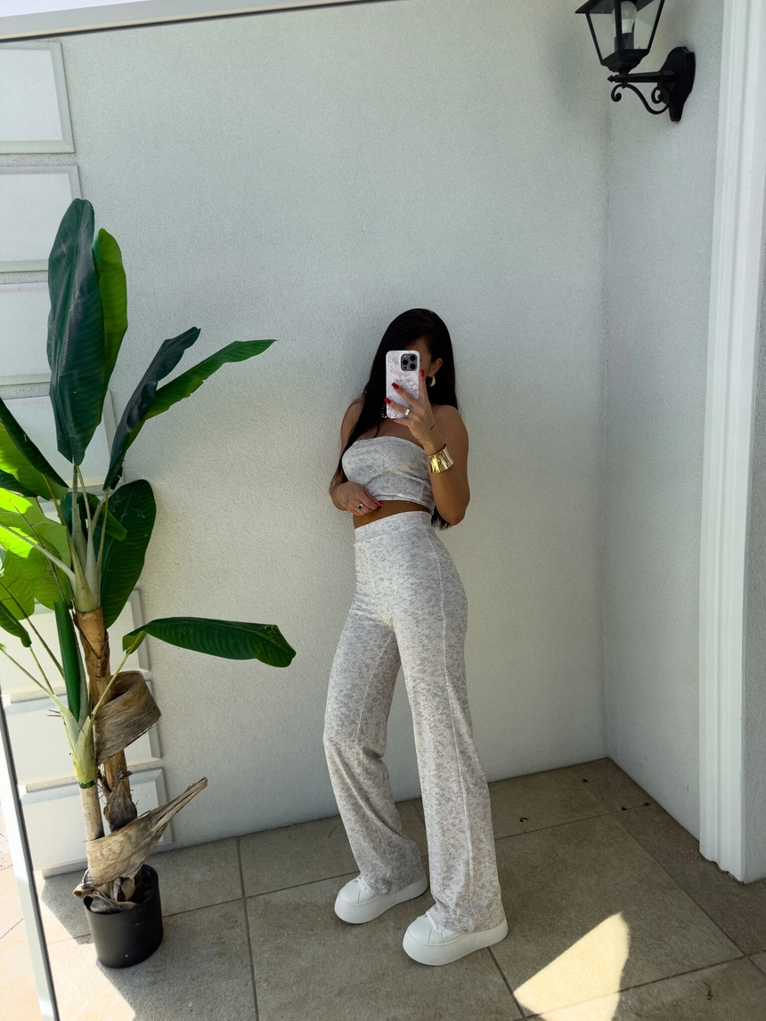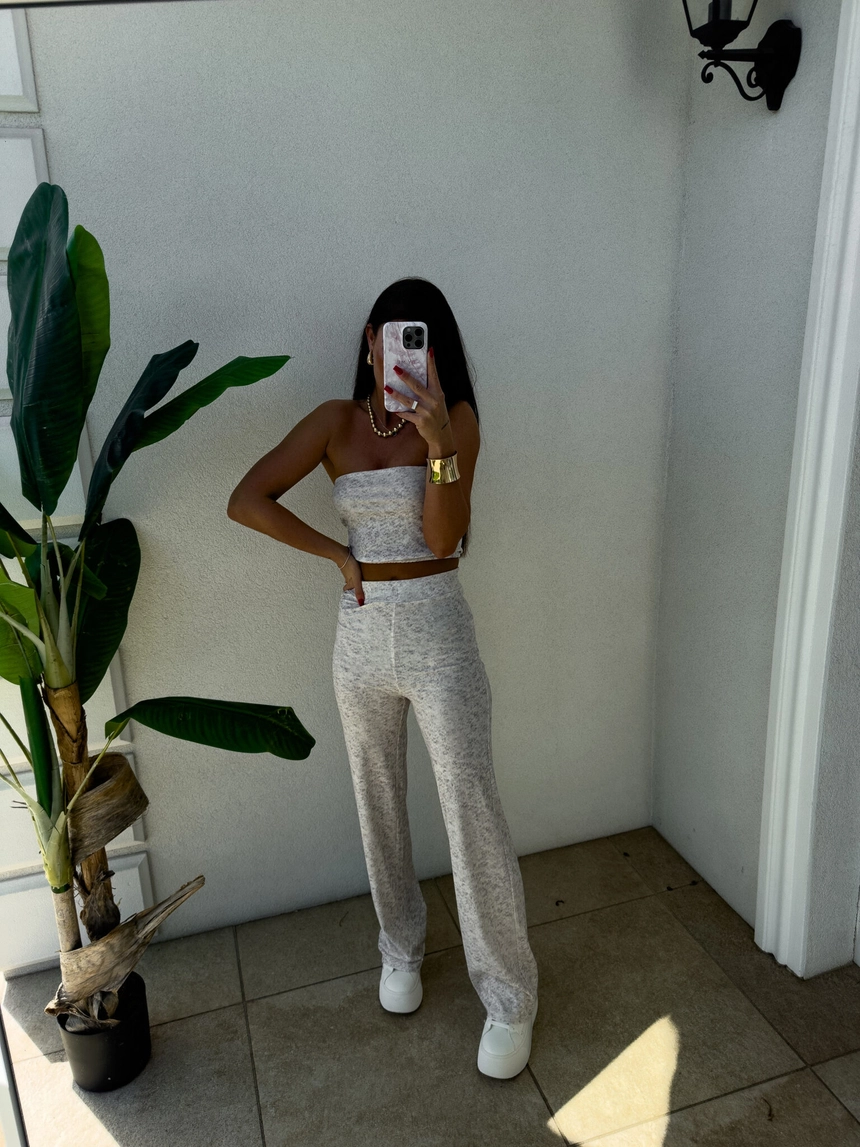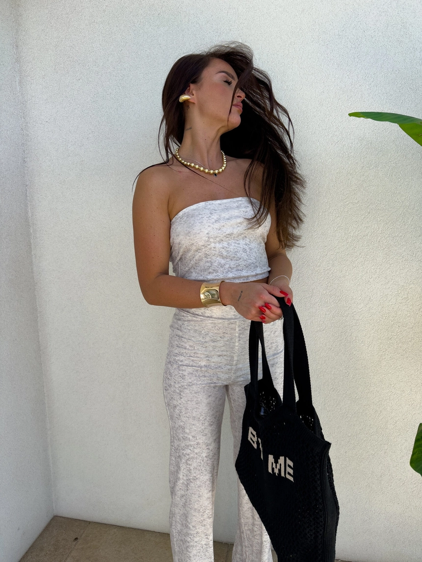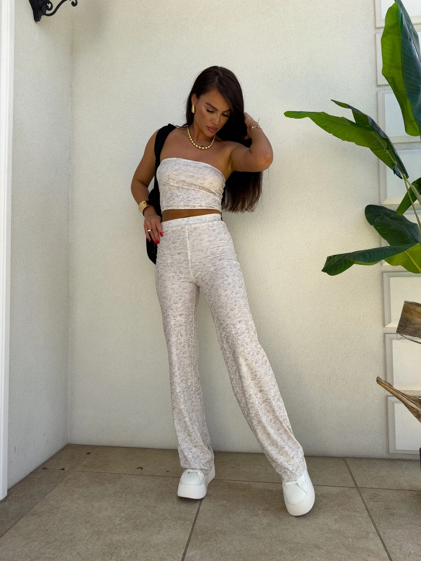 Komplet NYC to nowoczesna i stylowa propozycja w sportowo-casualowym wydaniu. Składa się z dopasowanego topu typu opaska bez ramiączek oraz spodni z wysokim stanem i prostą nogawką. Całość wykonana z miękkiego materiału, co zapewnia komfort noszenia.