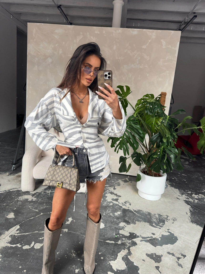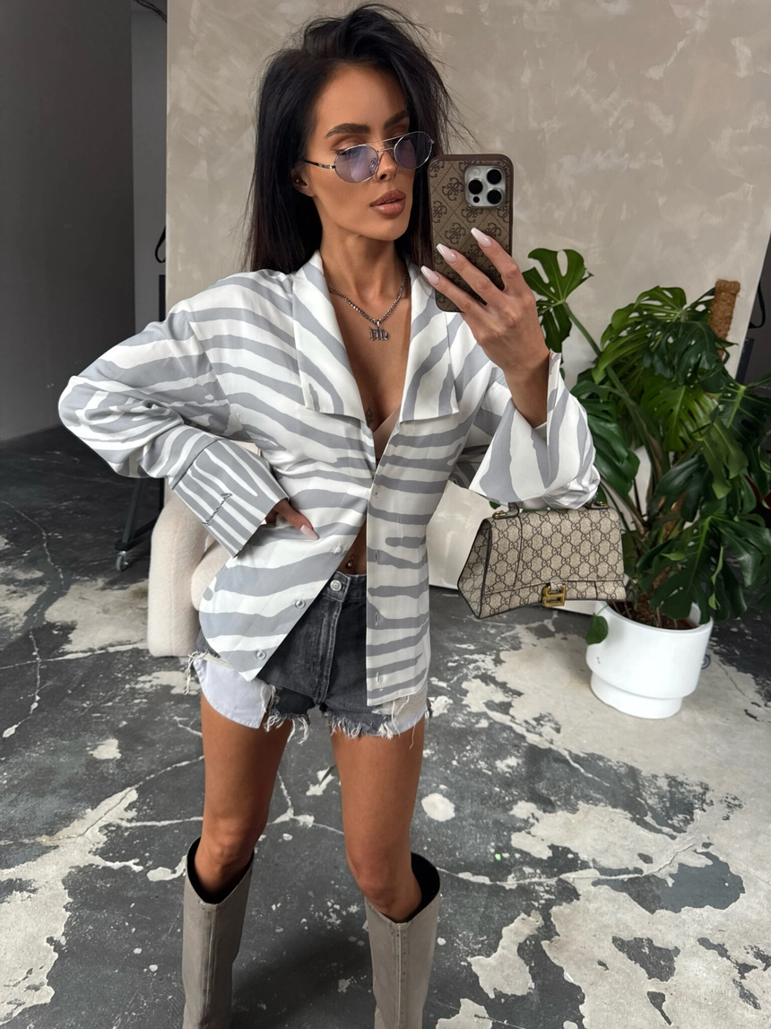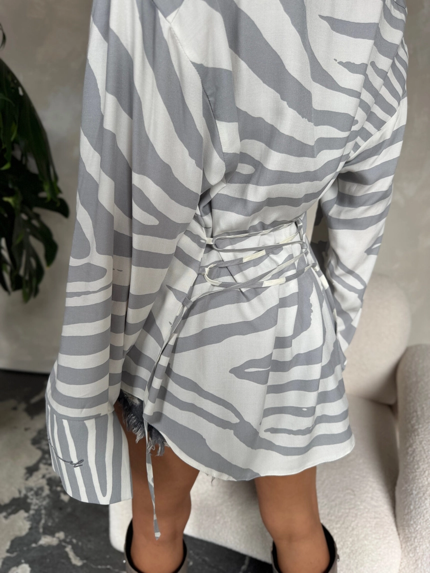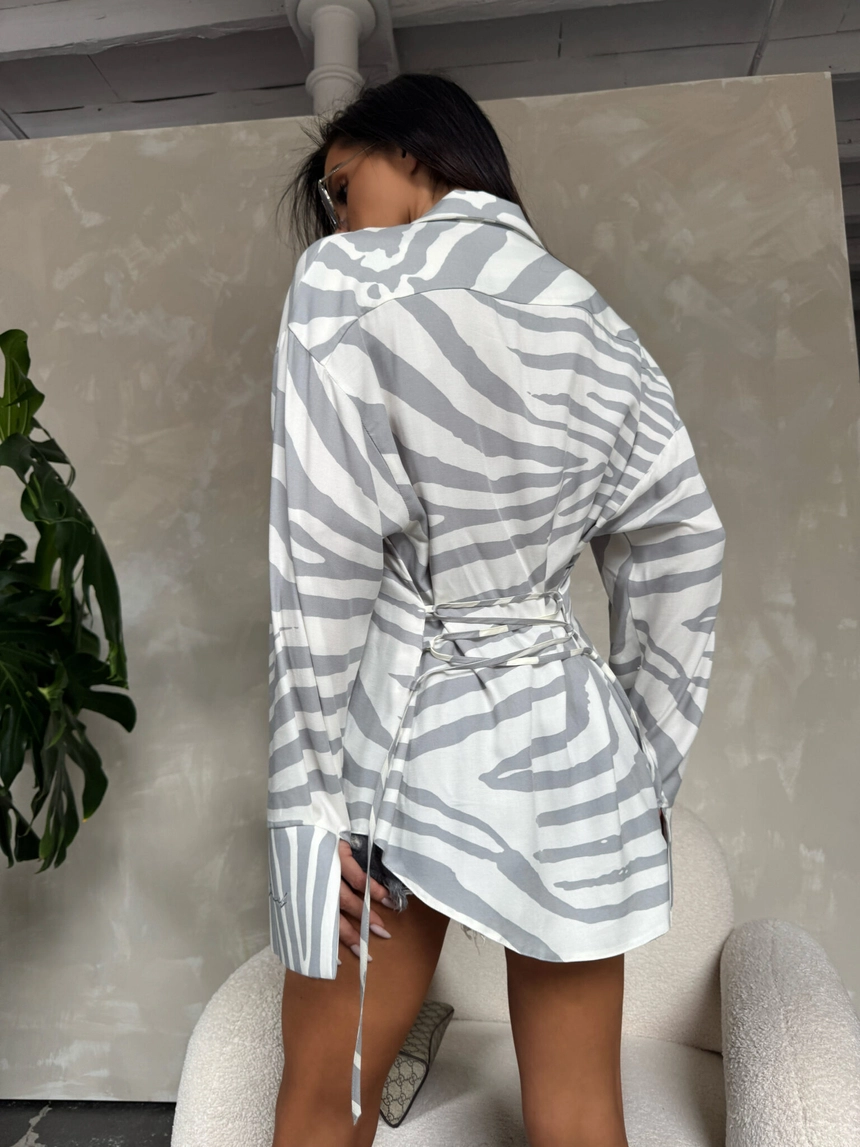 Koszula o luźnym fasonie z efektownym printem w stylu zebry. Model zapinany na guziki z przodu, z szerokimi mankietami i kołnierzem. Z tyłu wszyty pasek z możliwością regulacji, który podkreśla talię. Lekki materiał zapewnia komfort noszenia, a charakterystyczny wzór nadaje całości modowego wyrazu.Skład: 100% wiskoza