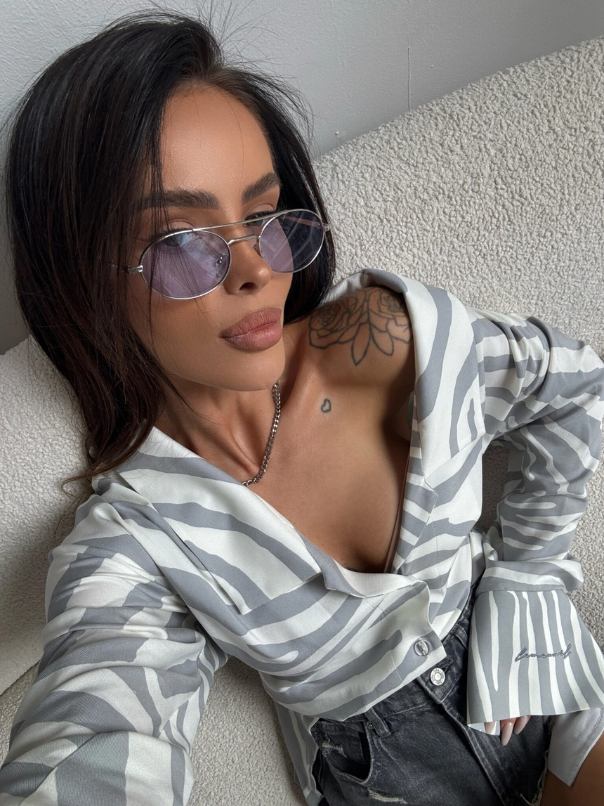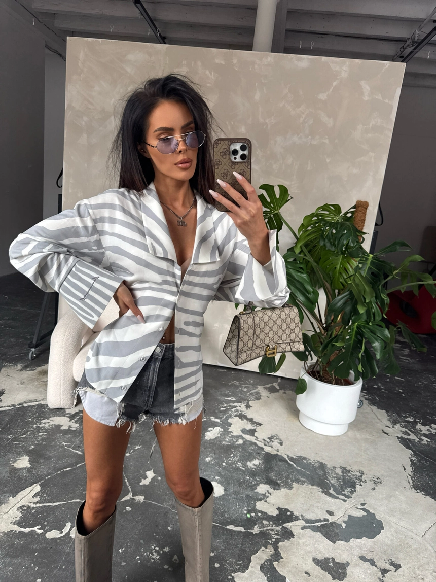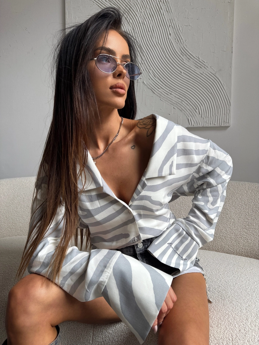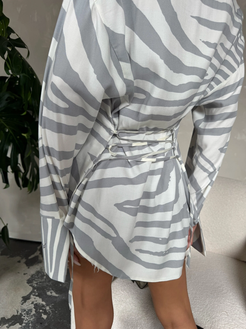 Koszula o luźnym fasonie z efektownym printem w stylu zebry. Model zapinany na guziki z przodu, z szerokimi mankietami i kołnierzem. Z tyłu wszyty pasek z możliwością regulacji, który podkreśla talię. Lekki materiał zapewnia komfort noszenia, a charakterystyczny wzór nadaje całości modowego wyrazu.Skład: 100% wiskoza