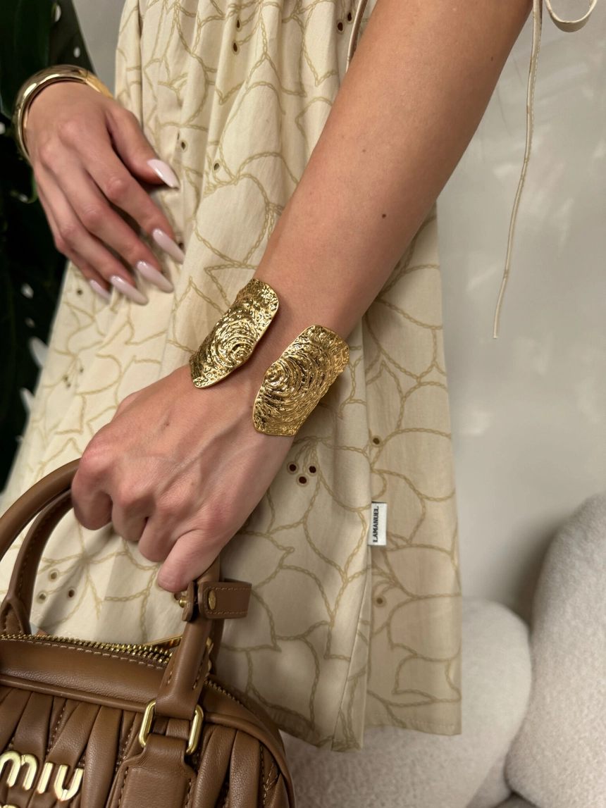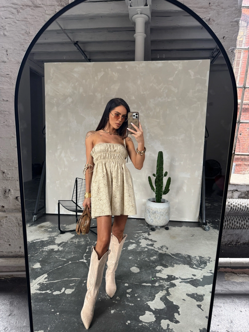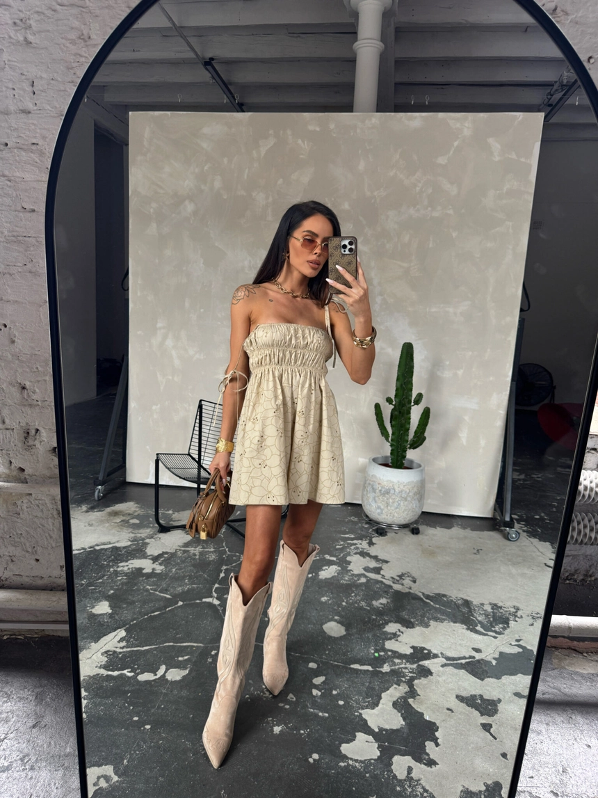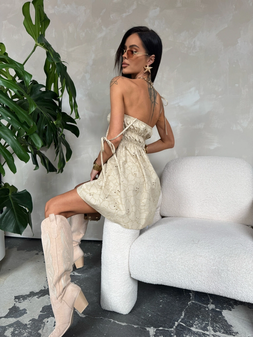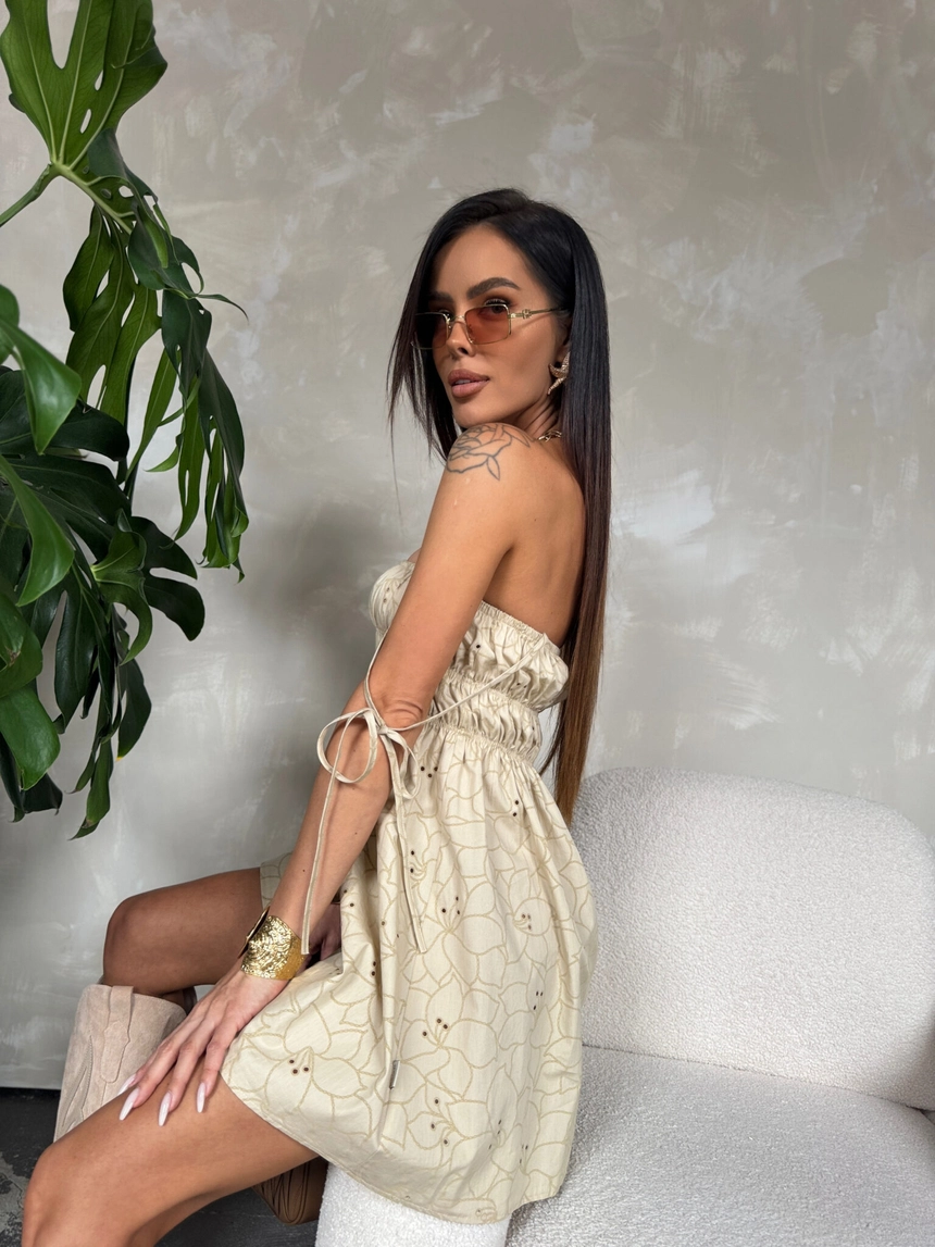 Sukienka mini o rozkloszowanym kroju wykonana z haftowanej tkaniny z ażurowymi detalami. Góra na gumce z ozdobnym marszczeniem oraz cienkimi ramiączkami do wiązania. Lekki materiał i swobodny fason zapewniają komfort noszenia i sprawiają, że model świetnie sprawdza się w letnich stylizacjach.Skład: 100% bawełna