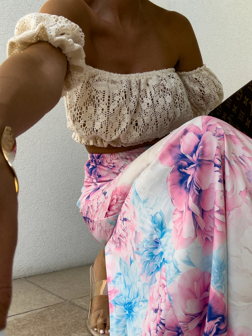 Ażurowa hiszpanka o krótkim kroju to doskonały wybór na ciepłe dni! Jej delikatny, przewiewny materiał sprawia, że jest lekka i komfortowa, idealnie komponując się ze spódnicami i spodniami. Góra bluzki jest wykończona wygodną gumką, która subtelnie dopasowuje się do ciała, zapewniając wygodę noszenia. Gumka przy rękawach dodaje całości uroku, tworząc efektowne, lekko bufiaste rękawy. To propozycja, która łączy elegancję z casualowym stylem, doskonale pasująca do wielu letnich stylizacji.