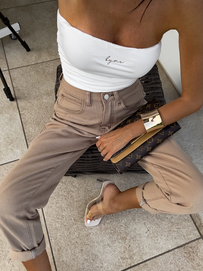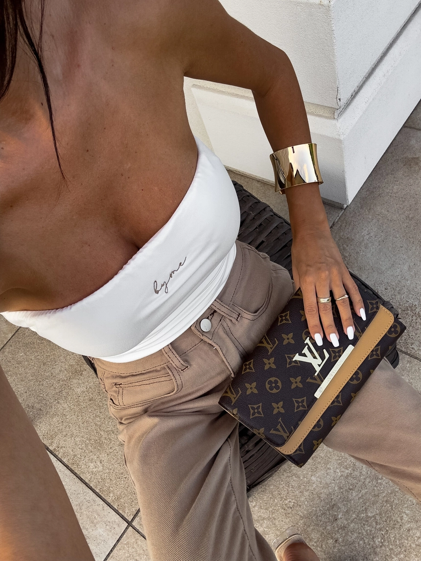 Top logowany bez ramiączek to idealna baza do wielu stylizacji – od codziennych po wieczorowe. Wykonany z elastycznego, idealnie dopasowującego się materiału, gwarantuje komfort noszenia i świetne dopasowanie do sylwetki. Top posiada podwójną warstwę materiału, co zapewnia lepsze krycie i trwałość, a subtelne marszczenia po bokach i z tyłu dodają mu charakteru i delikatnie modelują figurę. Uniwersalny krój sprawia, że będzie świetnie wyglądać zarówno solo, jak i w połączeniu z marynarką czy oversize'ową koszulą.