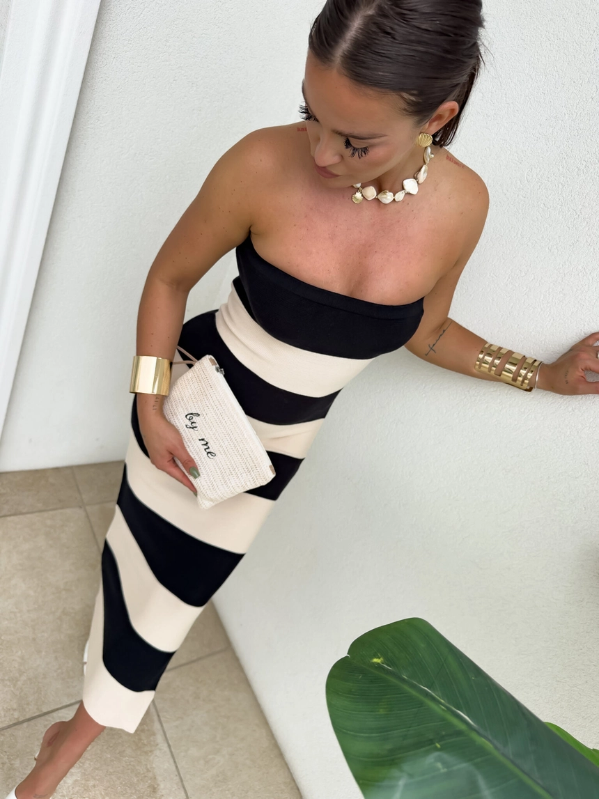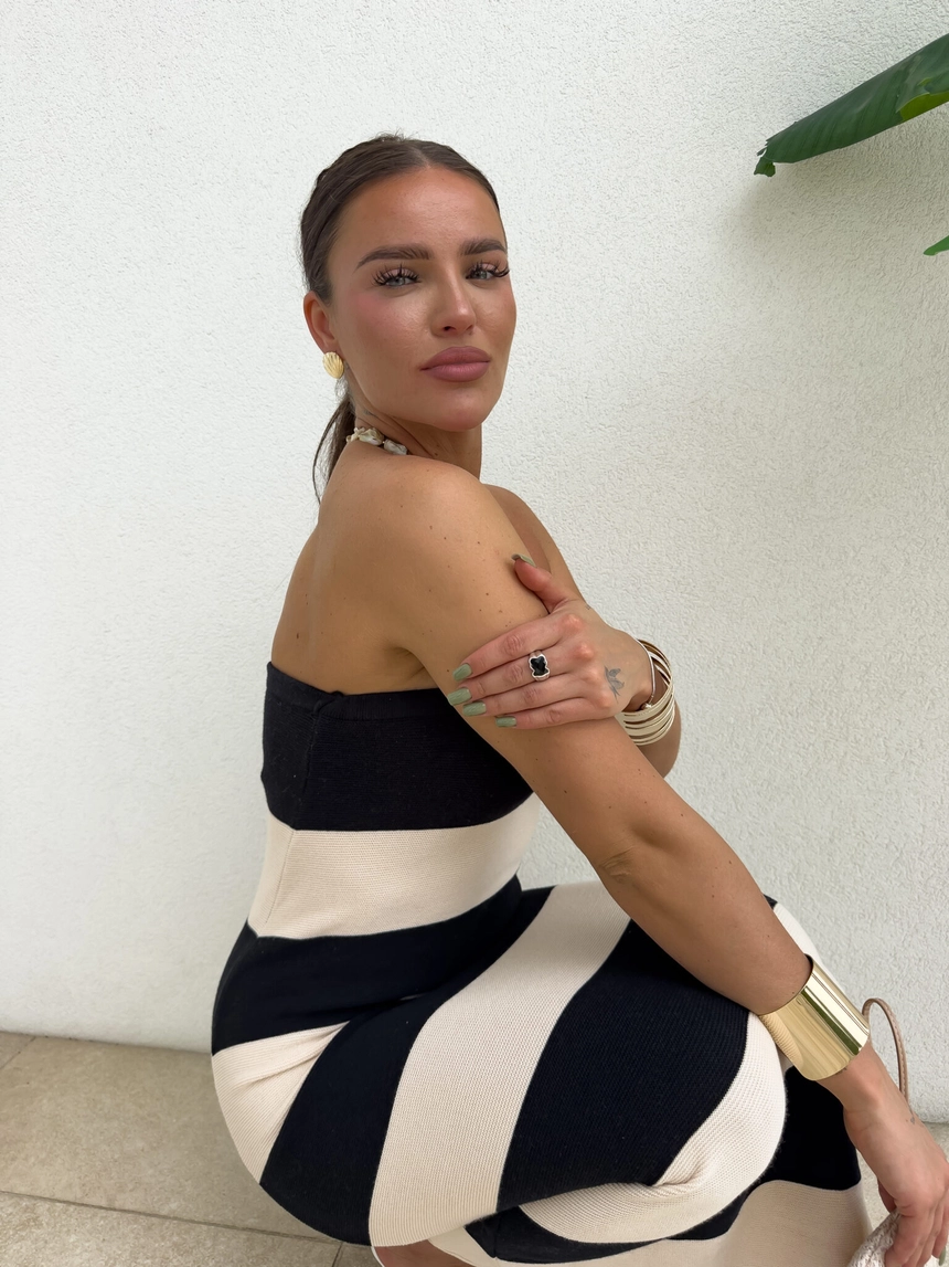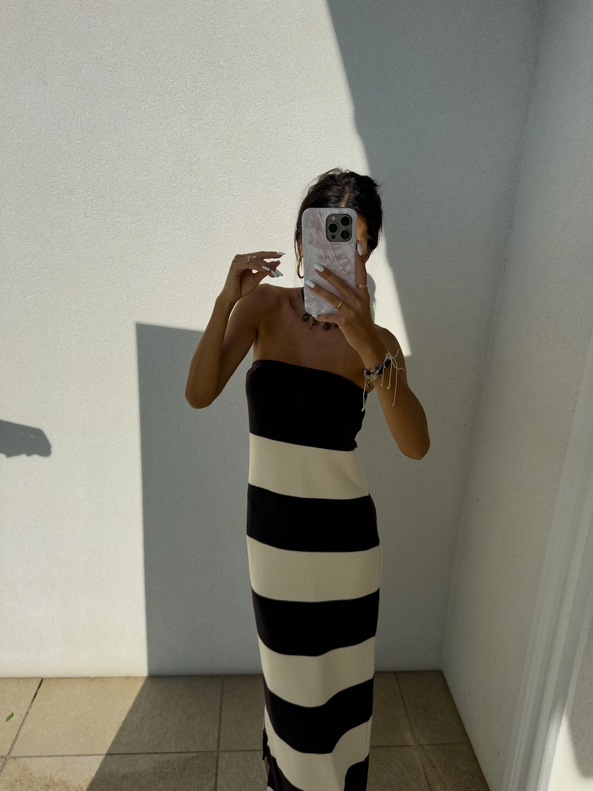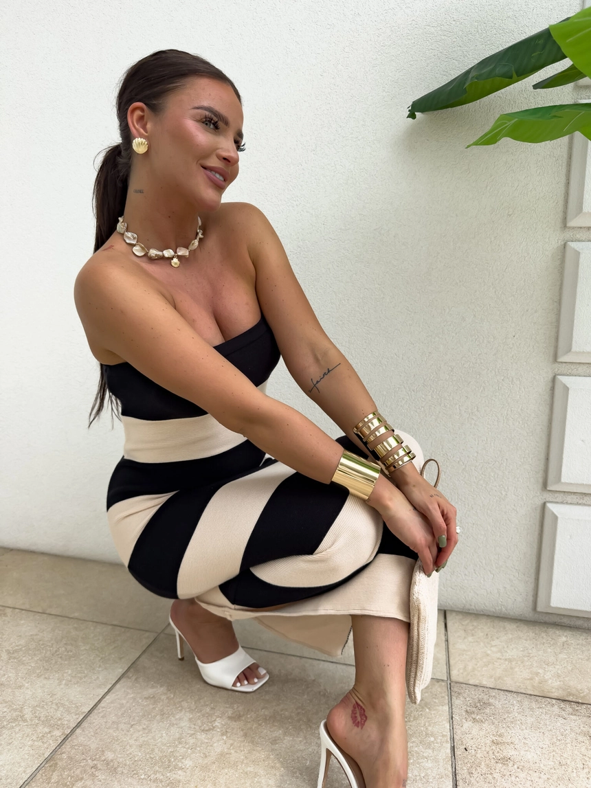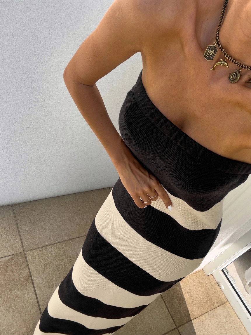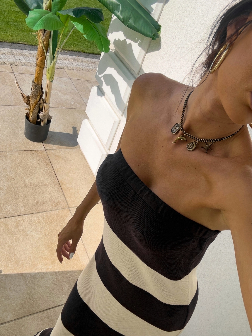Zmysłowa i kobieca sukienka maxi z odkrytymi ramionami to idealny wybór na wyjątkowe okazje. Wykonana z lekkiego, zwiewnego materiału, subtelnie opływa sylwetkę, podkreślając jej atuty. Dekolt wykończony elastyczną gumką zapewnia wygodę noszenia i doskonałe dopasowanie, a rozcięcie z boku dodaje stylizacji nuty zmysłowości i lekkości. Uwagę przyciąga przepiękny, odpinany kwiat, który możesz dowolnie stylizować – noś go na sukience, wpięty we włosy lub przy torebce. Idealna na specjalne okazje, romantyczne kolacje czy letnie przyjęcia.