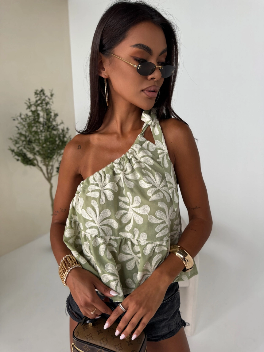 Top o kobiecym, letnim fasonie na jedno ramię, z efektownym wiązaniem na ramieniu. Uszyty z lekkiego, przewiewnego materiału ozdobionego wyrazistym, haftowanym wzorem roślinnym. Luźny krój zapewnia swobodę ruchów, a delikatne marszczenie przy dekolcie i dole dodaje całości lekkości i objętości. Idealny na wakacyjne dni i letnie stylizacje.Skład: 100% poliester