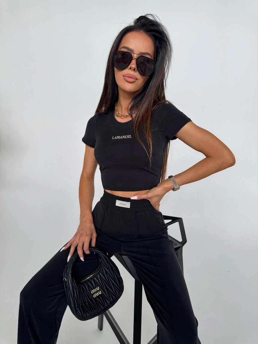 Top z krótkim rękawem wykonany z miękkiej, elastycznej dzianiny bawełnianej o lekko spranej fakturze. Krój dopasowany, długość crop – idealna do zestawienia z wysokim stanem. Na środku klatki piersiowej subtelne logo LAMANUEL. Minimalistyczny fason sprawdzi się zarówno w codziennych stylizacjach, jak i w sportowym wydaniu. Przyjemny w dotyku materiał gwarantuje komfort noszenia.Skład: 53% lyocell 38% poliester 9% spandex