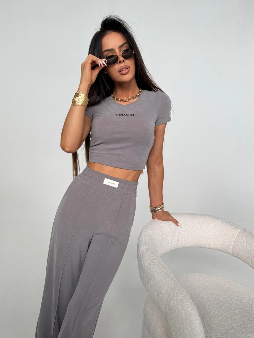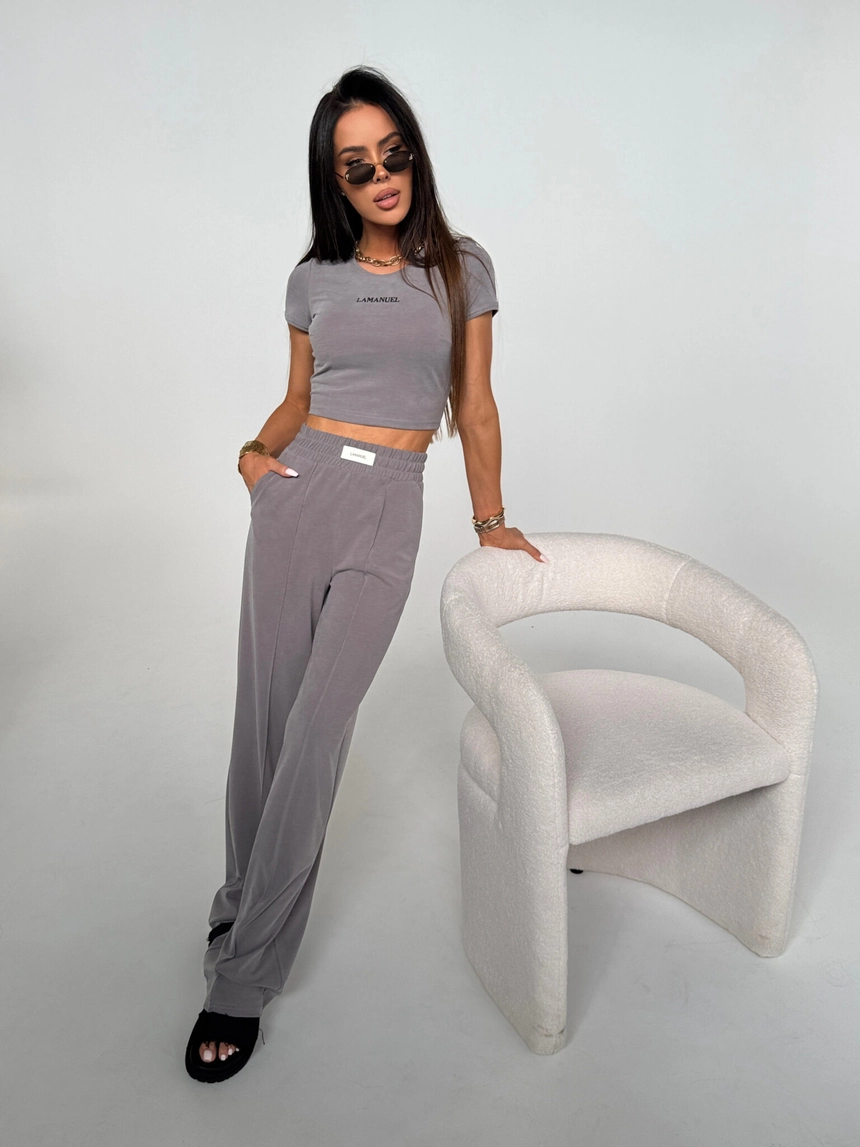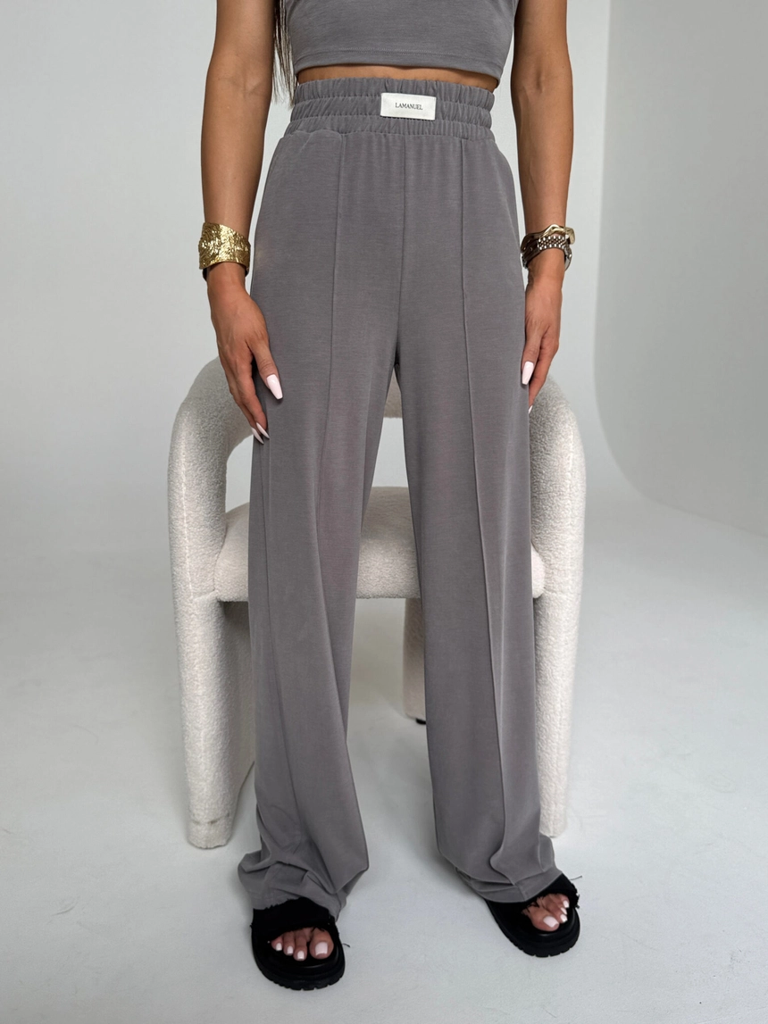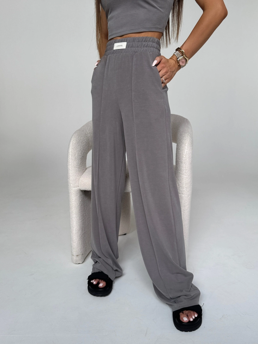 Spodnie dresowe z szeroką nogawką uszyte z miękkiej, lejącej dzianiny o aksamitnym wykończeniu. Wysoki stan z elastyczną gumką w pasie zapewnia wygodę i dopasowanie do sylwetki. Z przodu estetyczny szew optycznie wysmuklający nogi oraz wszyta metka z logo LAMANUEL. Spodnie mają boczne kieszenie i swobodny krój, który łączy luz z elegancją. Idealne w zestawie z topem lub w połączeniu z klasycznymi elementami garderoby.Skład: 53% lyocell 38% poliester 9% spandex