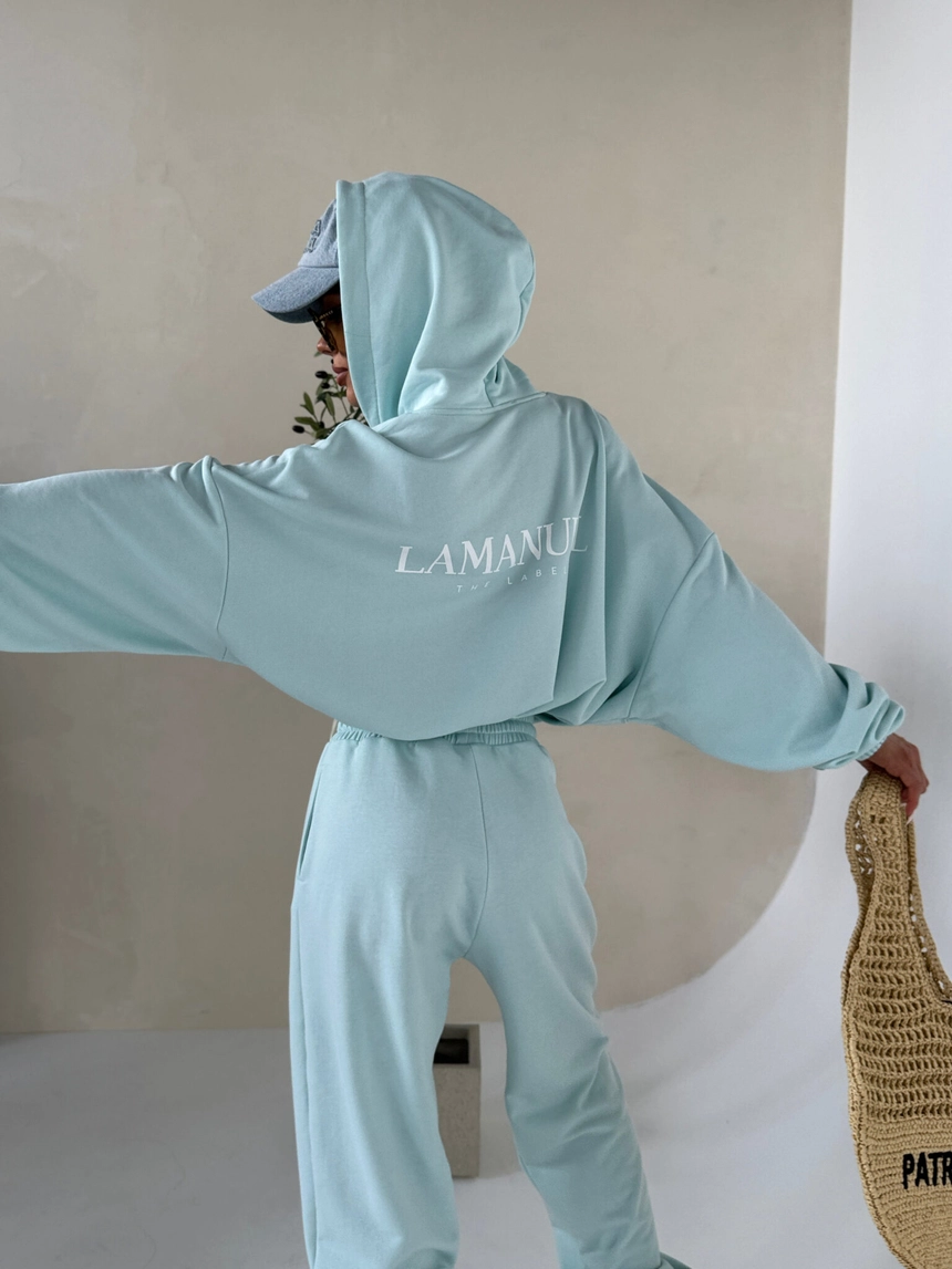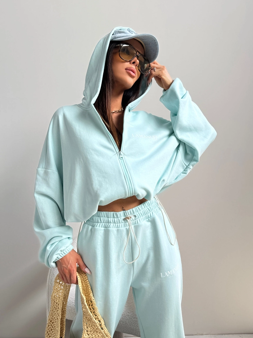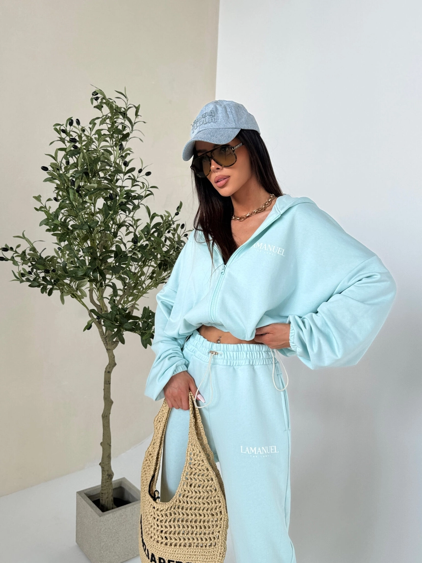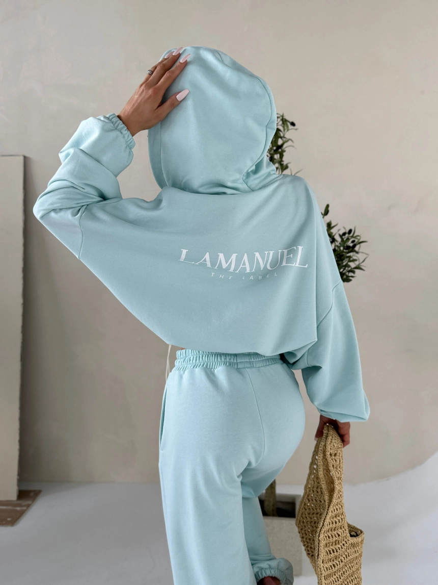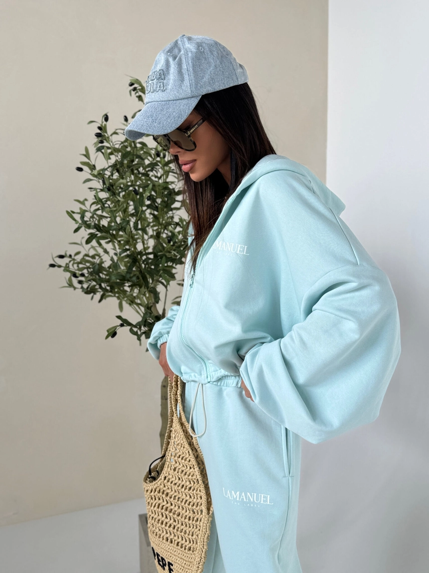 Bluza o luźnym kroju zapinana na suwak z kapturem i wszytym ściągaczem na dole, który umożliwia regulację szerokości i podkreślenie talii. Rękawy szerokie, zakończone delikatną gumką. Na piersi oraz na plecach znajduje się wyraziste logo LAMANUEL, które nadaje całości charakteru. Model wykonany z miękkiej, przyjemnej w dotyku dzianiny, idealny na co dzień i w podróży. Połącz je ze spodniami CLOUDY, aby mieć stylizację w całości. Bluza pasuje od rozmiaru XS do XL.Skład: 90% bawełna 10% poliester