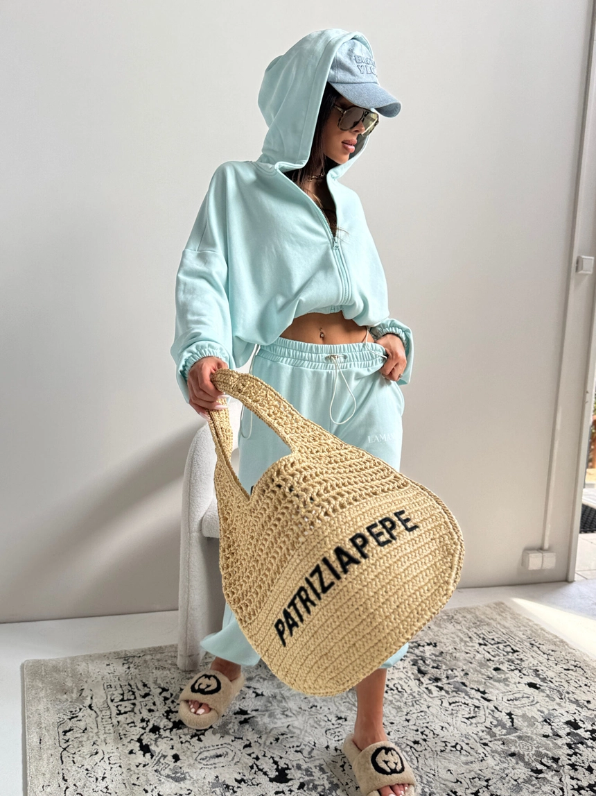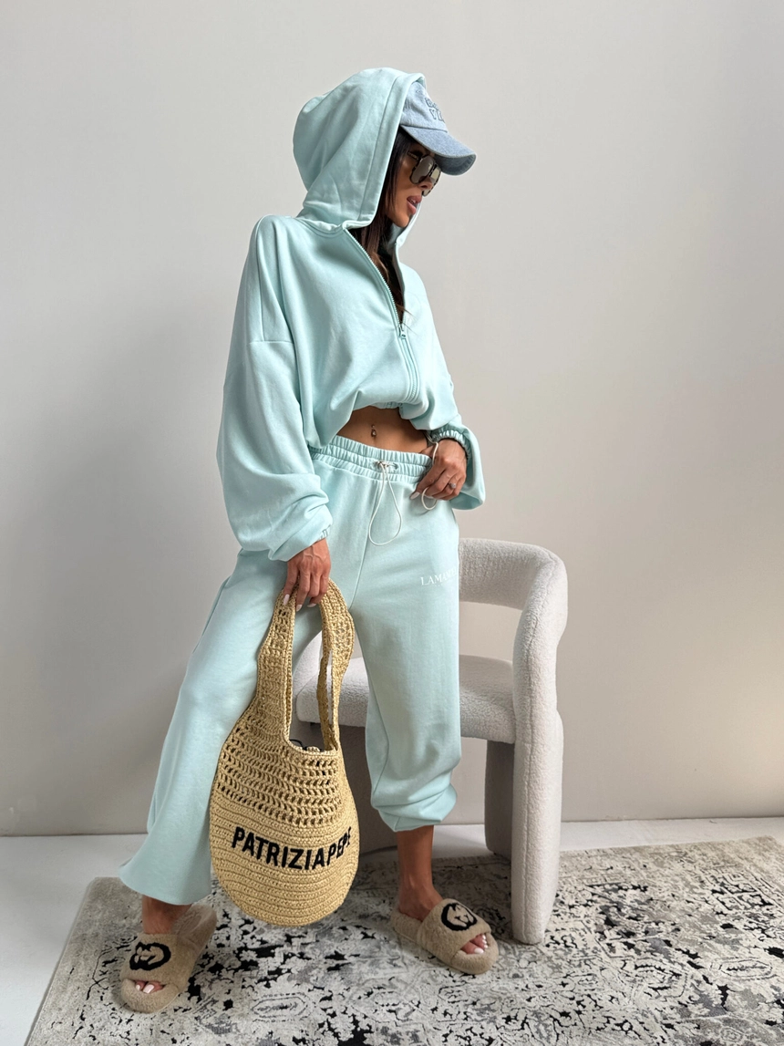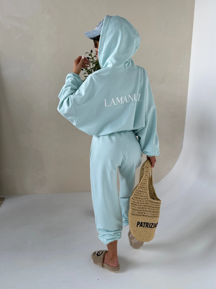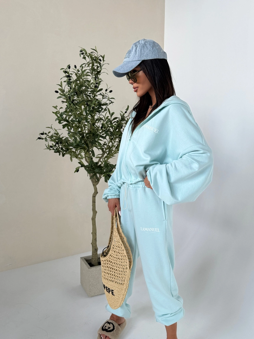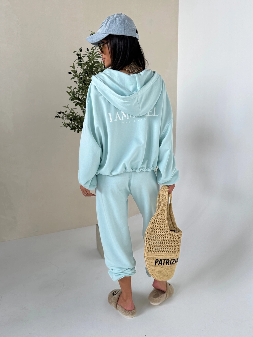Bluza o luźnym kroju zapinana na suwak z kapturem i wszytym ściągaczem na dole, który umożliwia regulację szerokości i podkreślenie talii. Rękawy szerokie, zakończone delikatną gumką. Na piersi oraz na plecach znajduje się wyraziste logo LAMANUEL, które nadaje całości charakteru. Model wykonany z miękkiej, przyjemnej w dotyku dzianiny, idealny na co dzień i w podróży. Połącz je ze spodniami CLOUDY, aby mieć stylizację w całości. Bluza pasuje od rozmiaru XS do XL.Skład: 90% bawełna 10% poliester