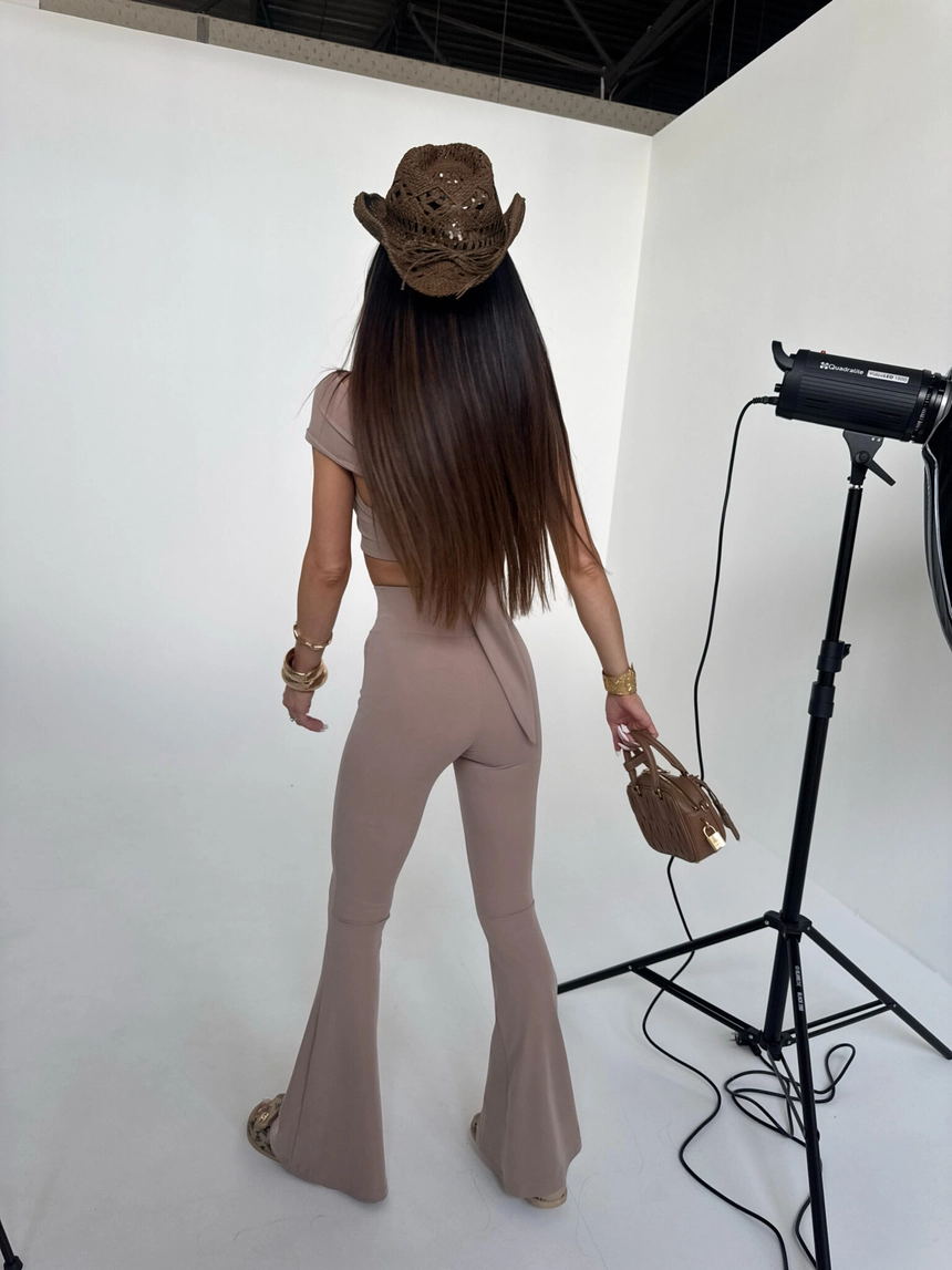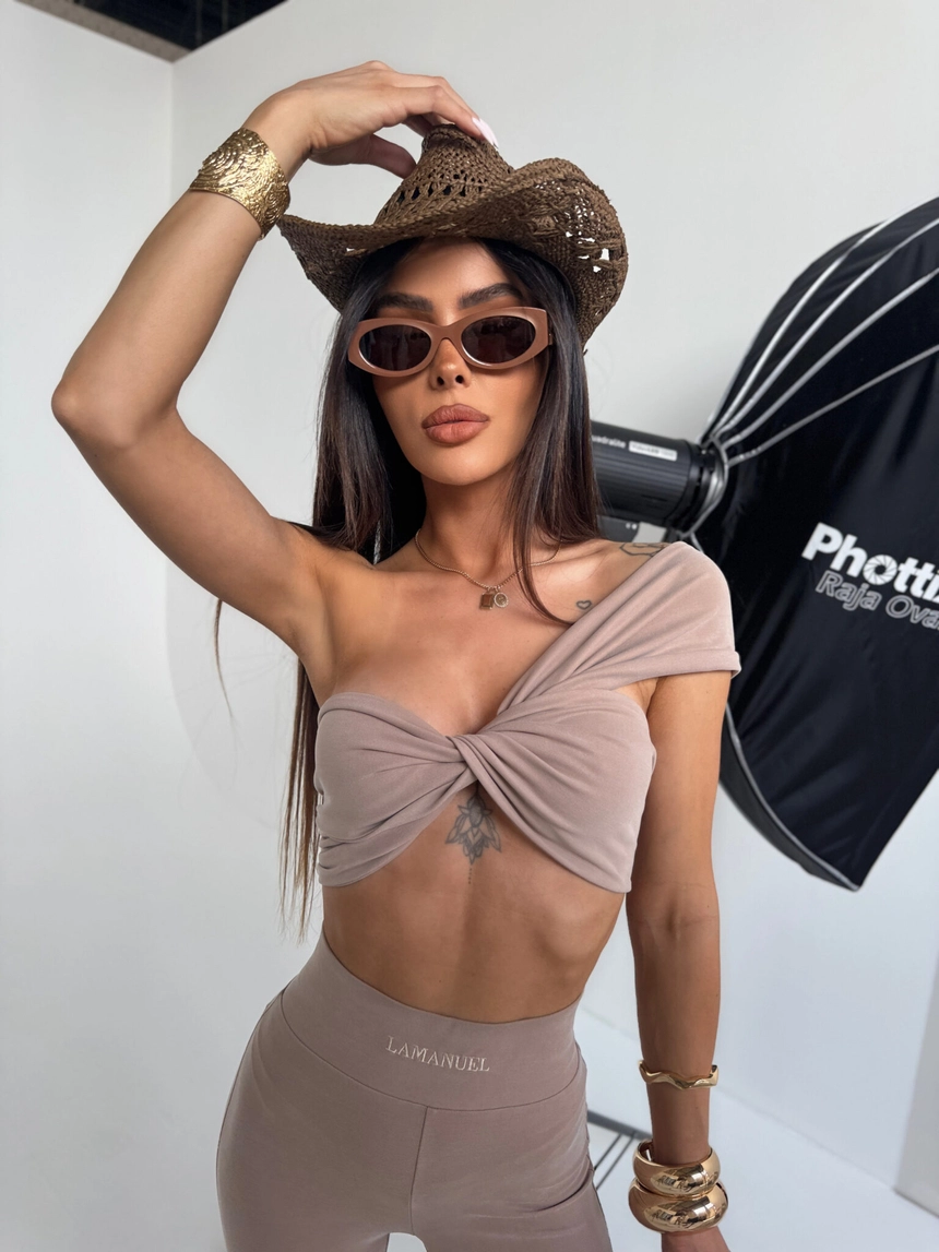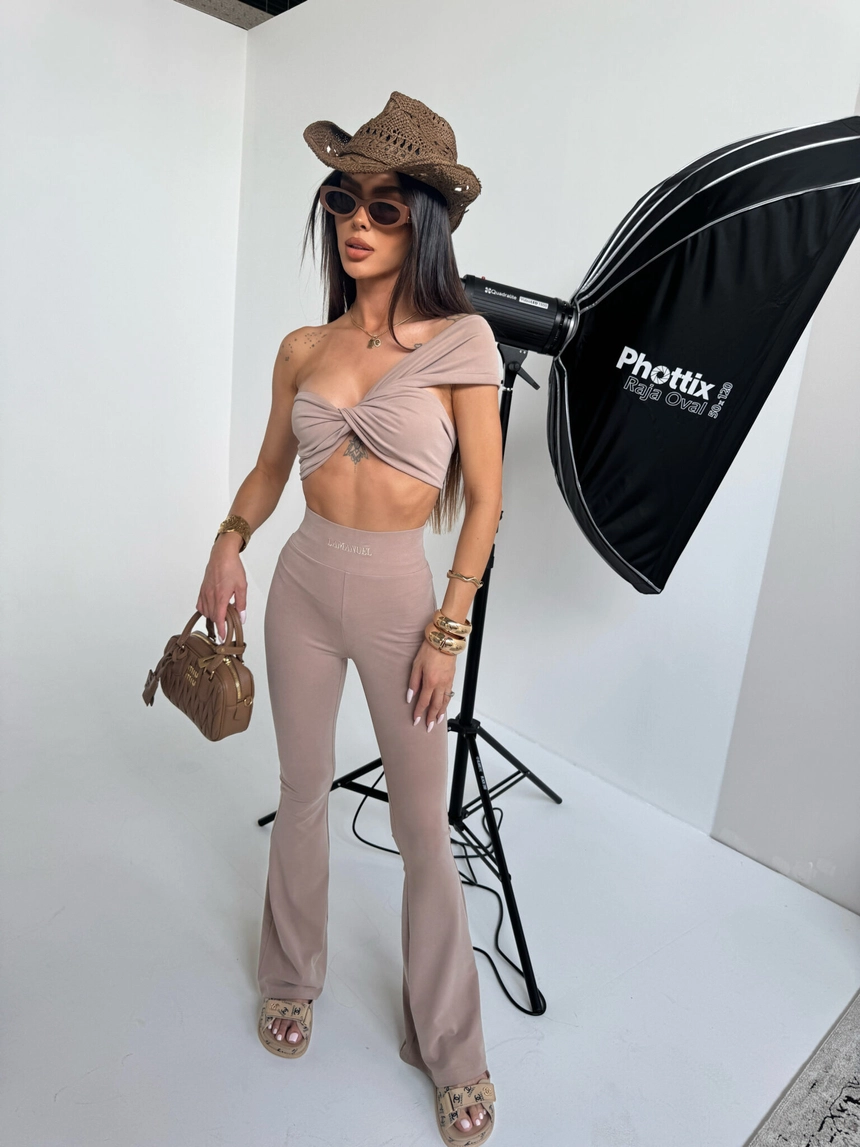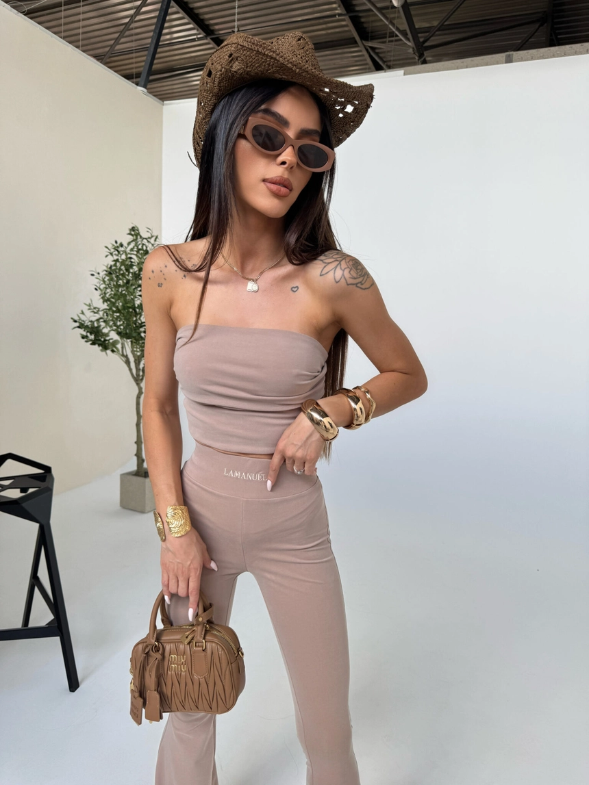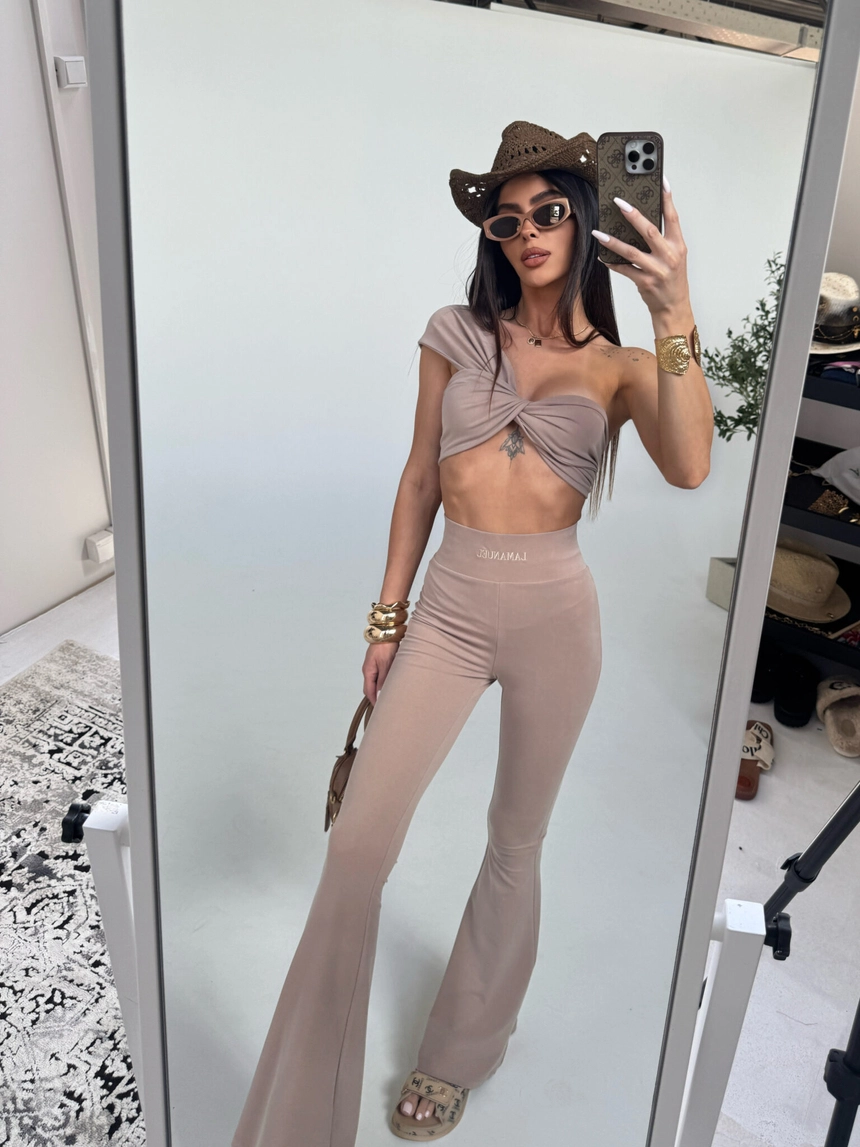 Komplet z miękkiej, elastycznej dzianiny o dopasowanym kroju, który pięknie podkreśla sylwetkę. Wysokie w pasie legginsy z szerokim pasem modelującym talię oraz rozszerzaną nogawką, ozdobione subtelnym logo LAMANUEL z przodu. Komfortowe i przyjemne w noszeniu, idealne zarówno do stylizacji miejskich, jak i na wakacyjny wyjazd. Do kompletu dołączona jest opaska typu multiway – szeroka, wiązana taśma, którą można stylizować na wiele sposobów. Może pełnić funkcję topu bandeau, wiązanego na szyi, skrzyżowanego biustonosza i asymetrycznego topu. Elastyczny materiał umożliwia łatwe dopasowanie do sylwetki, a uniwersalność formy pozwala tworzyć różnorodne stylizacje za pomocą jednego elementu.Skład: 53% lyocell 38% poliester 9% spandex