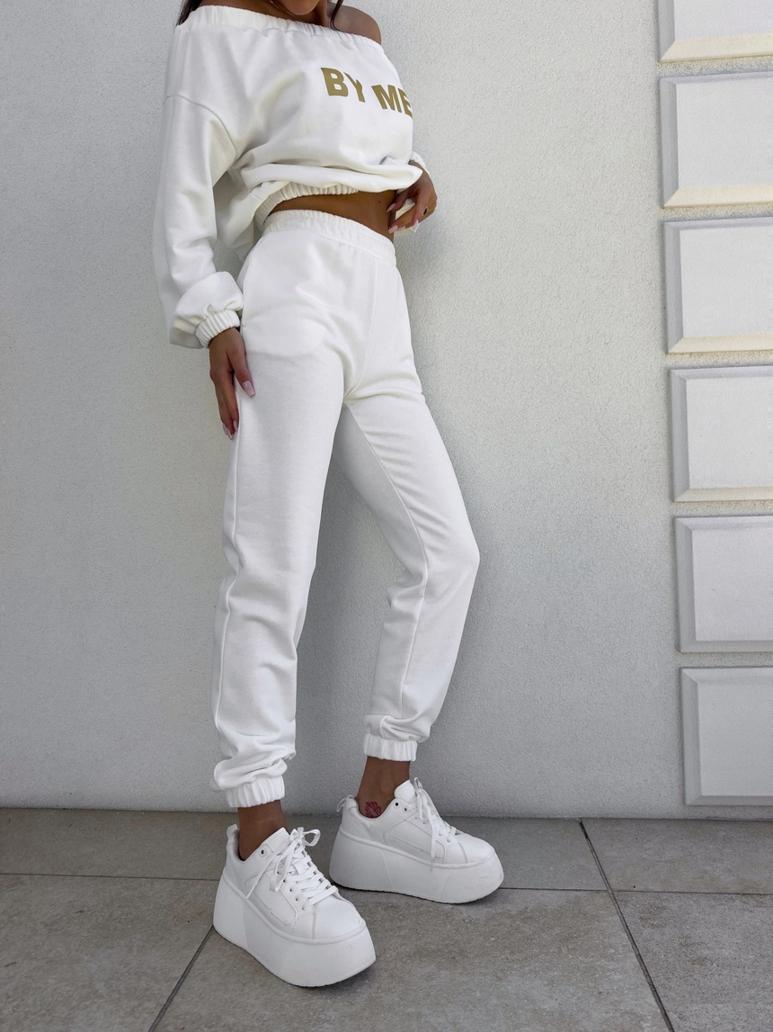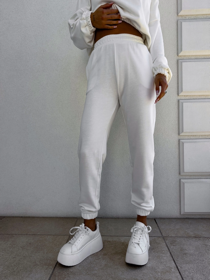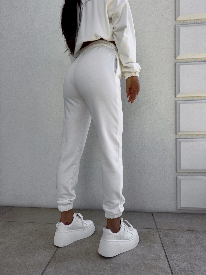 Spodnie dresowe – dopasowane, z elastycznym pasem w talii i ściągaczami na dole nogawek. Ich krój podkreśla sylwetkę, zachowując jednocześnie pełną swobodę ruchów.