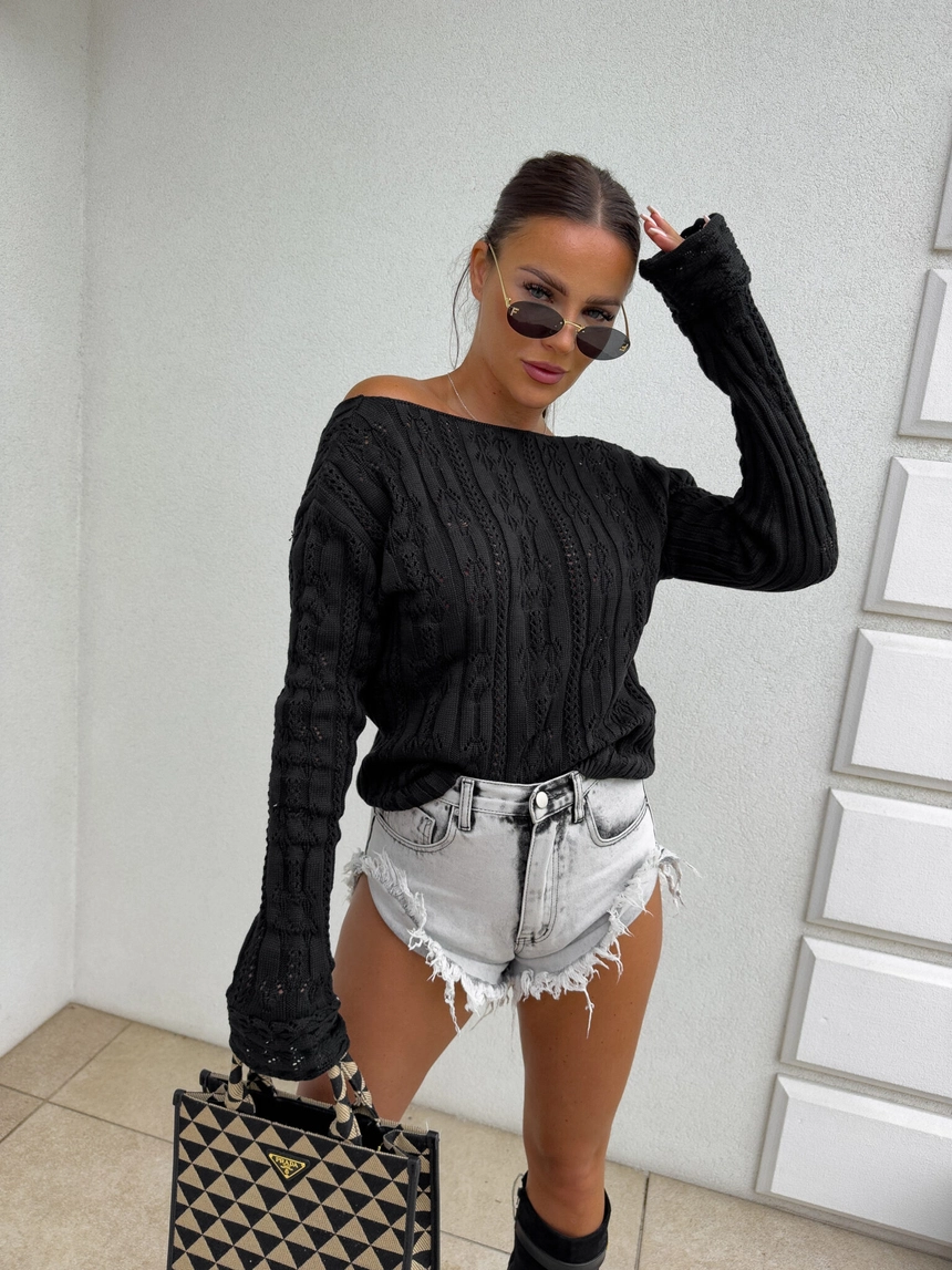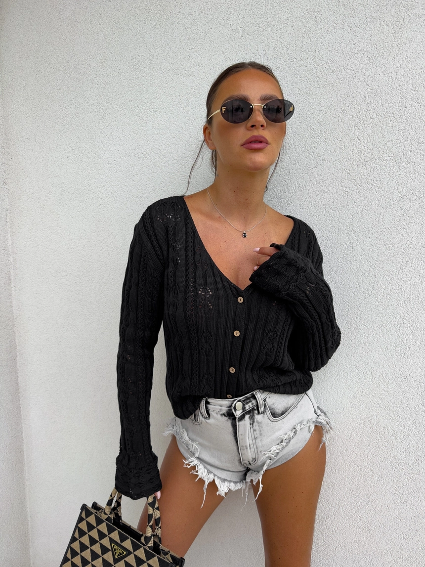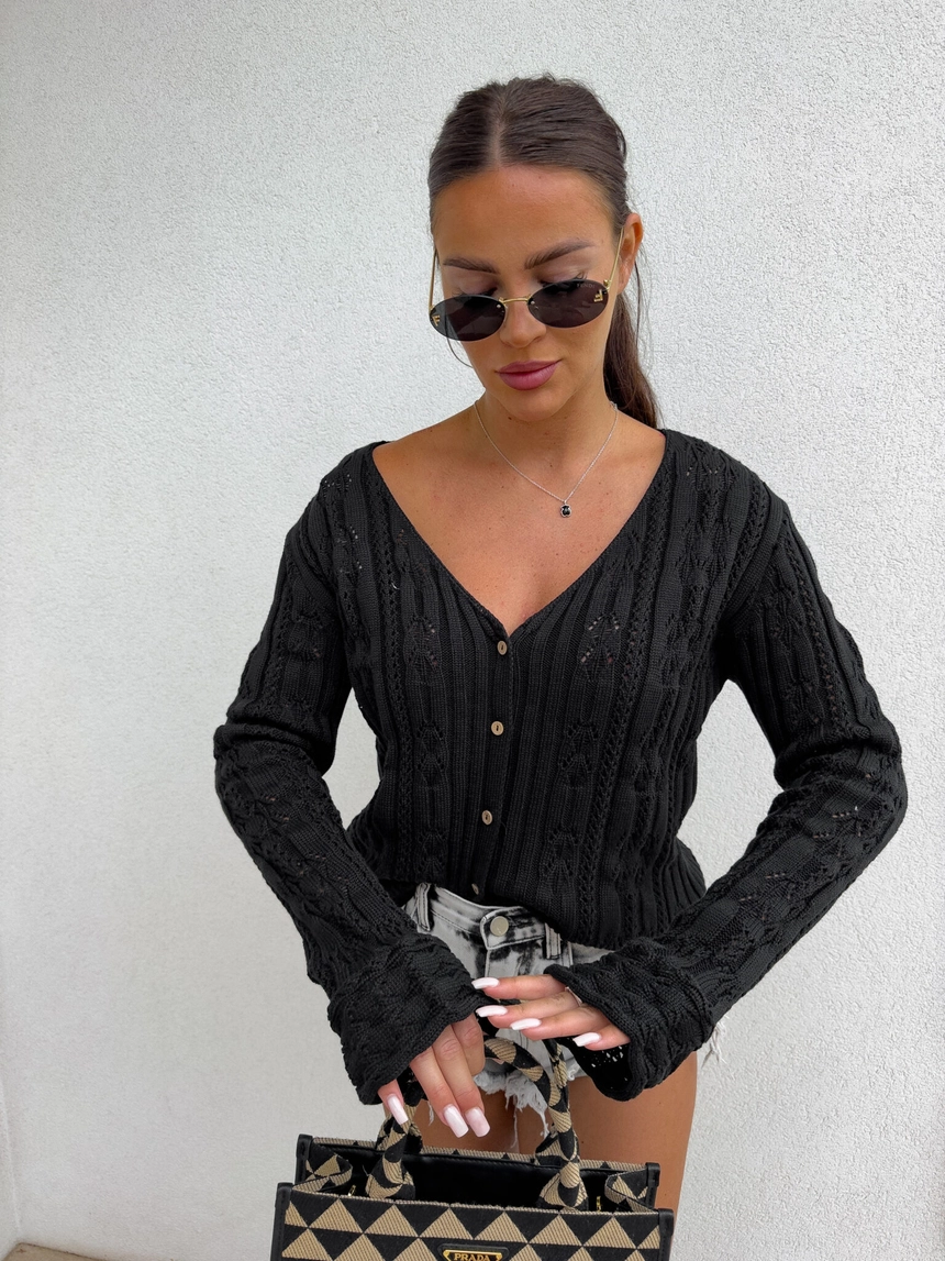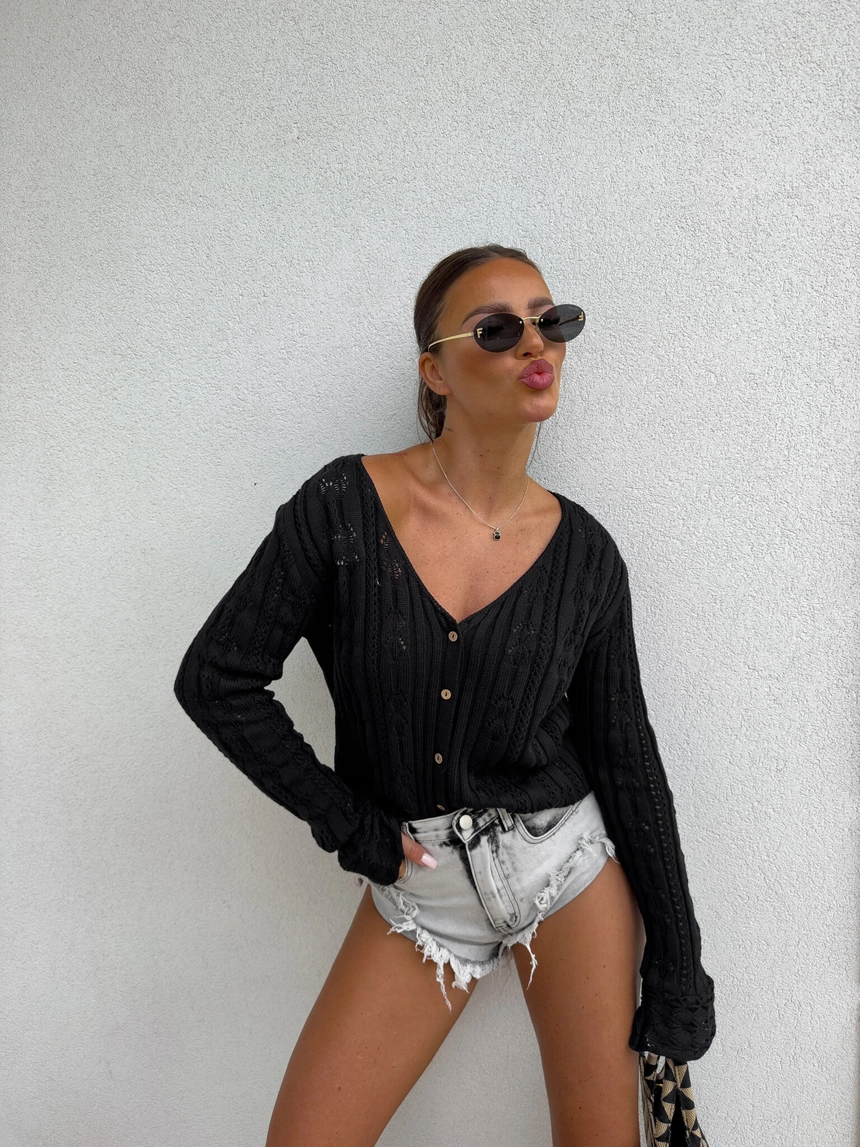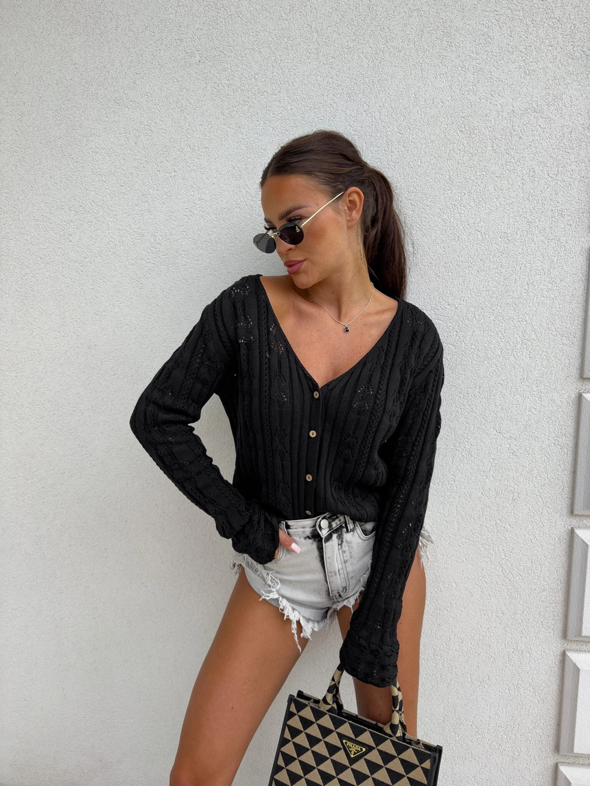 Ażurowy sweter z długim rękawem i dekoltem w serek. Wykonany jest z dzianiny o widocznym, strukturalnym splocie z delikatnymi ażurami, które nadają mu lekkości i kobiecego charakteru. Sweter zapinany jest na małe, drewniane guziki. Luźny krój oraz miękki materiał zapewniają komfort noszenia, a głęboki dekolt dodaje całości subtelnej zmysłowości. To doskonały element garderoby na wiosnę lub chłodniejsze letnie wieczory.