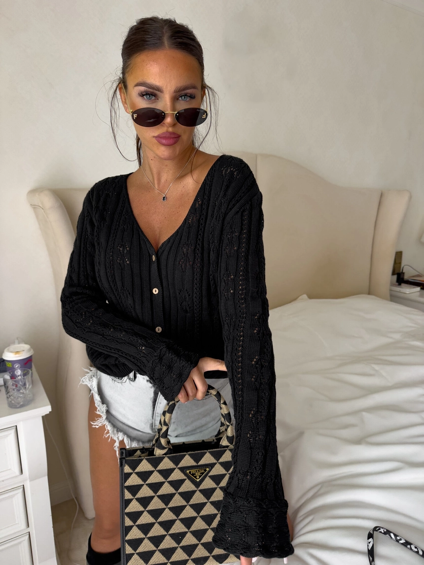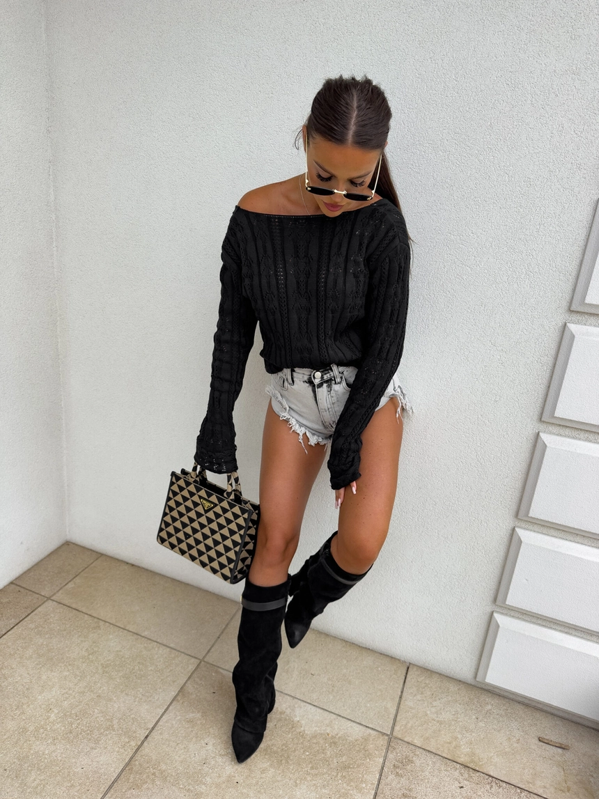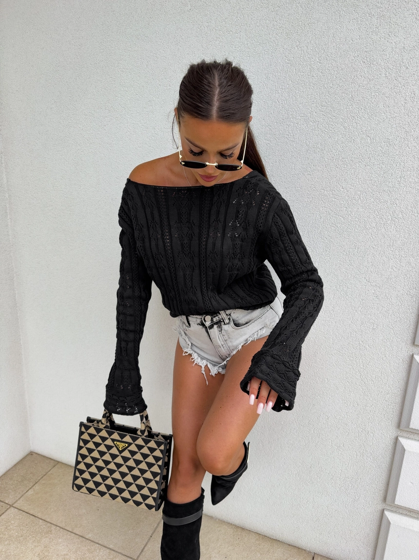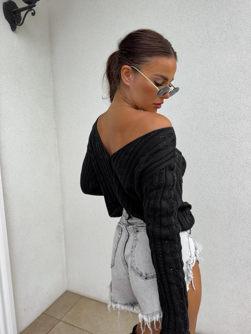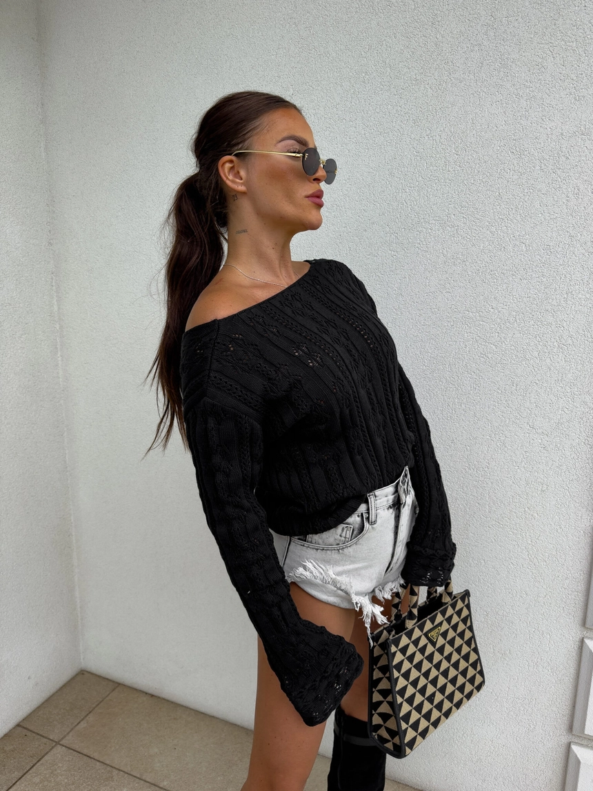 Ażurowy sweter z długim rękawem i dekoltem w serek. Wykonany jest z dzianiny o widocznym, strukturalnym splocie z delikatnymi ażurami, które nadają mu lekkości i kobiecego charakteru. Sweter zapinany jest na małe, drewniane guziki. Luźny krój oraz miękki materiał zapewniają komfort noszenia, a głęboki dekolt dodaje całości subtelnej zmysłowości. To doskonały element garderoby na wiosnę lub chłodniejsze letnie wieczory.