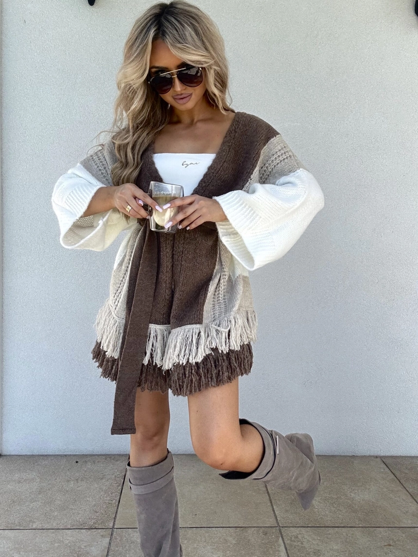 Podkreśl swój styl z kardiganem Oriana. Kardigan ma luźny, otwarty fason, a talię można podkreślić dołączonym paskiem, dzięki czemu sylwetka nabiera kobiecego kształtu. Dół kardiganu ozdobiony frędzlami, które nadają mu lekkości i boho charakteru.
