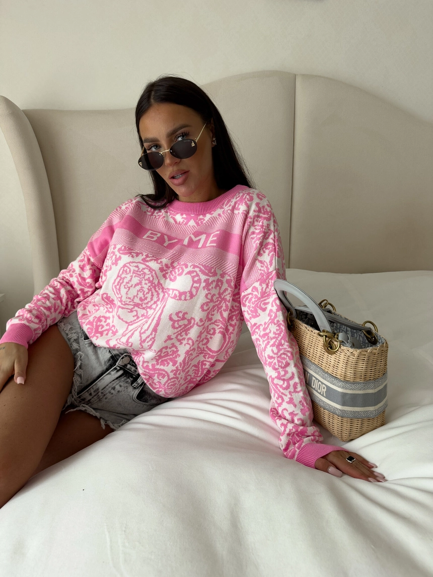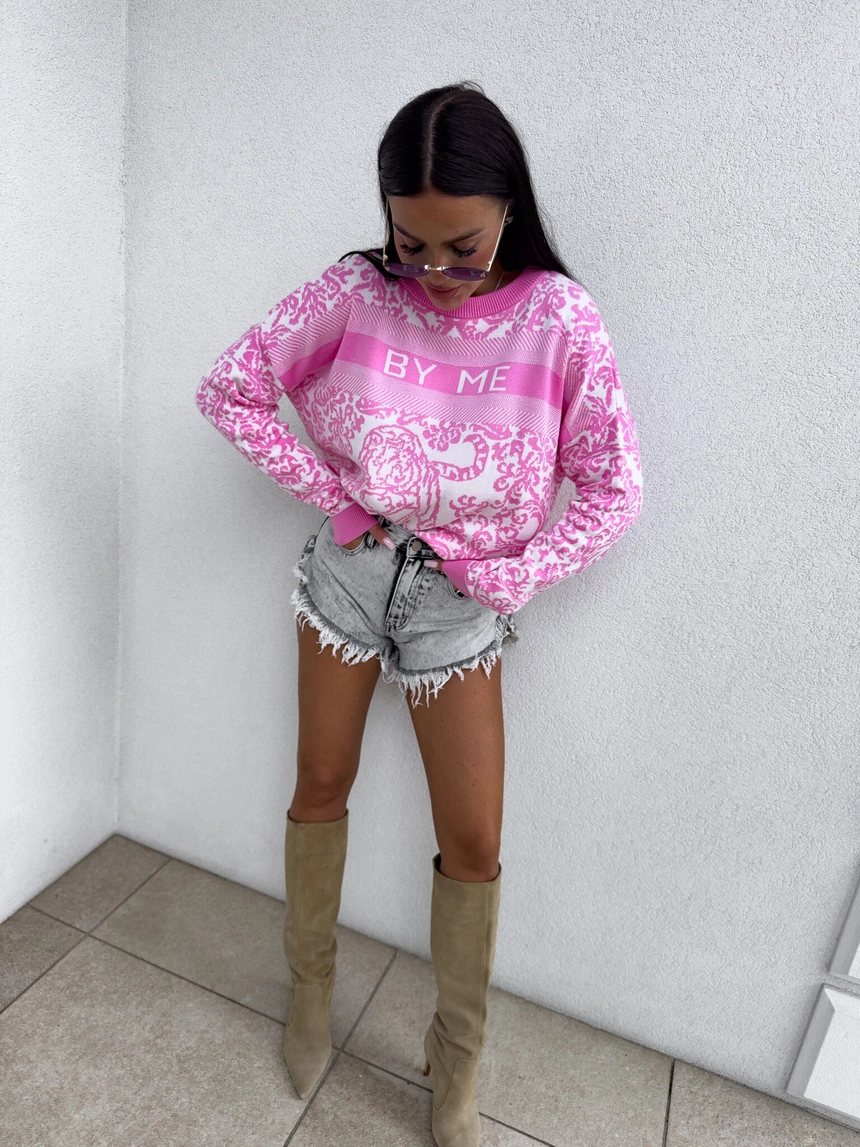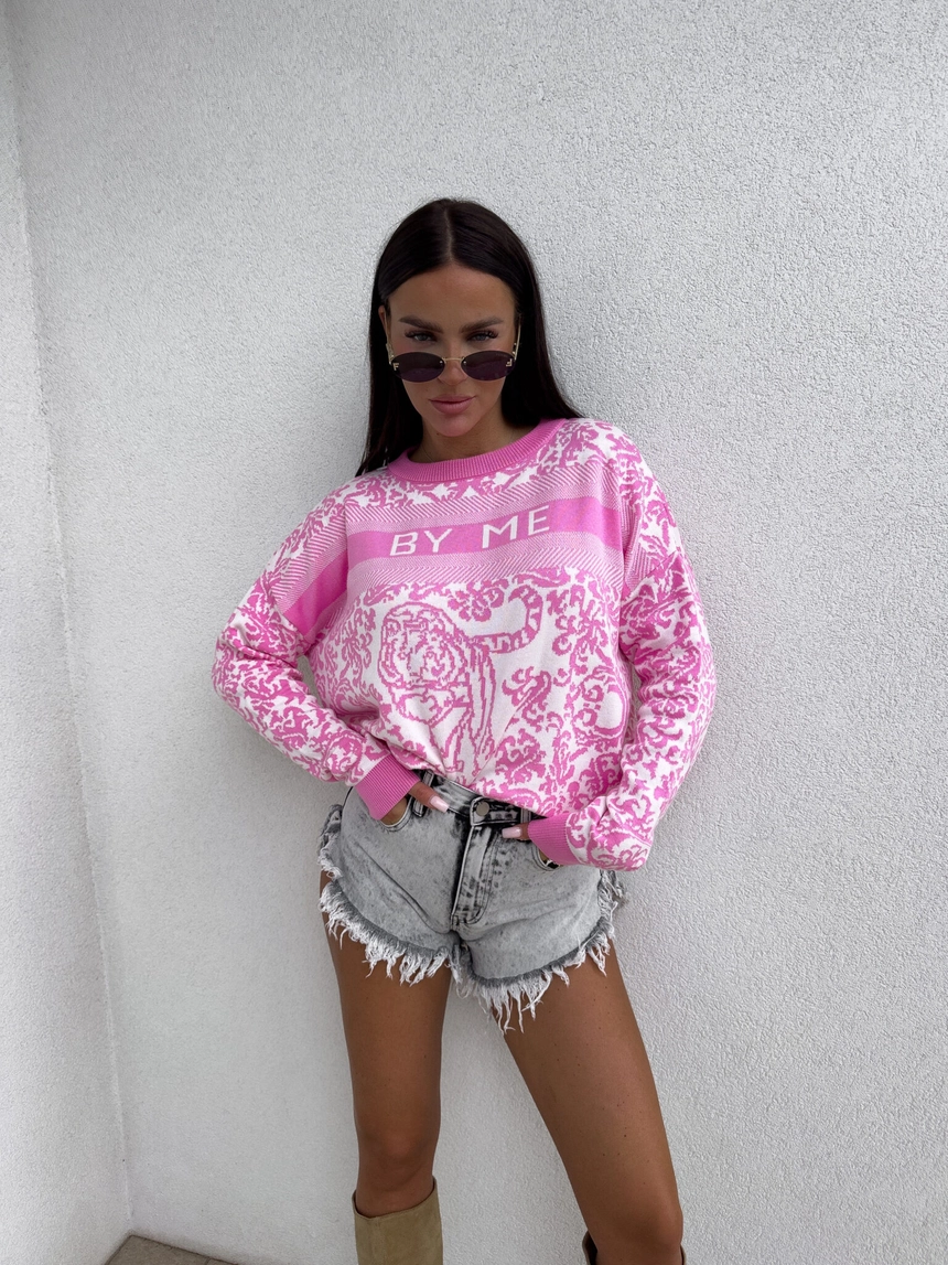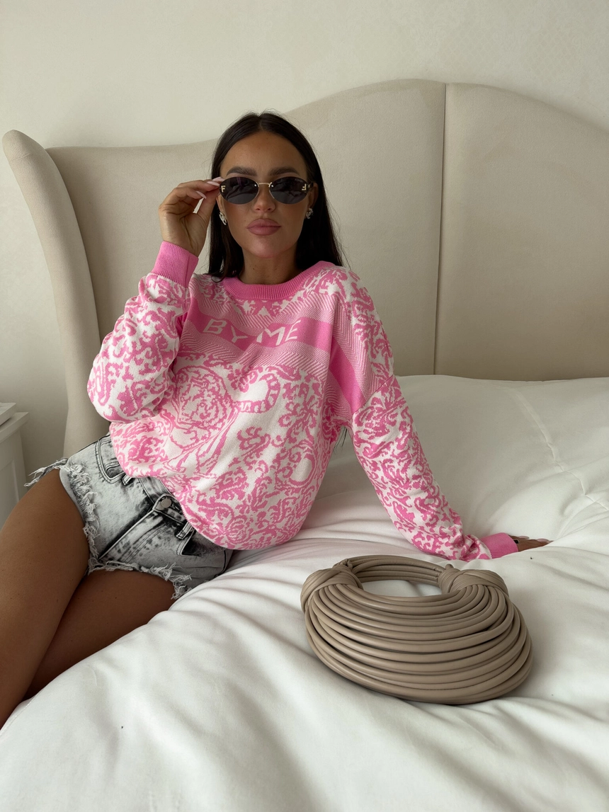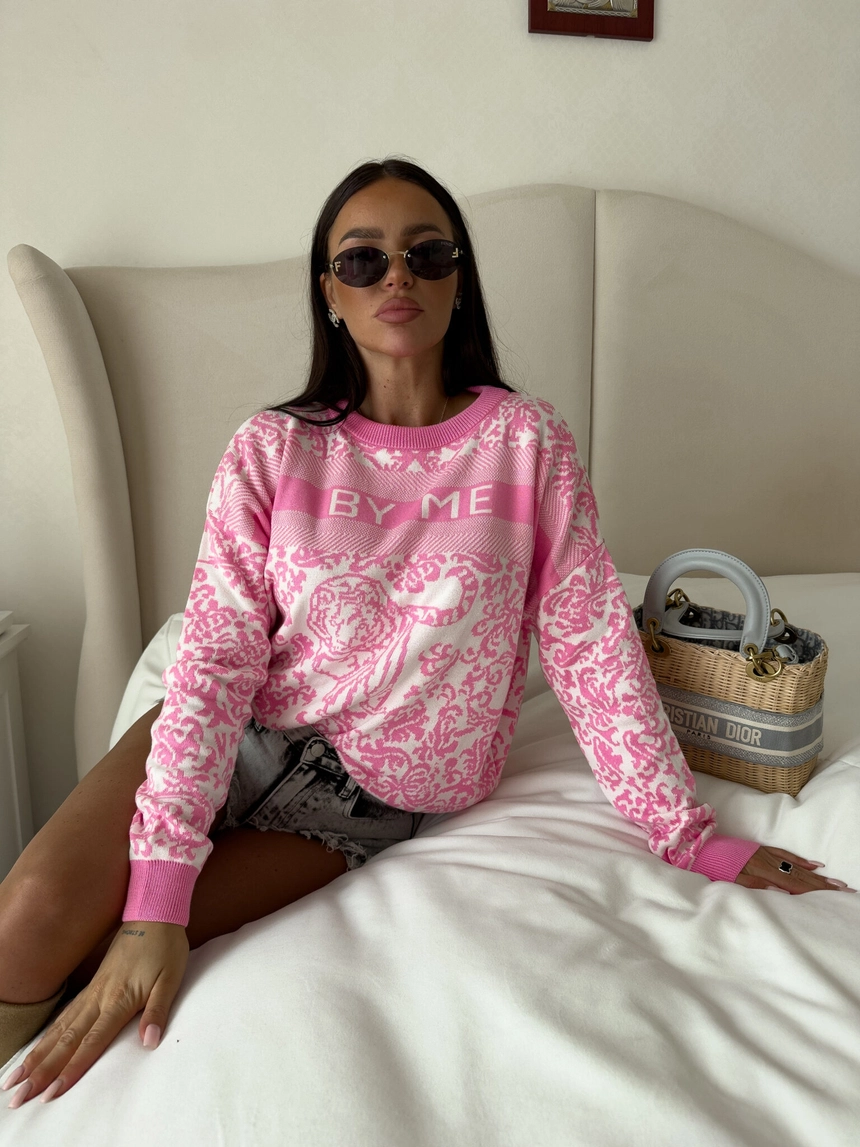 Stylowy, zakładany przez głowę sweter o luźnym, oversize’owym kroju. Wykonany z miękkiego materiału, zapewnia komfort i swobodę noszenia. Model z długim rękawem, zakończony ściągaczami na mankietach i u dołu. W centralnej części znajduje się wyrazisty, dekoracyjny motyw graficzny inspirowany ornamentami, a na wysokości klatki piersiowej – napis „BY ME”.