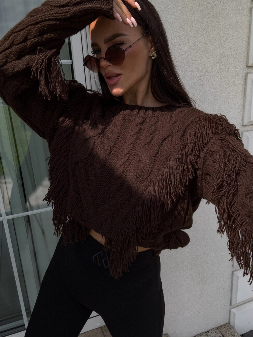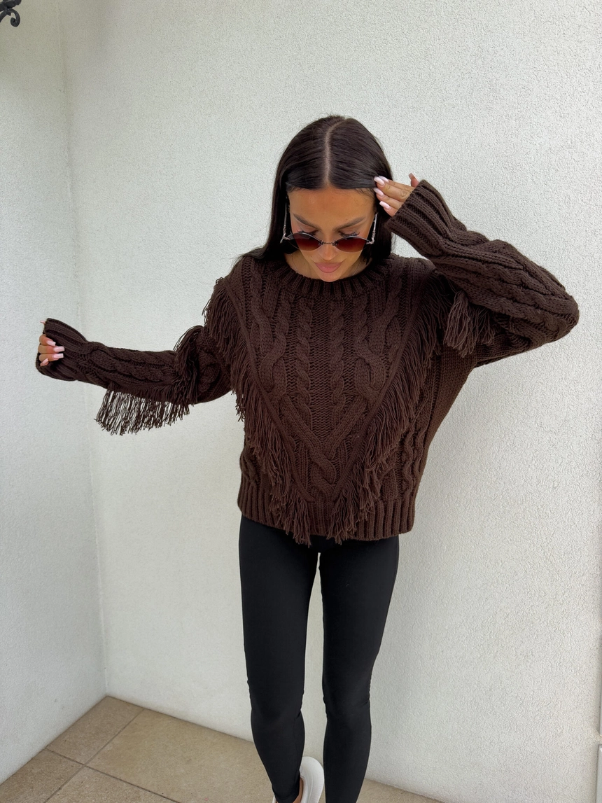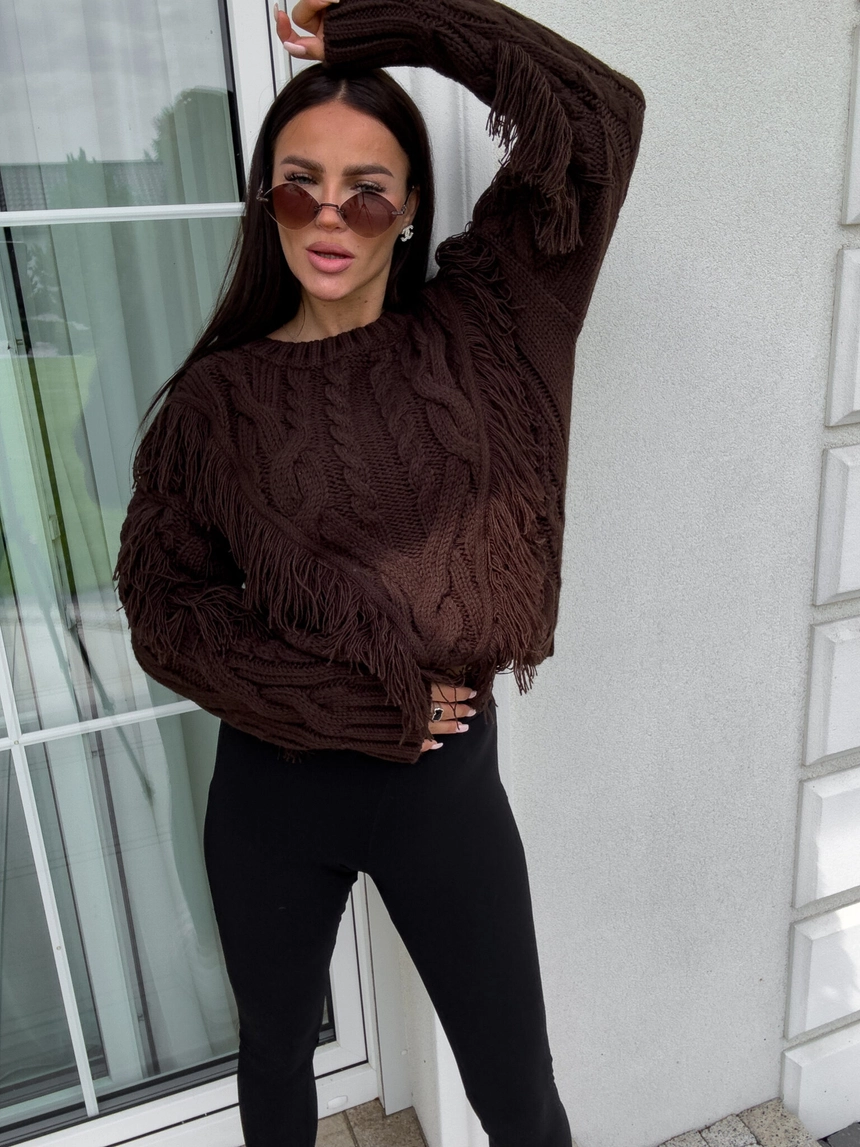 Stylowy sweter o luźnym, oversize’owym kroju, wykonany z miękkiego, plecionego materiału z wyraźnym wzorem warkoczy. Jego wyjątkowy design podkreślają ozdobne frędzle, które dodają całości oryginalnego charakteru i nawiązują do stylu boho. Długie rękawy zapewniają komfort noszenia i świetnie sprawdzają się w chłodniejsze dni.