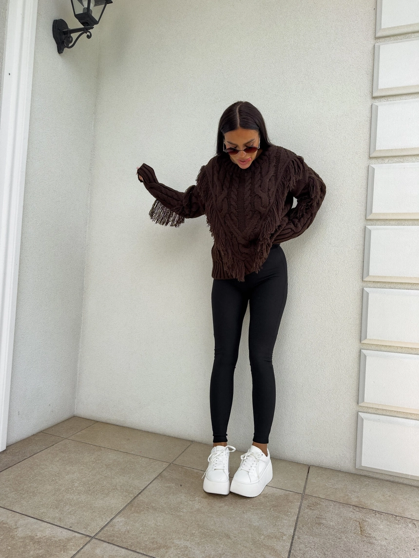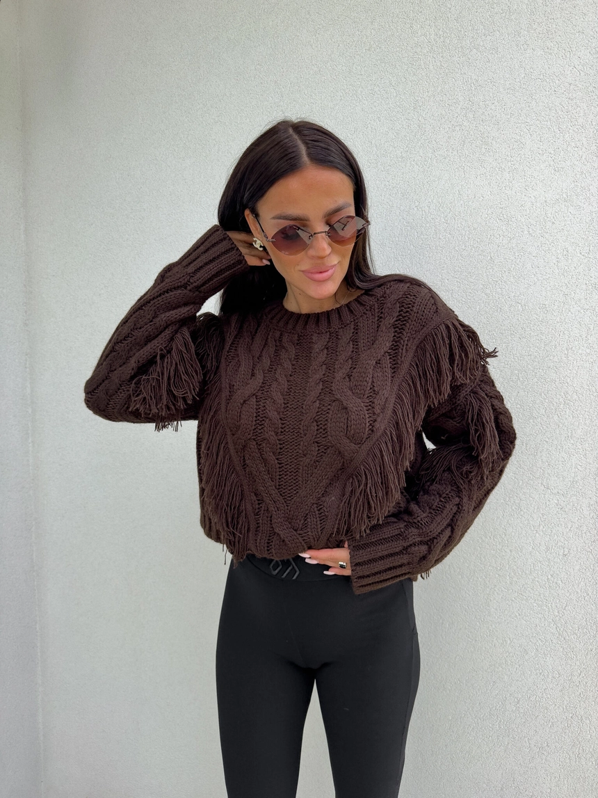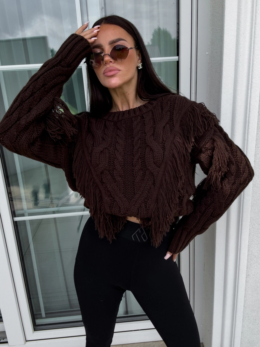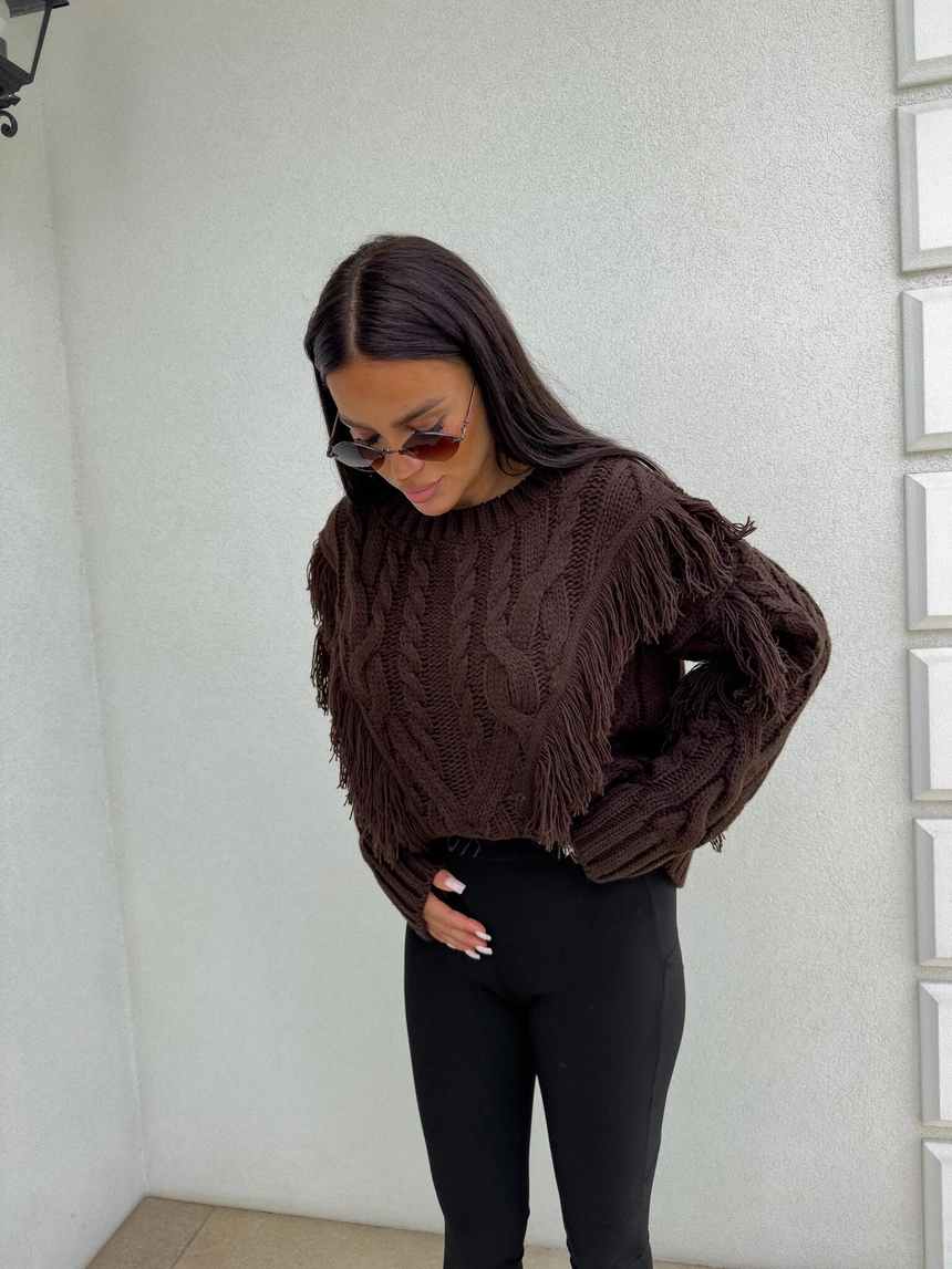 Stylowy sweter o luźnym, oversize’owym kroju, wykonany z miękkiego, plecionego materiału z wyraźnym wzorem warkoczy. Jego wyjątkowy design podkreślają ozdobne frędzle, które dodają całości oryginalnego charakteru i nawiązują do stylu boho. Długie rękawy zapewniają komfort noszenia i świetnie sprawdzają się w chłodniejsze dni.