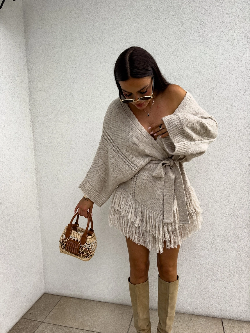 Podkreśl swój styl z kardiganem Oriana. Kardigan ma luźny, otwarty fason, a talię można podkreślić dołączonym paskiem, dzięki czemu sylwetka nabiera kobiecego kształtu. Dół kardiganu ozdobiony frędzlami, które nadają mu lekkości i boho charakteru.