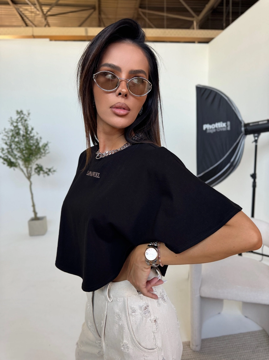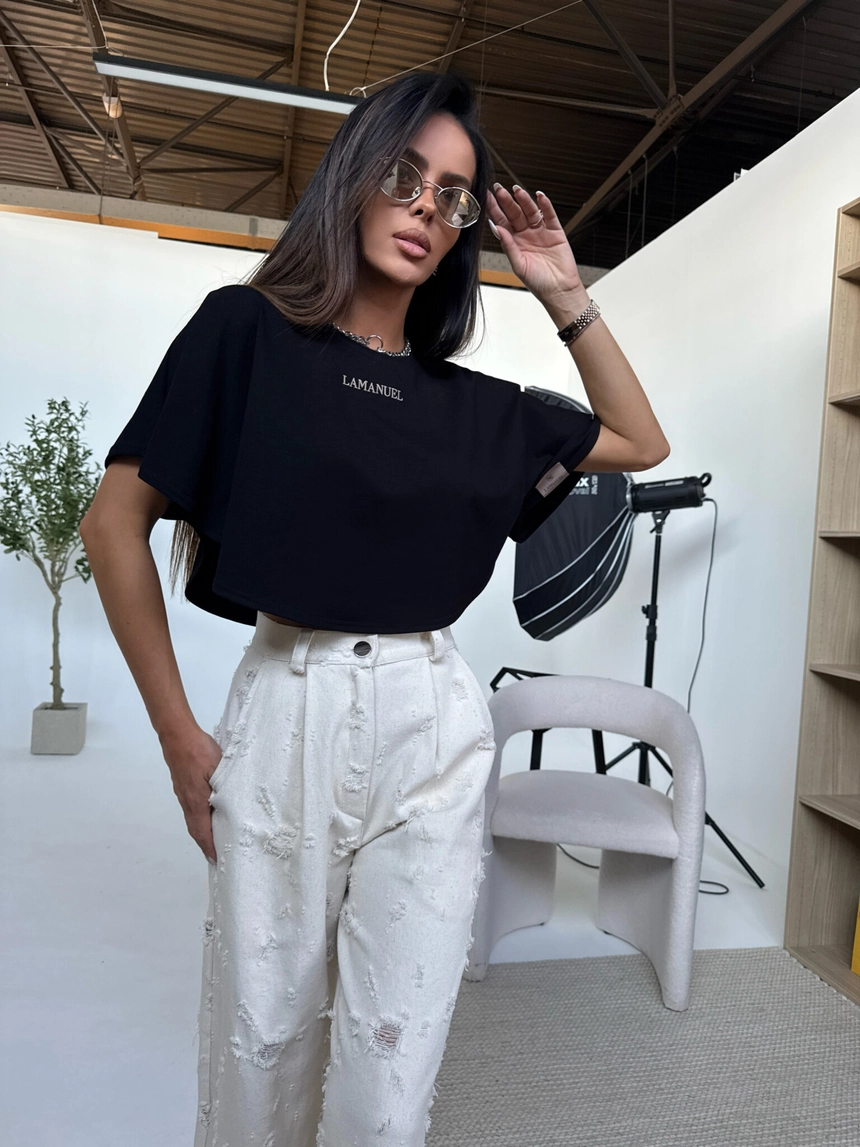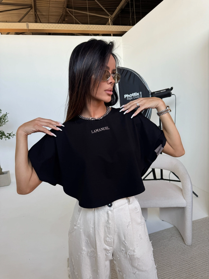 T-shirt o nietuzinkowym, półokrągłym kroju, który pięknie układa się na sylwetce i nadaje stylizacji lekkości. Dolna linia cięcia została wykończona w kształcie koła, a materiał został precyzyjnie złapany w dwóch miejscach maszynowo, co tworzy subtelny, architektoniczny detal. Luźny, krótki fason z szerokim rękawem sprawia, że to idealna propozycja na codzienne, letnie dni. Z przodu haftowane logo LAMANUEL, a na boku naszywka z sygnaturą marki – detale, które podkreślają estetykę premium.