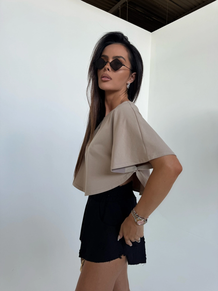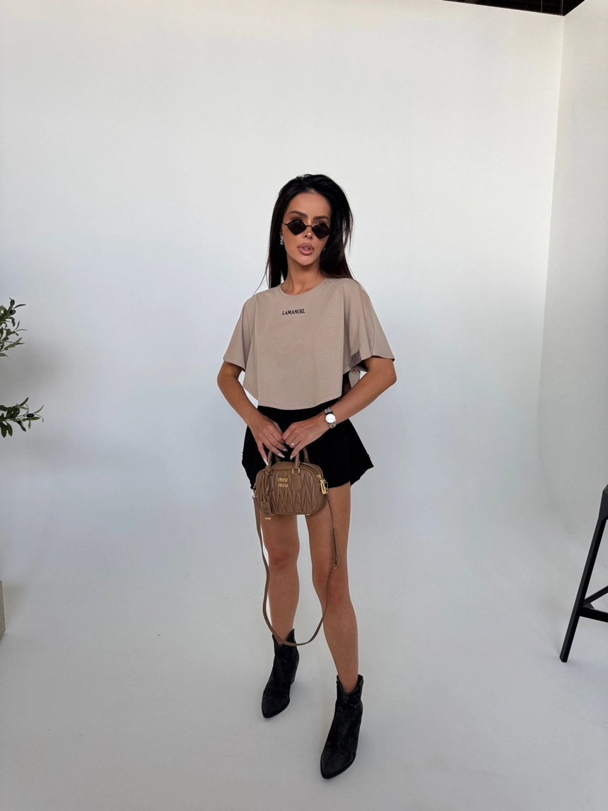 T-shirt o nietuzinkowym, półokrągłym kroju, który pięknie układa się na sylwetce i nadaje stylizacji lekkości. Dolna linia cięcia została wykończona w kształcie koła, a materiał został precyzyjnie złapany w dwóch miejscach maszynowo, co tworzy subtelny, architektoniczny detal. Luźny, krótki fason z szerokim rękawem sprawia, że to idealna propozycja na codzienne, letnie dni. Z przodu haftowane logo LAMANUEL, a na boku naszywka z sygnaturą marki – detale, które podkreślają estetykę premium.