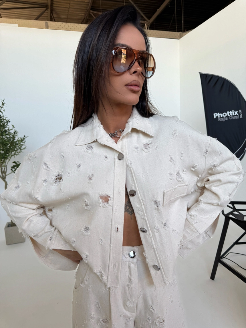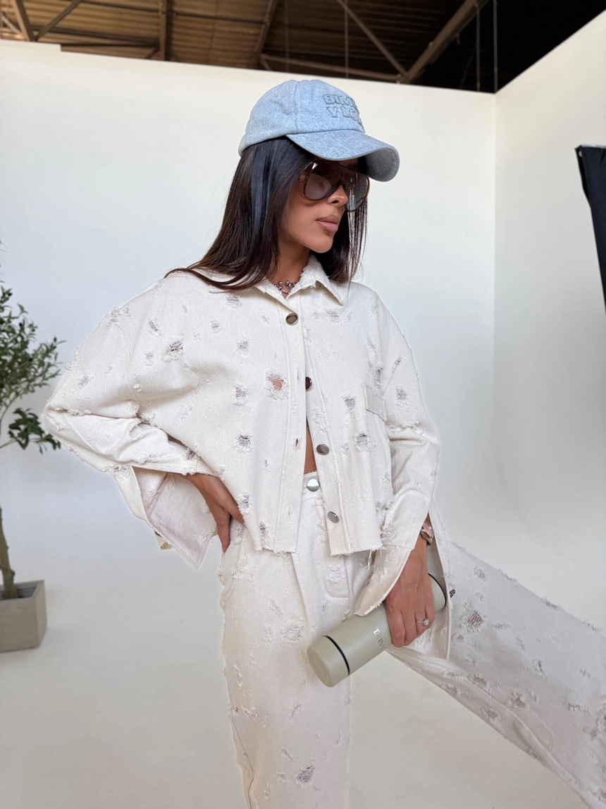 Nowoczesna interpretacja klasycznej kurtki jeansowej w wydaniu premium. Oversize’owy fason z surowo ciętym dołem i szerokimi mankietami tworzy modny, nonszalancki look. Wykonana z denimu z efektownymi przetarciami i postarzanym wykończeniem, które nadają całości wyrazistego charakteru. Metalowe guziki i precyzyjne szycie to detale podkreślające jakość wykonania. Świetnie sprawdza się jako samodzielny akcent stylizacji lub element total looku z szortami czy spodniami z tej samej tkaniny.Skład: 100% bawełna