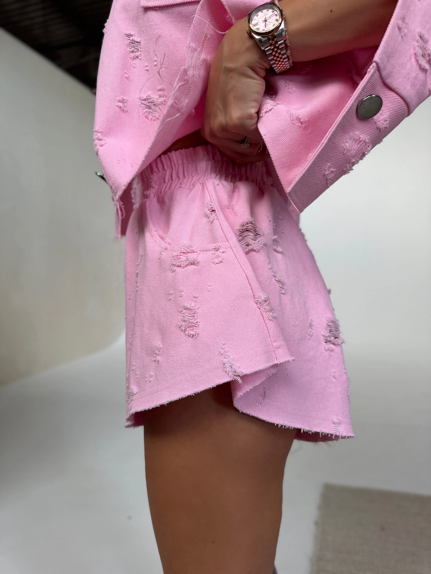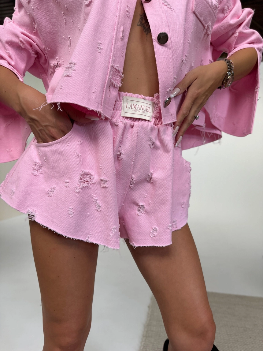 Casualowe szorty z elastycznym pasem, które łączą wygodę z wyrazistym charakterem. Wykonane z miękkiego, ale trwałego denimu z nieregularnymi przetarciami i postarzanym wykończeniem. Surowo cięty dół dodaje lekkości i swobody, a tylna naszywka z logo LAMANUEL podkreśla ich charakter premium. Idealne do letnich stylizacji – zarówno solo, jak i jako część zestawu z kurtką z tej samej tkaniny.Skład: 100% bawełna