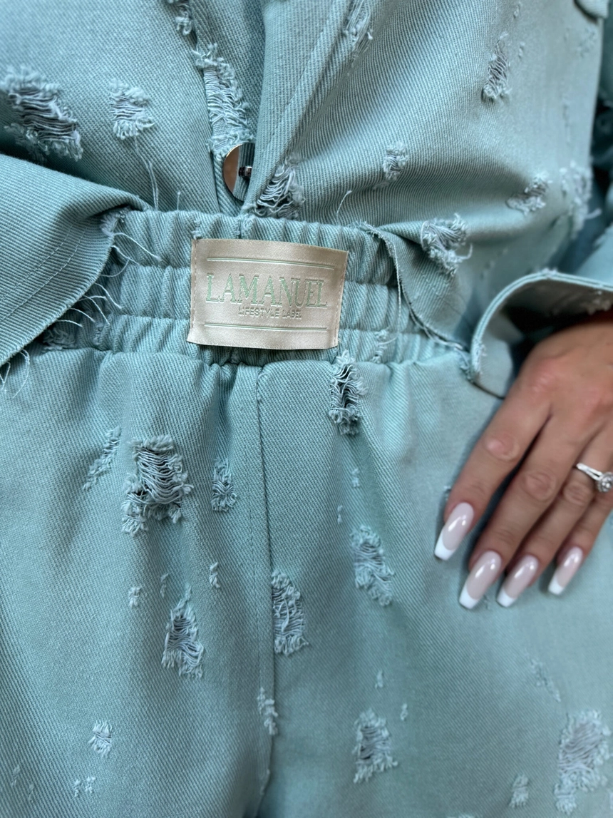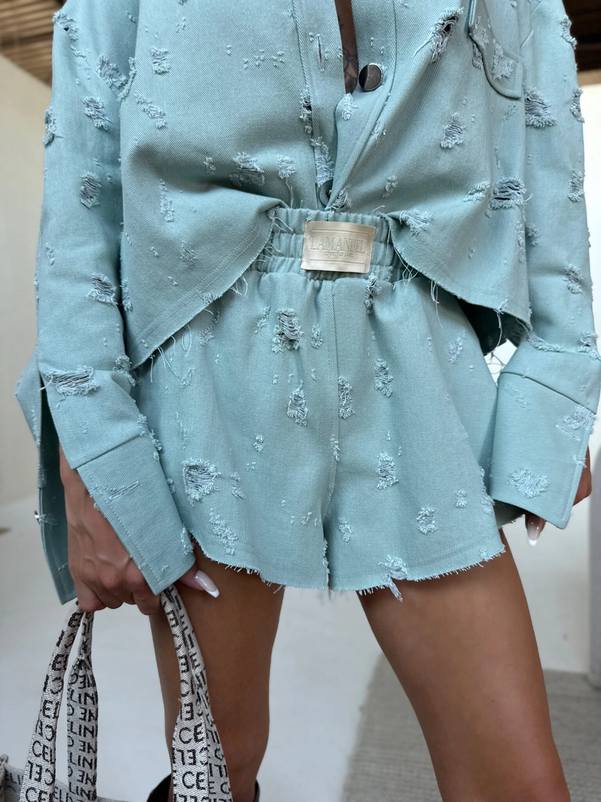 Casualowe szorty z elastycznym pasem, które łączą wygodę z wyrazistym charakterem. Wykonane z miękkiego, ale trwałego denimu z nieregularnymi przetarciami i postarzanym wykończeniem. Surowo cięty dół dodaje lekkości i swobody, a tylna naszywka z logo LAMANUEL podkreśla ich charakter premium. Idealne do letnich stylizacji – zarówno solo, jak i jako część zestawu z kurtką z tej samej tkaniny.Skład: 100% bawełna