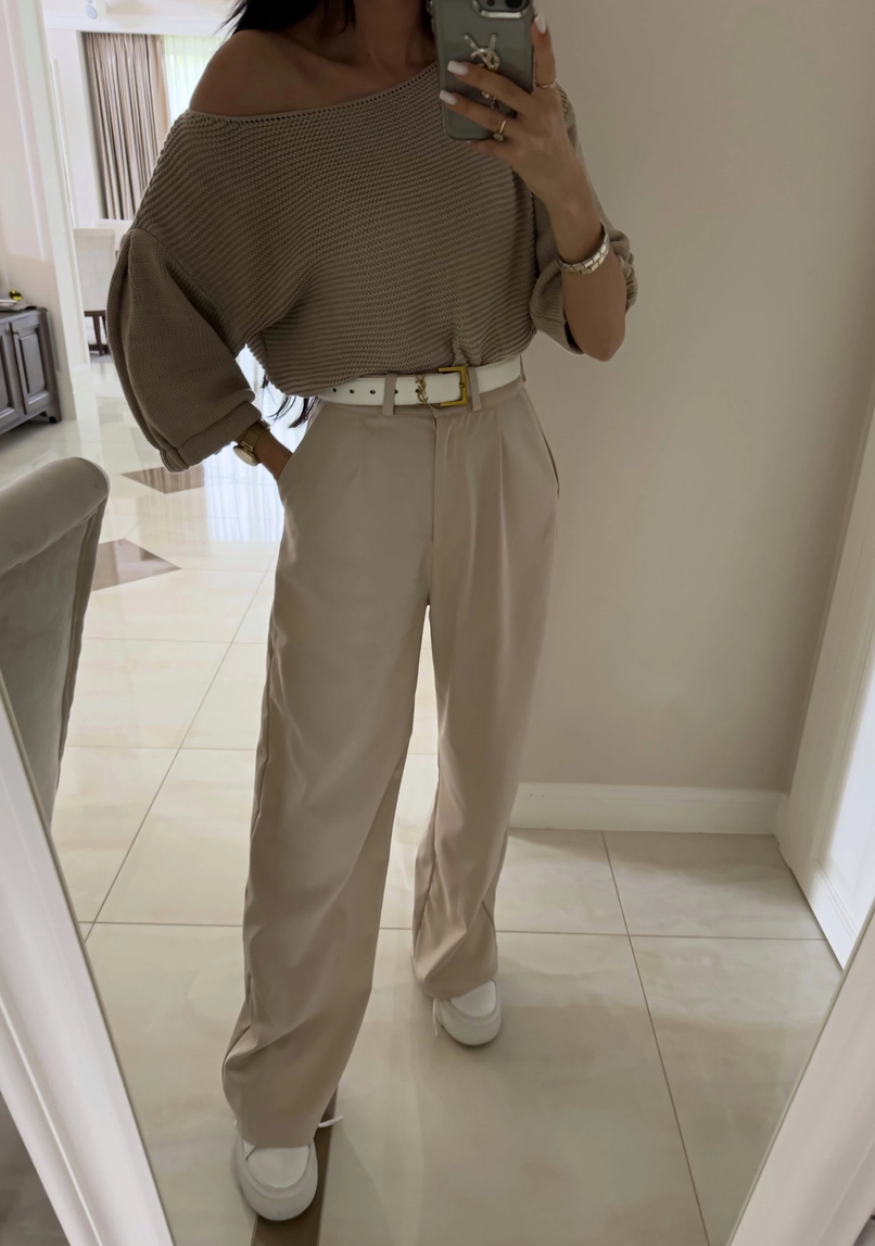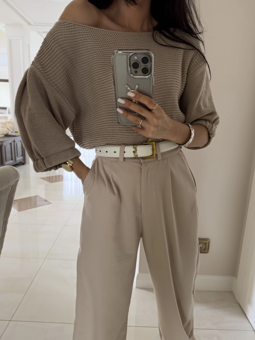 Luźny, dzianinowy sweterek z rękawami o długości 3/4, lekko bufiastymi, co dodaje stylizacji lekkości. Szeroki dekolt, opadający na jedno ramię – nadaje stylowi kobiecości. To idealny sweter na chłodniejsze dni, który dobrze komponuje się zarówno z eleganckimi spodniami, jak