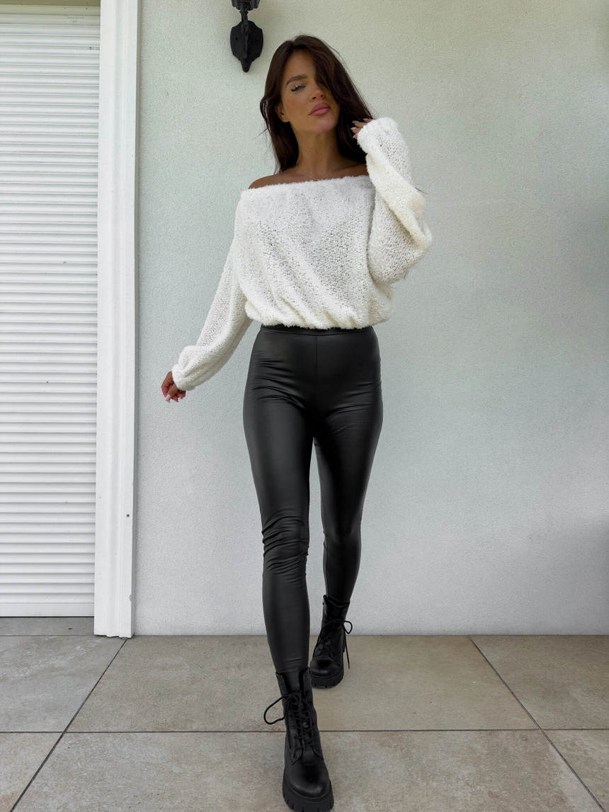 Luźna bluza z szerokim dekoltem typu "hiszpanka", który opada na ramiona. Rękawy są długie i zakończone elastycznymi ściągaczami.
