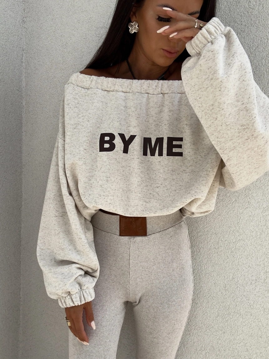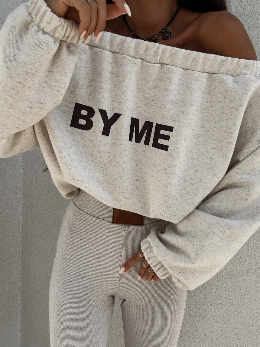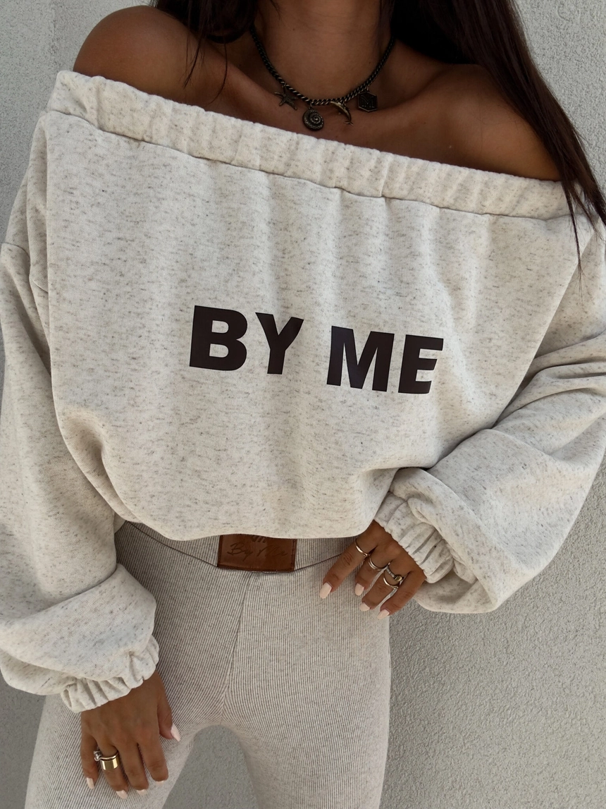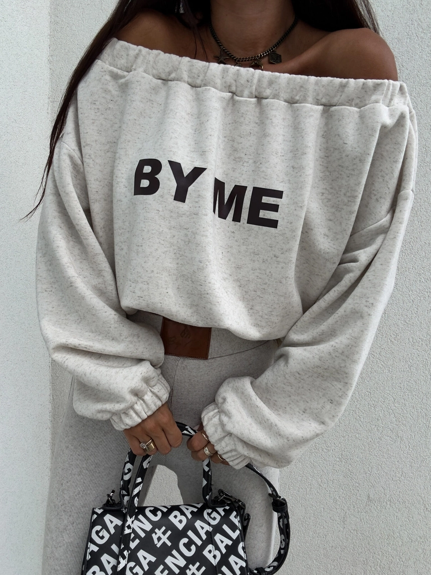 Luźna bluza z szerokim dekoltem typu "hiszpanka", który opada na ramiona. Na przodzie znajduje się napis "BY ME", wykonany dużymi literami. Rękawy są długie i zakończone elastycznymi ściągaczami.