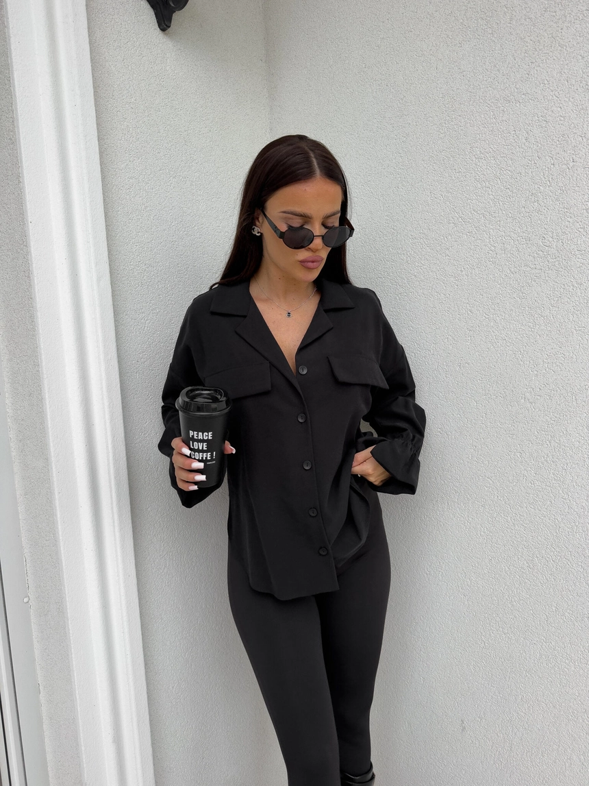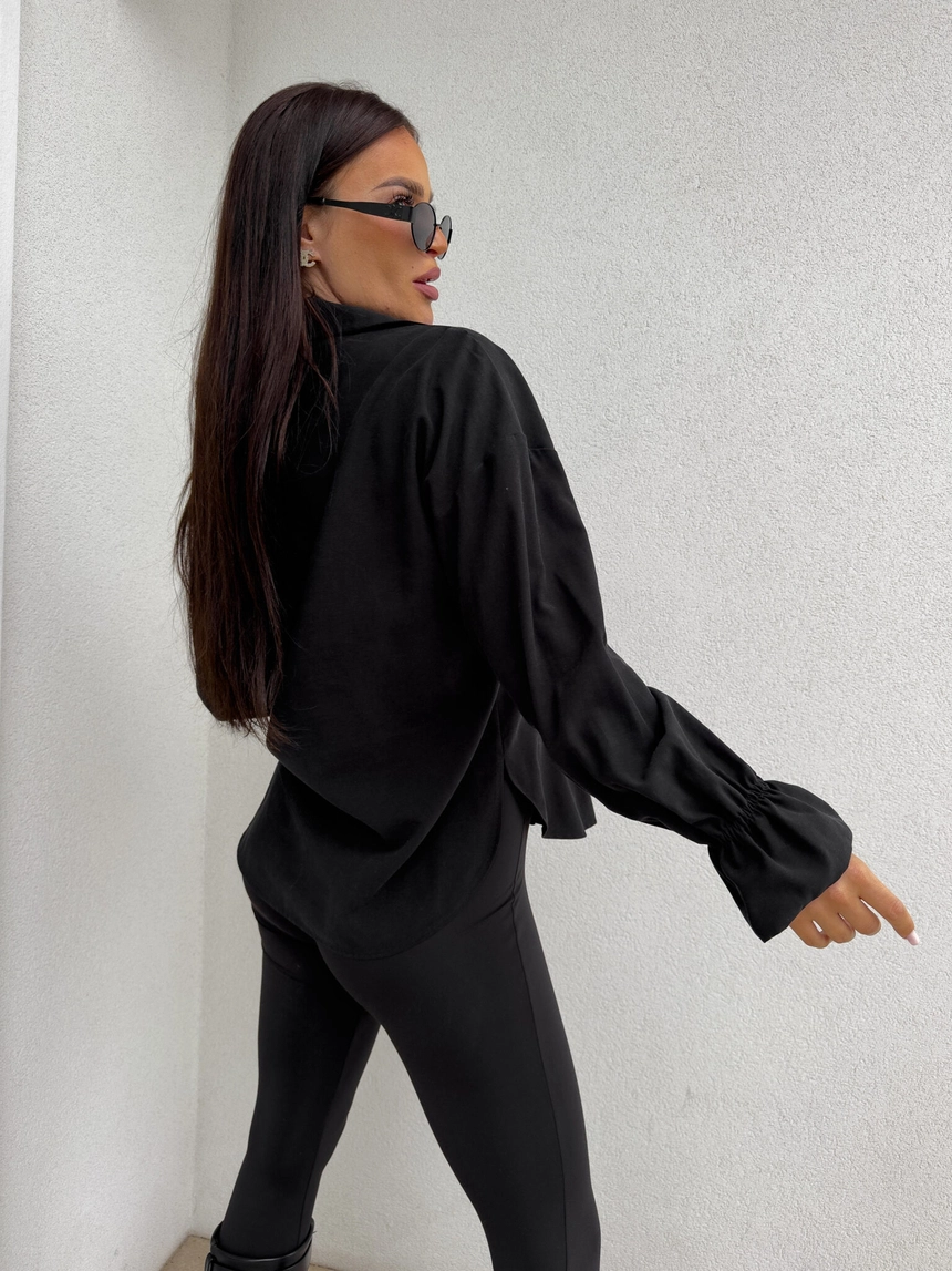 Stylowa koszula o swobodnym, oversize’owym kroju, zapinana na guziki. Klasyczny, wykładany kołnierzyk nadaje całości elegancji, dwie symetryczne kieszenie z klapkami na wysokości klatki piersiowej. Długie rękawy zakończone szerokimi mankietami z ozdobnymi marszczeniami.