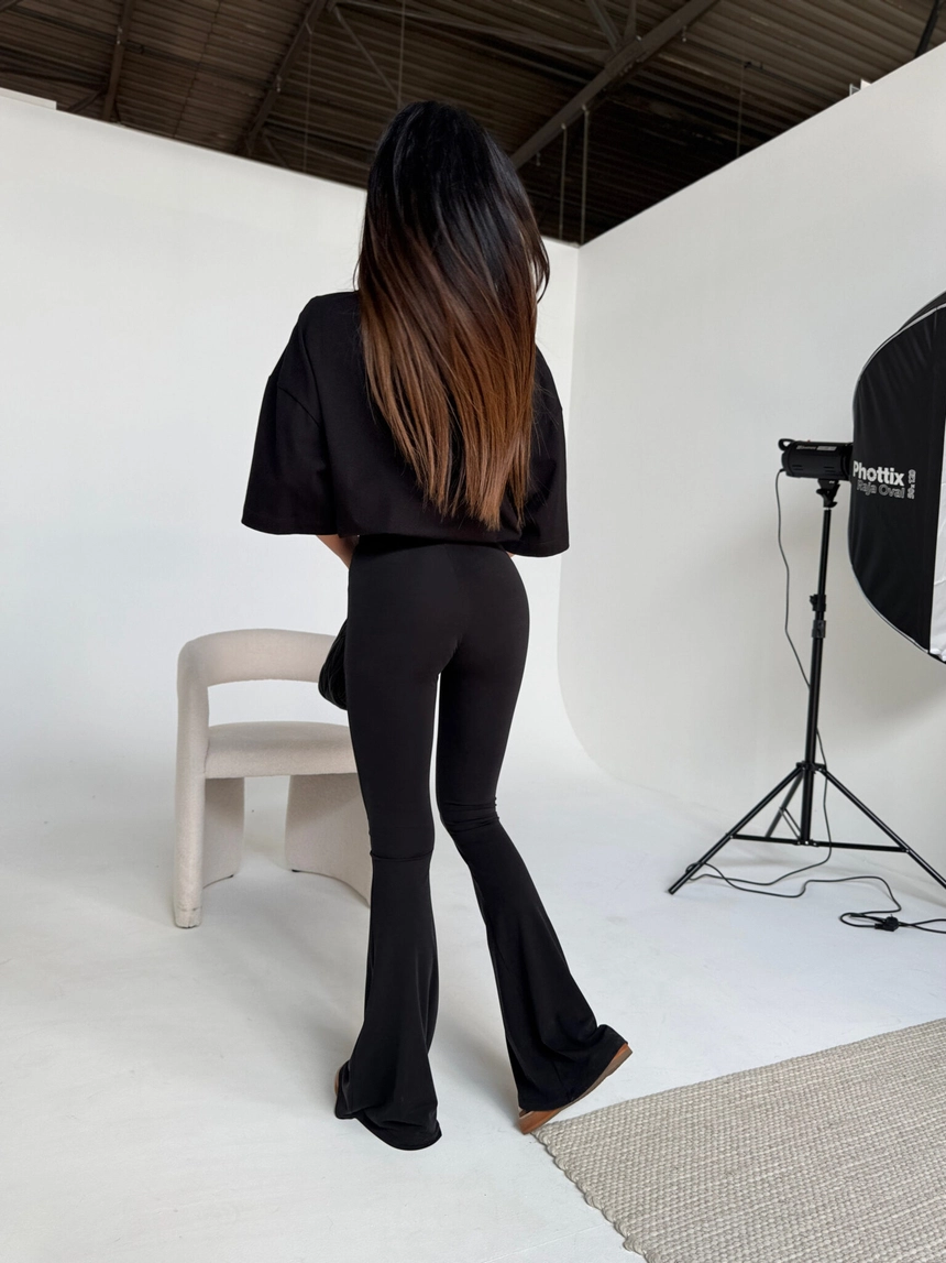 Spodnie o dopasowanym kroju z rozszerzaną nogawką, wykonane z miękkiej i elastycznej dzianiny. Wysoki stan podkreśla talię i zapewnia komfort noszenia, a rozszerzenie nogawek ku dołowi optycznie wydłuża sylwetkę. Szeroka guma w pasie z logo lamanuel dodaje wyrazistego charakteru i sprawia, że spodnie idealnie dopasowują się do ciała. Model doskonale sprawdzi się zarówno w codziennych stylizacjach, jak i w bardziej sportowym wydaniu.Skład: 53% lyocell 38% poliester 9% spandex