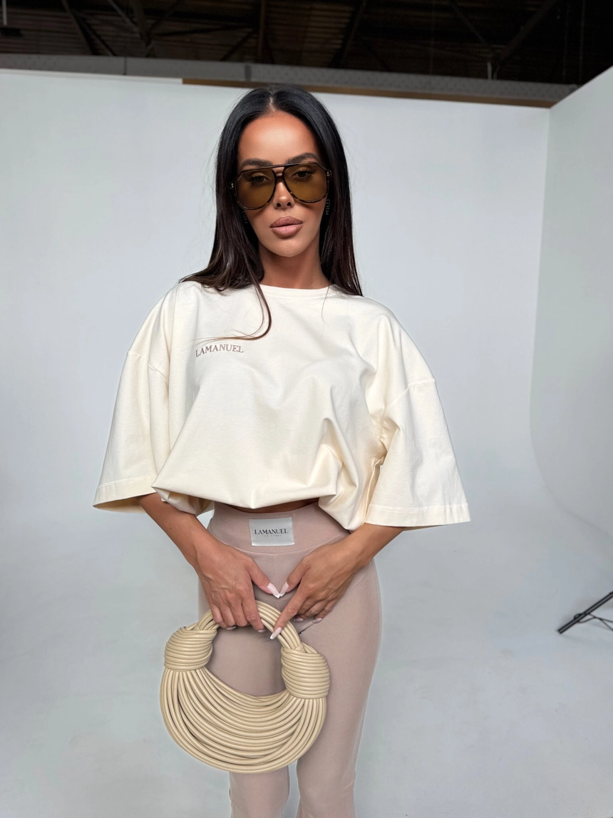 T-shirt o oversize’owym kroju z krótkim rękawem i subtelnym logo lamanuel na piersi. Uszyty z przyjemnej w dotyku bawełnianej dzianiny, zapewnia maksymalny komfort noszenia i swobodę ruchów. Dół wykończony elastyczną gumką, dzięki czemu możesz nosić go luźno lub lekko podciągnięty, eksponując talię. Uniwersalny fason sprawdzi się zarówno w sportowych zestawieniach, jak i w codziennych, minimalistycznych stylizacjach.Skład: 100% bawełna