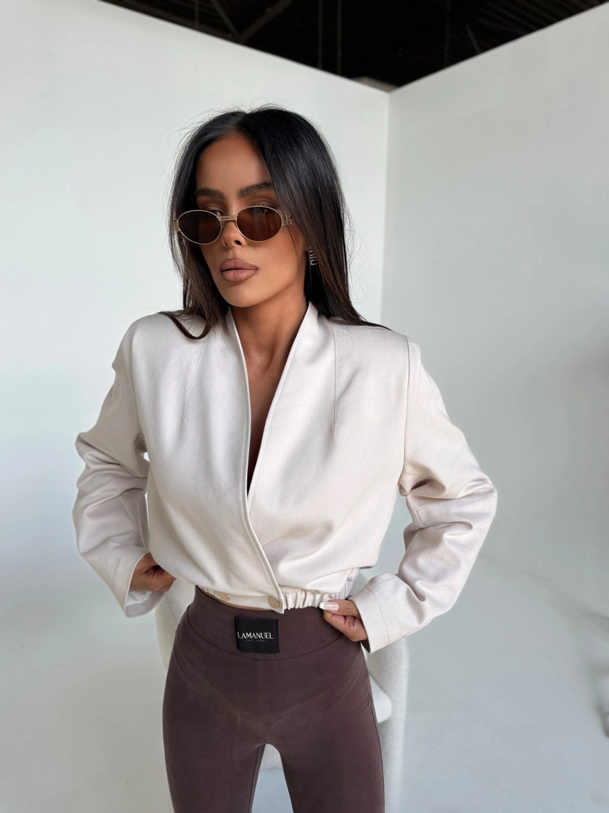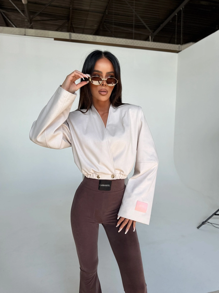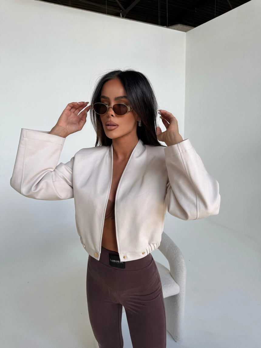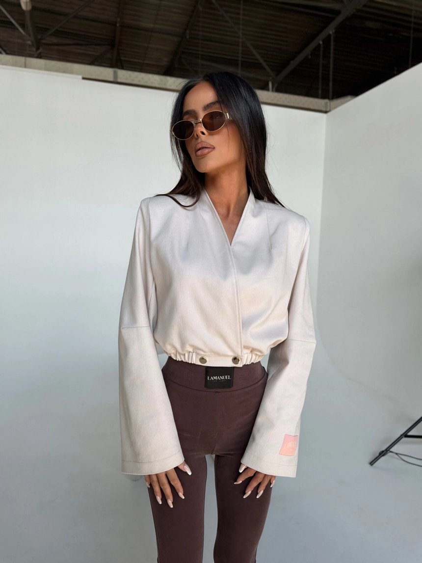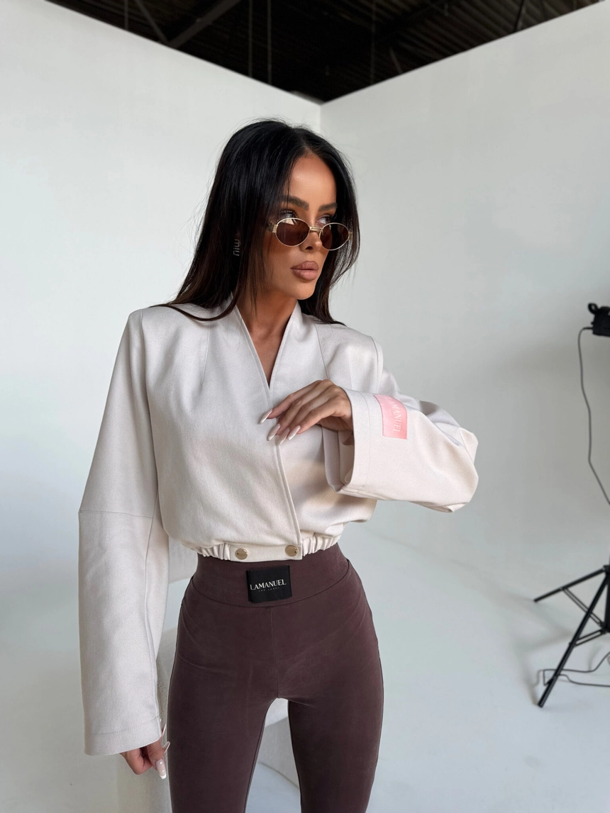 Krótka kurtka o luźnym kroju z lekko usztywnianego materiału, zapinana z przodu na metalowe napy. Posiada prostą stójkę oraz szerokie rękawy zakończone wyrazistym mankietem z różową metką lamanuel. Dół wykończony elastycznym ściągaczem z regulacją, który pozwala dopasować fason do sylwetki. Nowoczesna forma łączy w sobie wygodę i wyrazisty detal, tworząc idealną bazę do codziennych stylizacji w duchu miejskiego minimalizmu.Skład: 65% bawełna 32% poliester 3% spandex