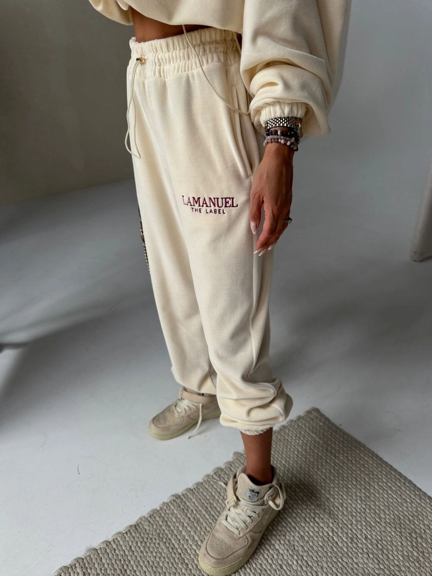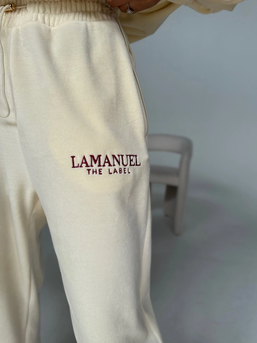 Luźne spodnie dresowe o zwężanym kroju i elastycznym wykończeniu w pasie oraz przy kostkach. Po lewej stronie wyhaftowane logo lamanuel w kontrastowym kolorze. Ściągacz w pasie z troczkami pozwala idealnie dopasować je do sylwetki. Casual, który wcale nie wygląda zwyczajnie. Spodnie mimo, że są szerokie pasują idealnie od rozmiaru XS-L.Skład: 90% bawełna 10% poliester