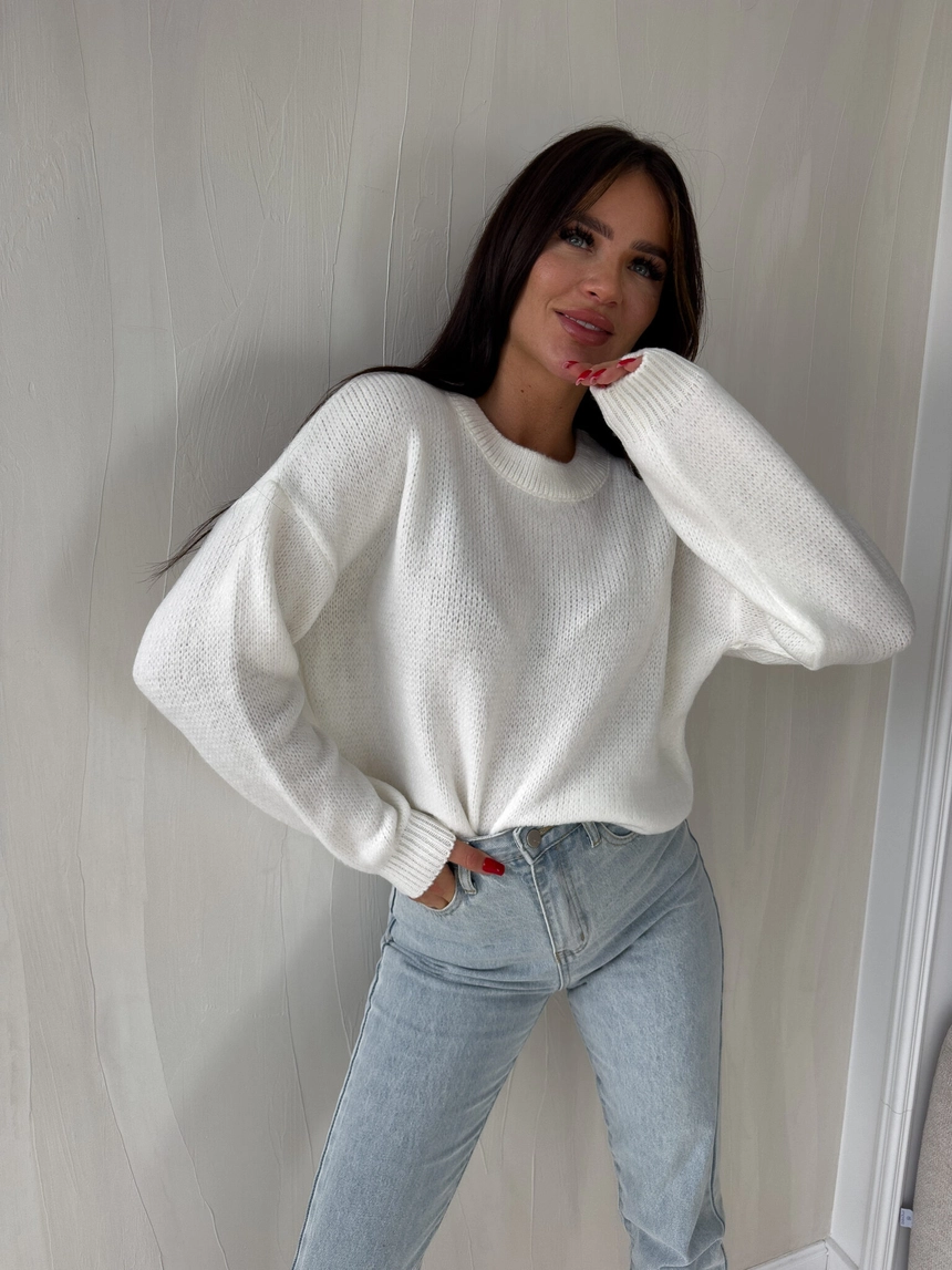 Sweterek Nerys zakładany przez głowę ze ściągaczem przy rękawie i w pasie. Miły, niegryzący materiał.