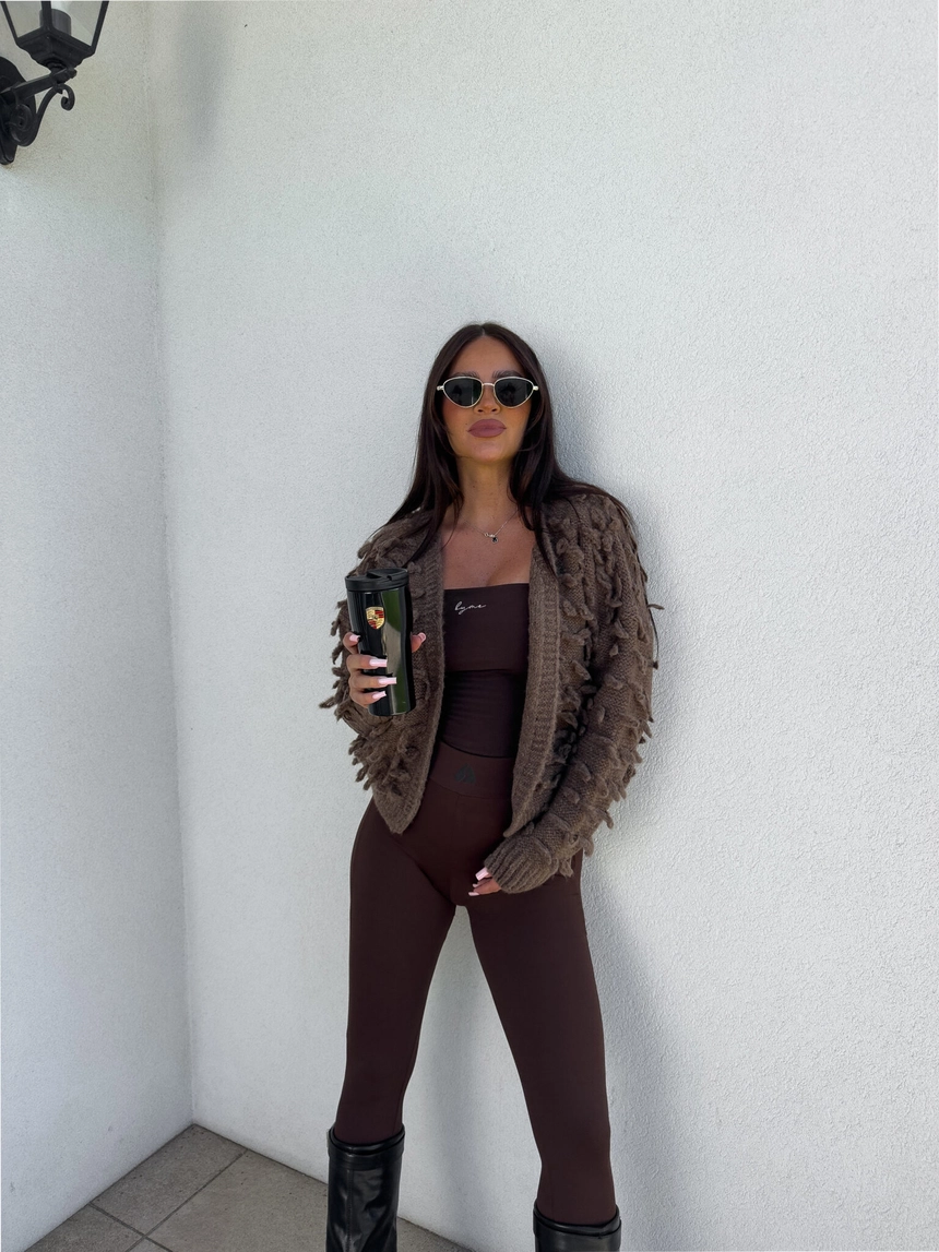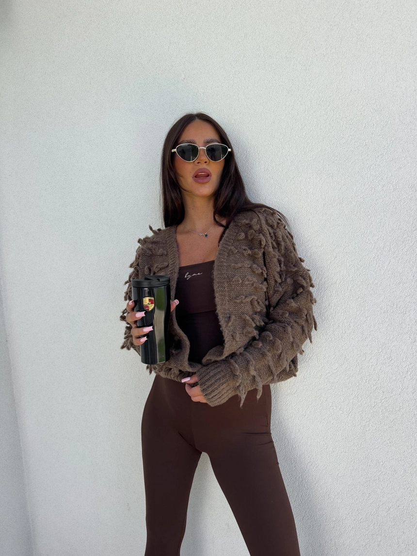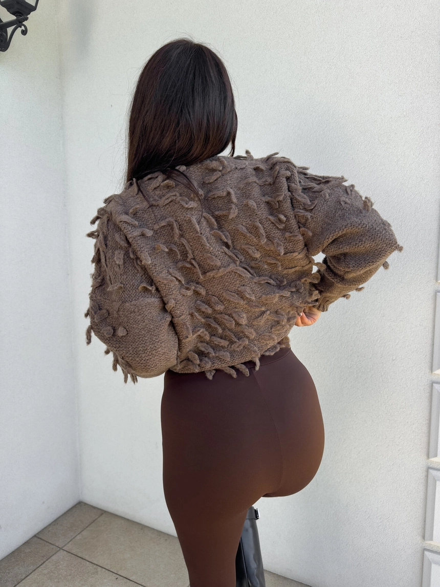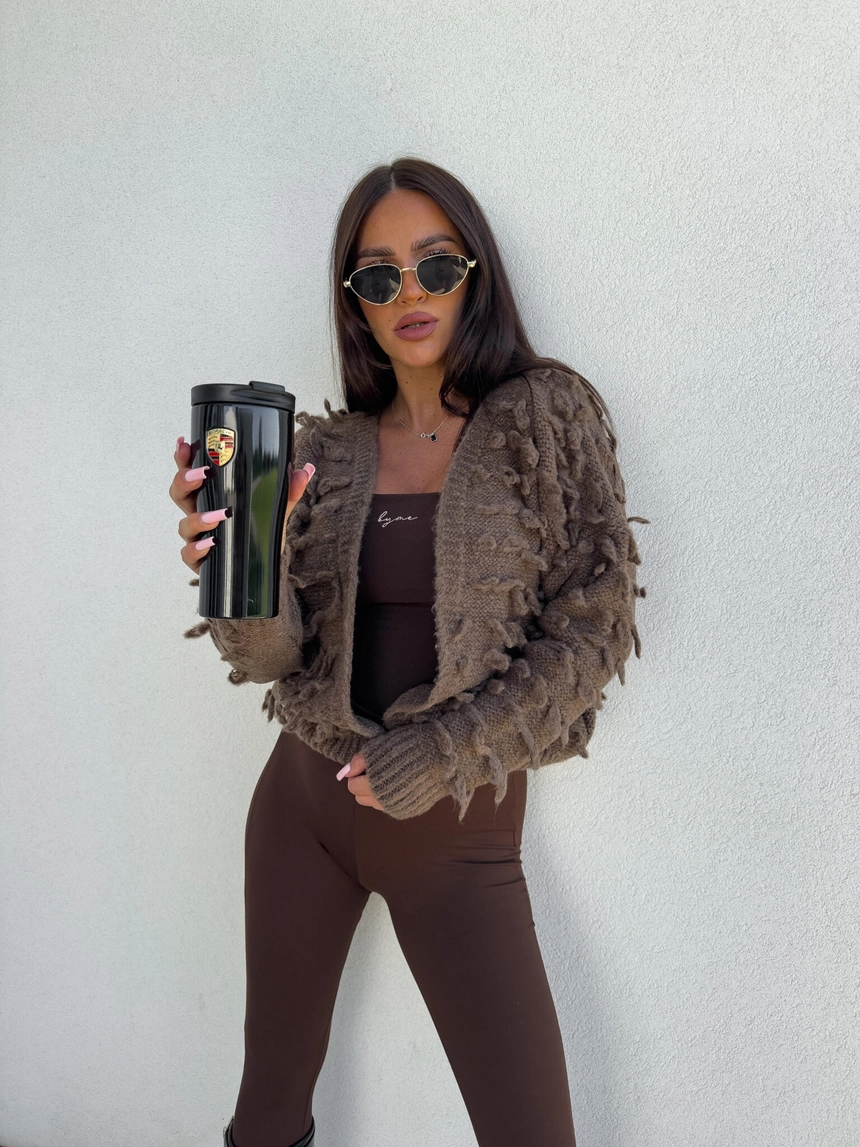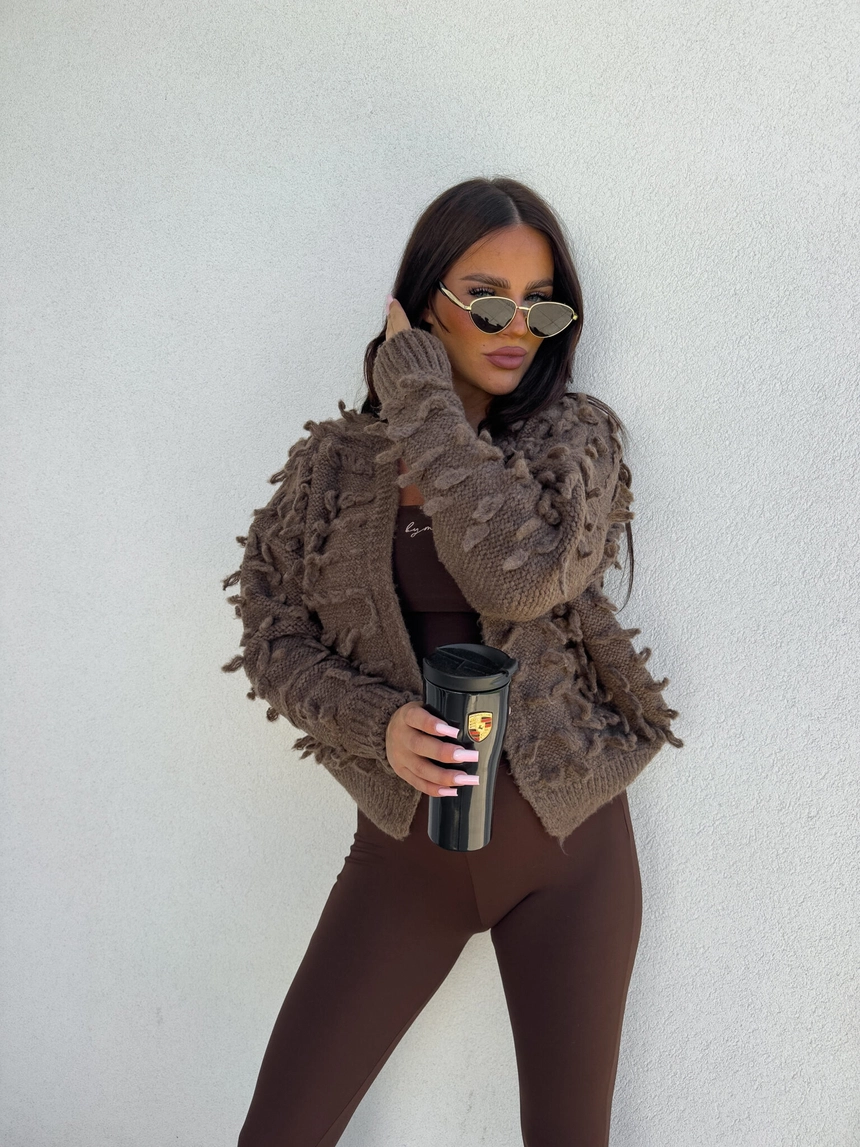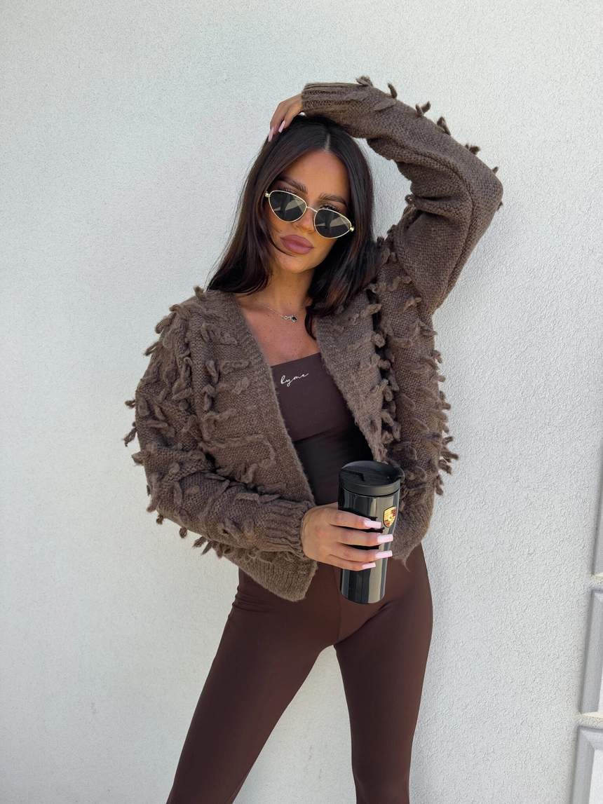 Krótki kardigan, wykonany z miękkiej dzianiny – posiada charakterystyczne, wystające frędzelki na całej powierzchni, co nadaje mu wyjątkowego i modnego wyglądu. Ma luźny krój, długie rękawy i szerokie mankiety.
