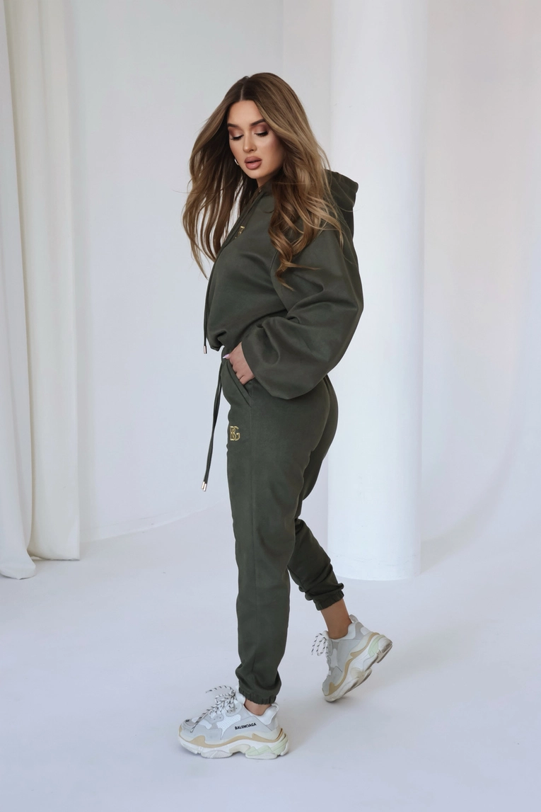 Opis produktu: Dres zamszowy BG EMU. Bluza oraz spodnie logowane złotym haftem BG, sznurki w kapturze oraz w pasie spodni. Dres wykończony gumkami.