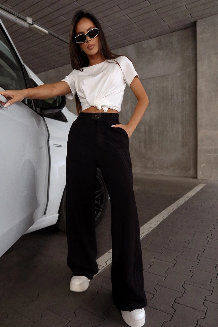 Dresowe spodnie o luźnym, prostym kroju wykonane z grubszej, mięsistej bawełny drapanej od wewnątrz. Charakterystyczne, profilowane przeszycia z przodu i z tyłu nadają formę oraz wyróżniają model na tle klasycznych fasonów. Szerokie lampasy z kontrastowymi pasami optycznie wydłużają sylwetkę. Elastyczna guma w pasie zapewnia wygodne dopasowanie, a naszywka z logo z przodu podkreśla streetwearowy charakter spodni. Model łączy wygodę z mocnym wizualnym akcentem — idealny do stylizacji casualowych i sportowych.Skład: 90% bawełna 10% poliester