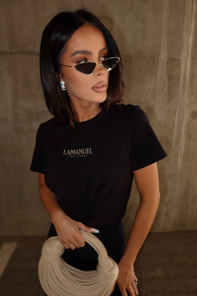 T-shirt o klasycznej długości i lekko dopasowanym kroju, wykonany z miękkiej, elastycznej bawełny zapewniającej komfort noszenia. Model z okrągłym dekoltem i prostym rękawem, ozdobiony subtelnym haftowanym logo z przodu. Uniwersalna forma pozwala na noszenie zarówno w wersji luźnej, jak i stylizowanej np. poprzez wiązanie. Idealny do codziennych stylizacji, jako baza pod bluzy, marynarki lub denim.Skład: 100% bawełna