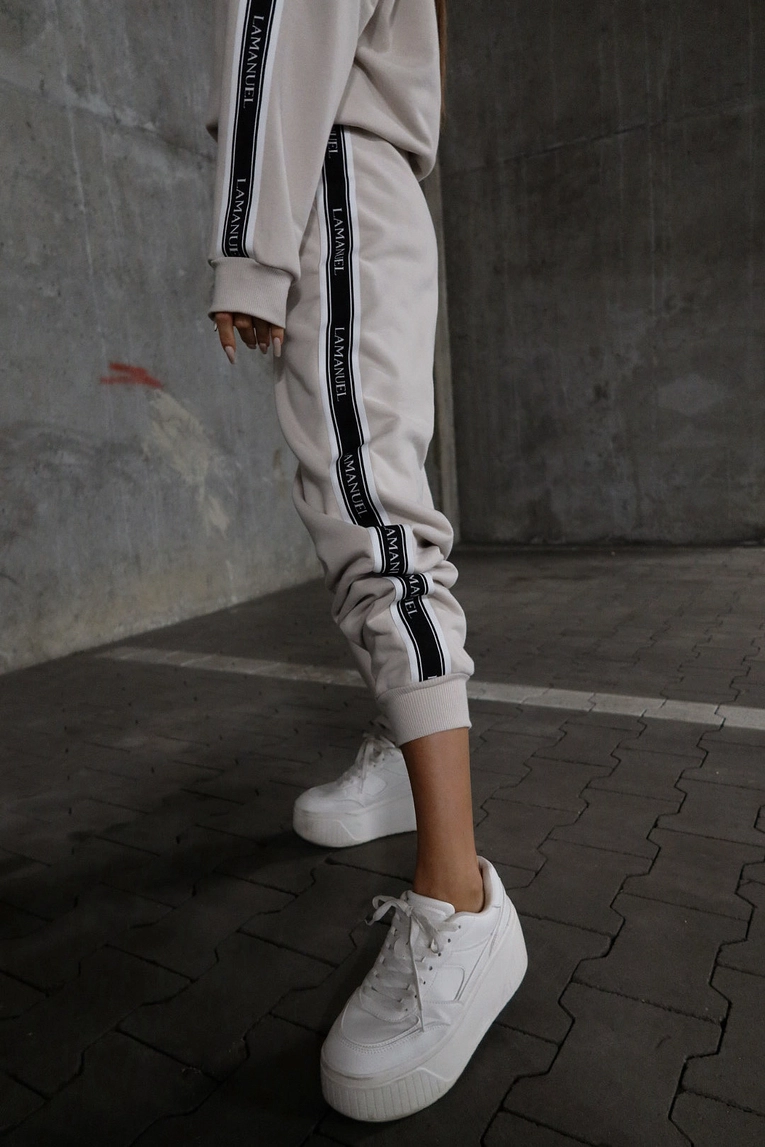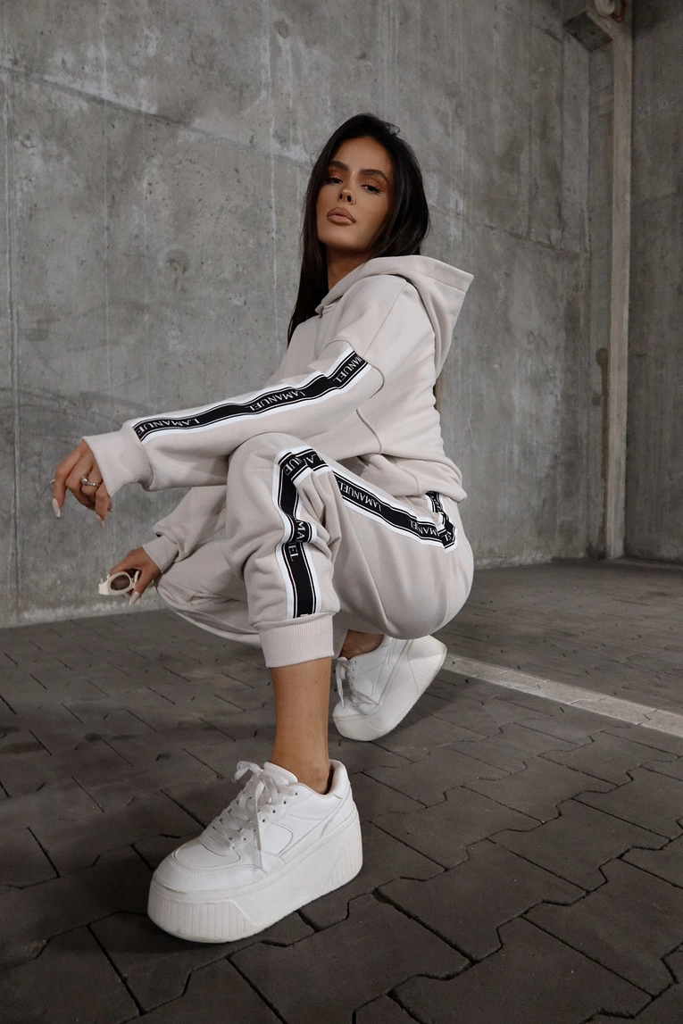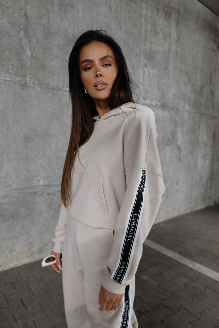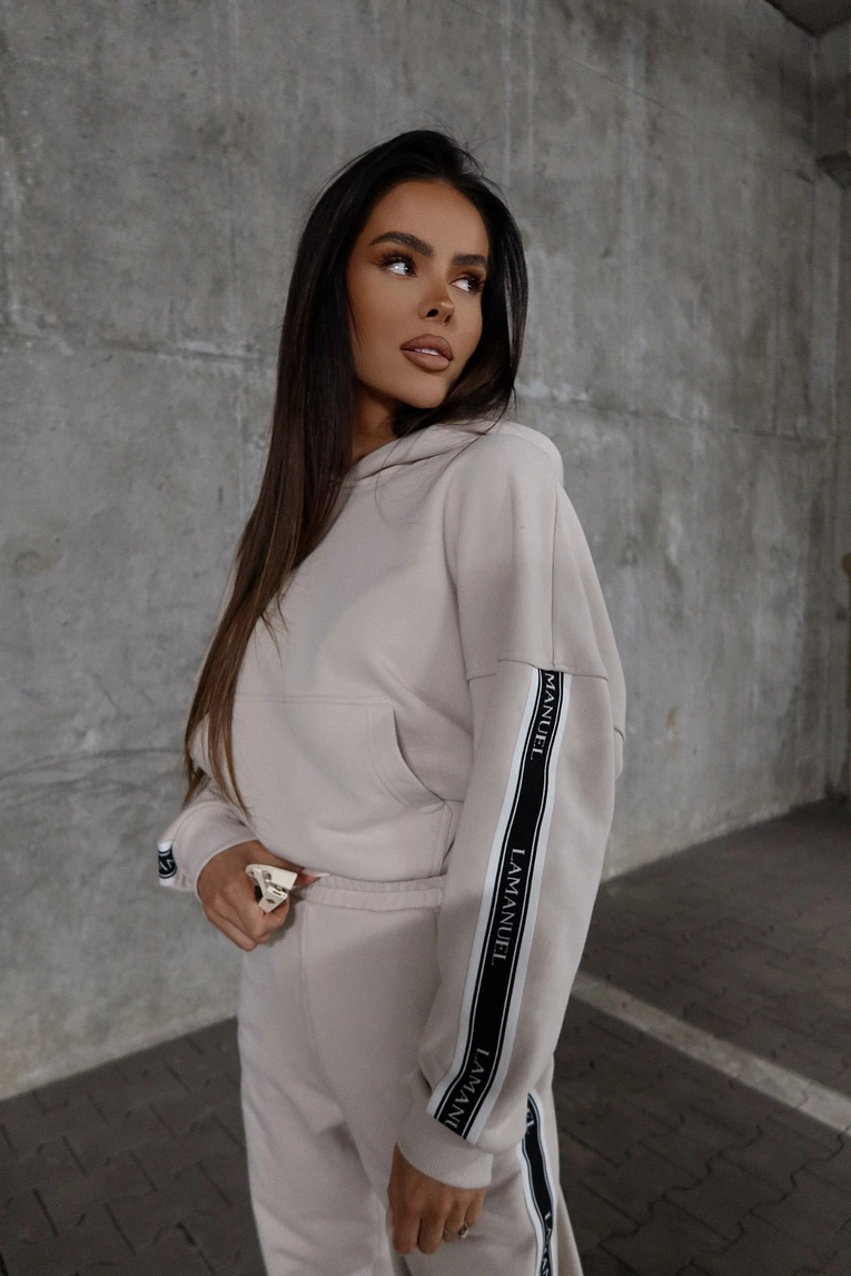 Bluza wykonana z dzianiny dresowej pętelkowej, o klasycznym, lekko oversize’owym kroju. Model z kapturem i kieszenią typu kangurka, ozdobiony szerokimi lampasami z logo LAMANUEL wszytymi wzdłuż rękawów. Ściągacze przy mankietach i dole zapewniają wygodne dopasowanie. Idealna propozycja na codzienne, swobodne stylizacje – zarówno w zestawie, jak i solo.Spodnie z dzianiny dresowej pętelkowej, o swobodnym kroju z wyższym stanem. Elastyczny pas oraz nogawki zakończone ściągaczem zapewniają komfort i dopasowanie. Szerokie lampasy z logo LAMANUEL wzdłuż nogawek podkreślają charakter modelu. Boczne kieszenie zwiększają funkcjonalność. Spodnie świetnie sprawdzą się w duecie z bluzą lub jako element miejskiej stylizacji.Skład: 90% bawełna 10% poliester