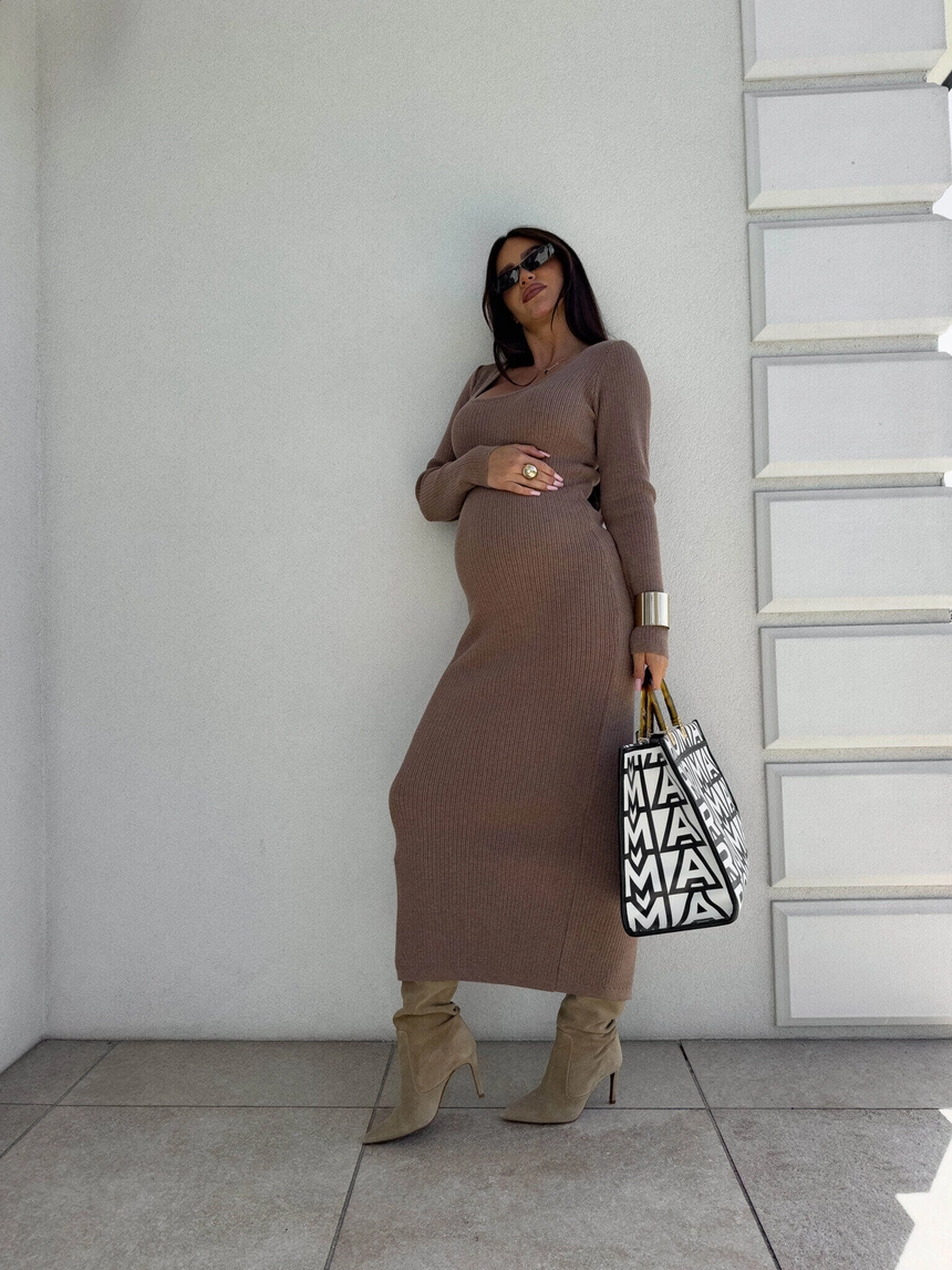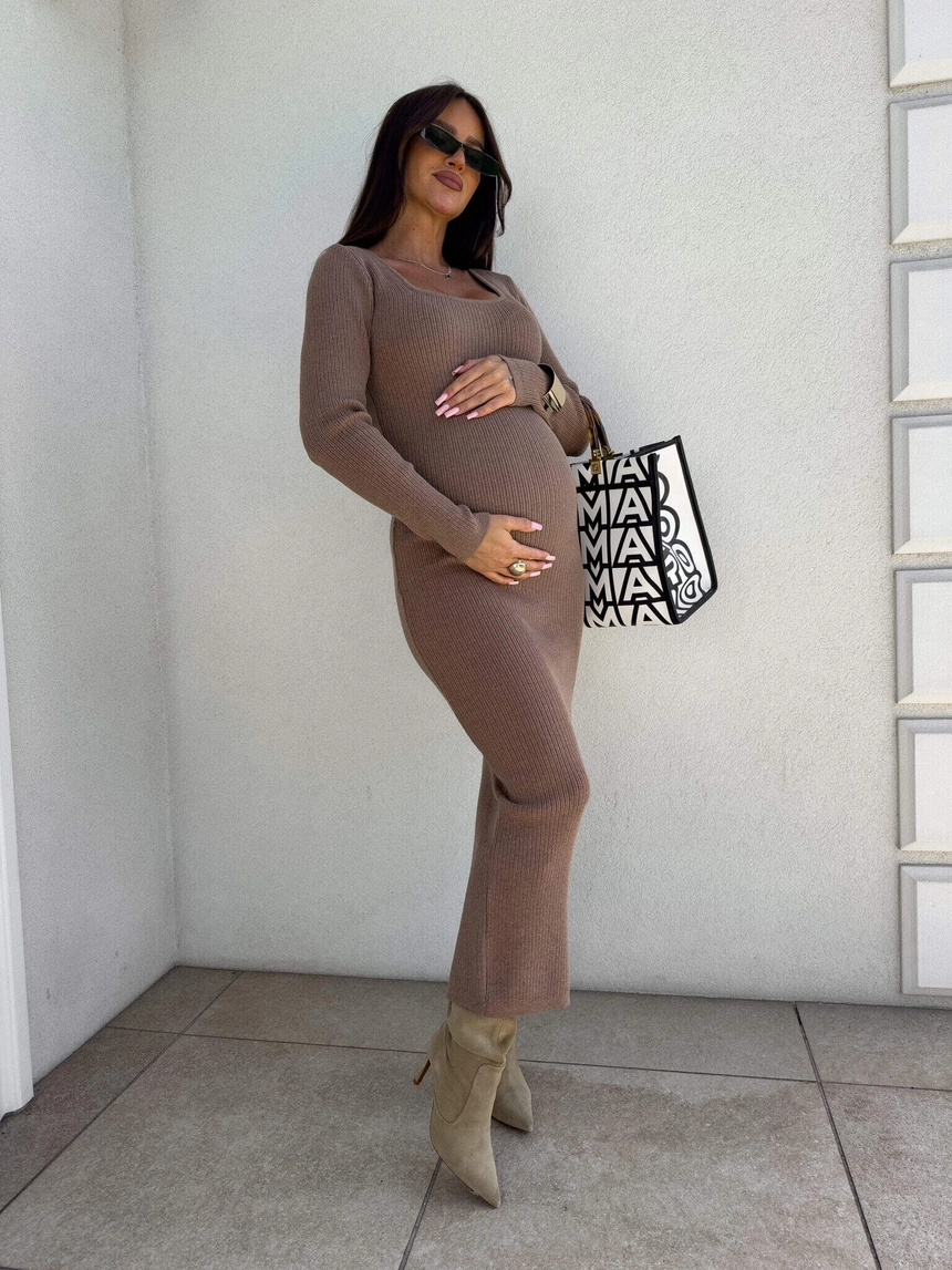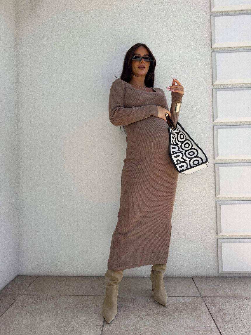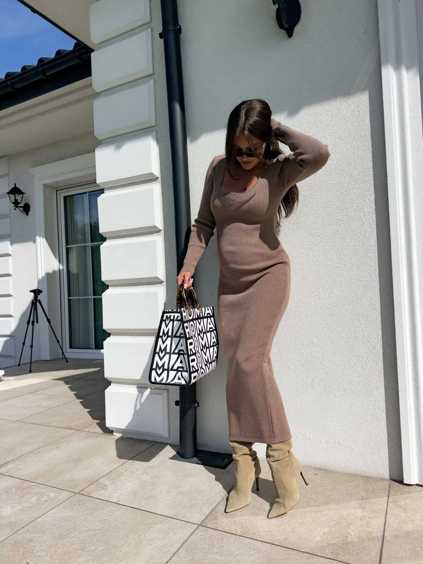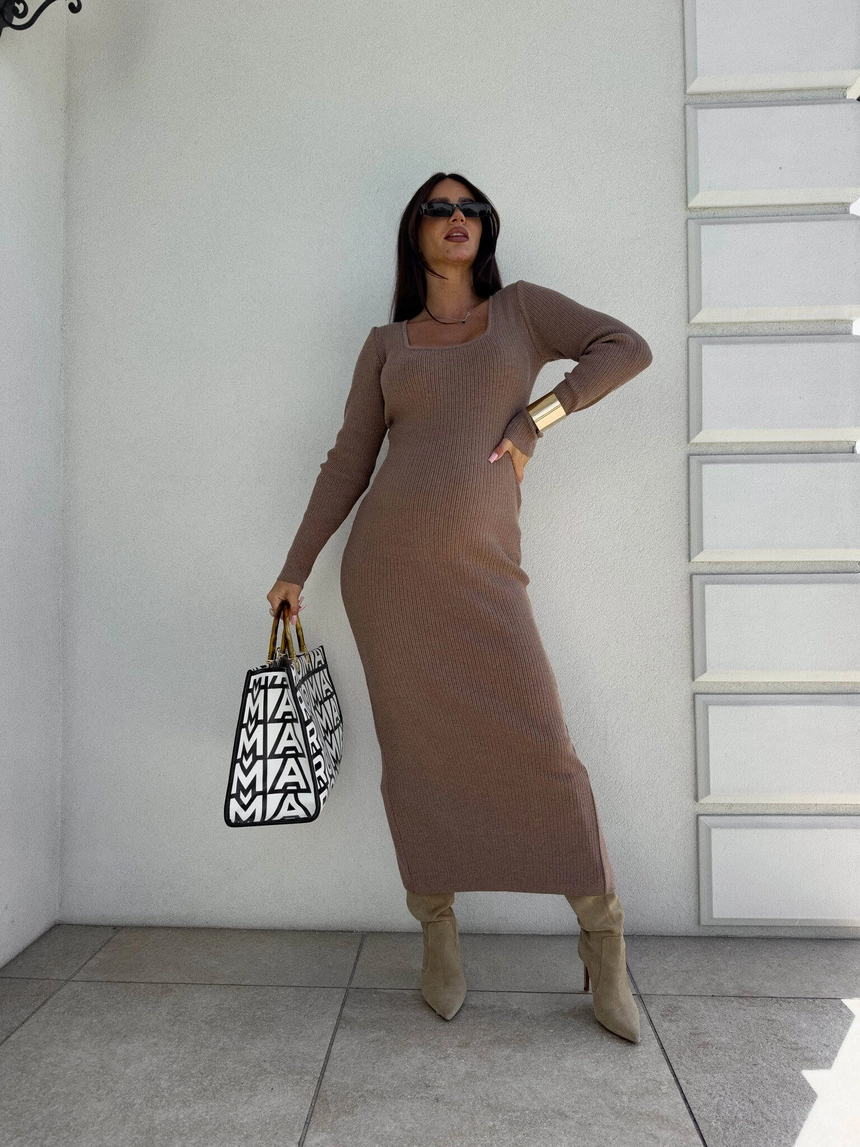 Sukienka o długości midi, wykonana z wysokiej jakości, elastycznej przędzy o prążkowanej strukturze. Model dekoltem karo i długimi rękawami doskonale podkreśla sylwetkę, zapewniając jednocześnie komfort noszenia. Subtelne rozcięcie z tyłu dodaje całości kobiecego charakteru i ułatwia swobodne poruszanie się. Idealna zarówno na co dzień, jak i na bardziej formalne okazje.