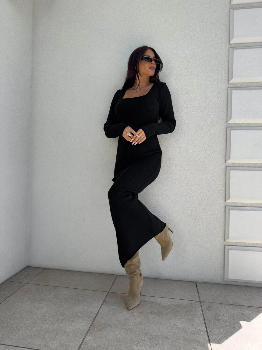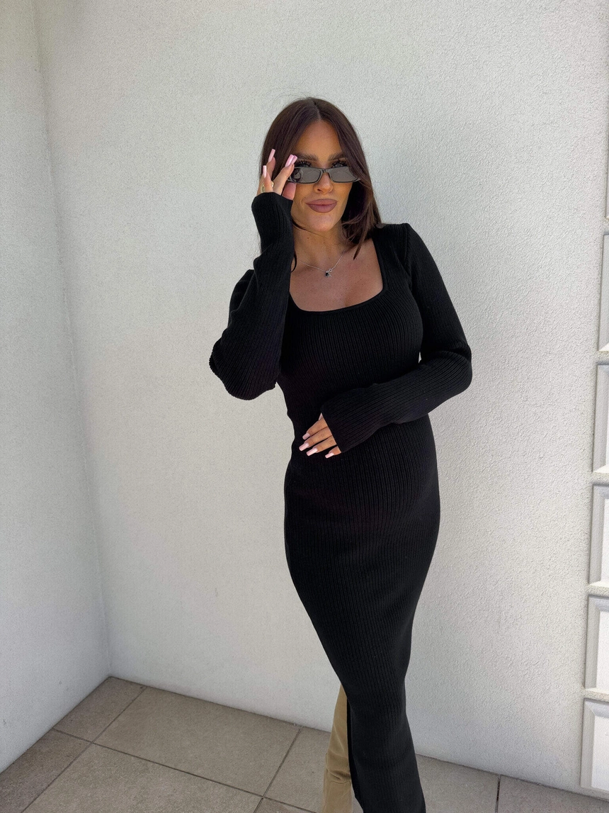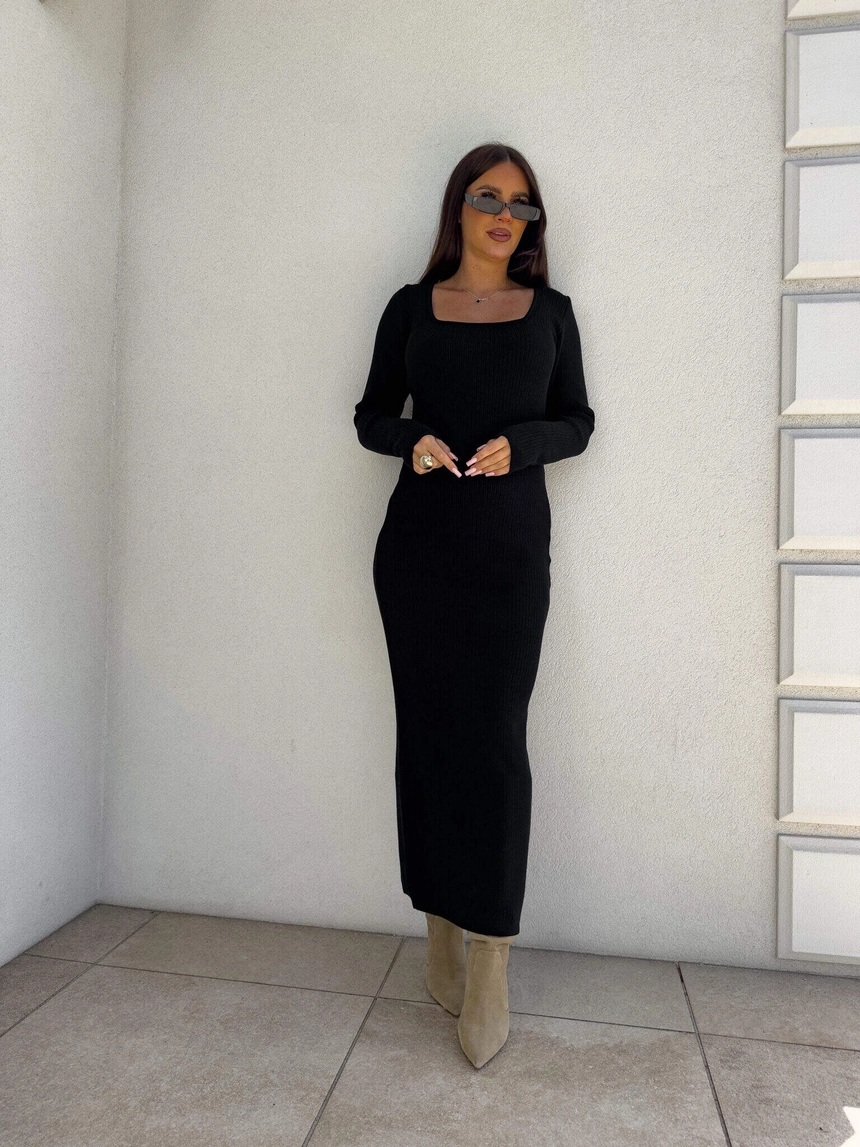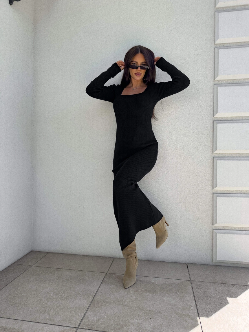 Sukienka o długości midi, wykonana z wysokiej jakości, elastycznej przędzy o prążkowanej strukturze. Model dekoltem karo i długimi rękawami doskonale podkreśla sylwetkę, zapewniając jednocześnie komfort noszenia. Subtelne rozcięcie z tyłu dodaje całości kobiecego charakteru i ułatwia swobodne poruszanie się. Idealna zarówno na co dzień, jak i na bardziej formalne okazje.