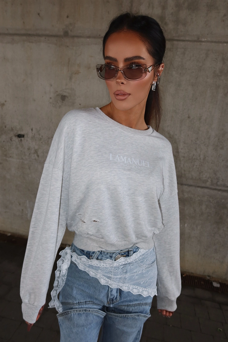 Bluza o swobodnym fasonie, ozdobiona ręcznie wykonanymi przetarciami, które nadają jej surowy, miejski charakter. Minimalistyczne logo i klasyczna forma równoważą styl vintage z nowoczesnym luzem. Idealna do jeansów, spodni cargo lub shortów.Skład: 90% bawełna 10% poliester