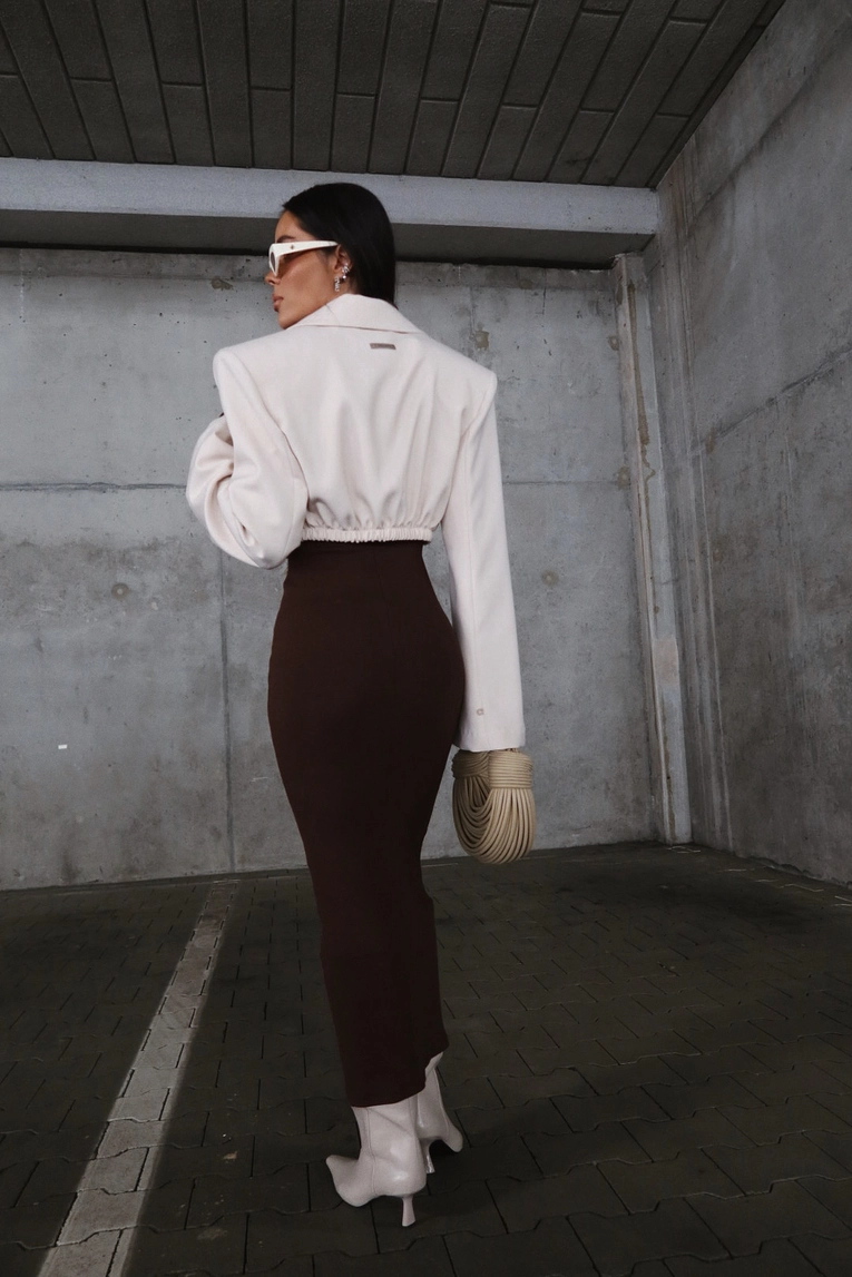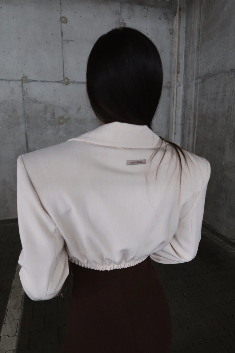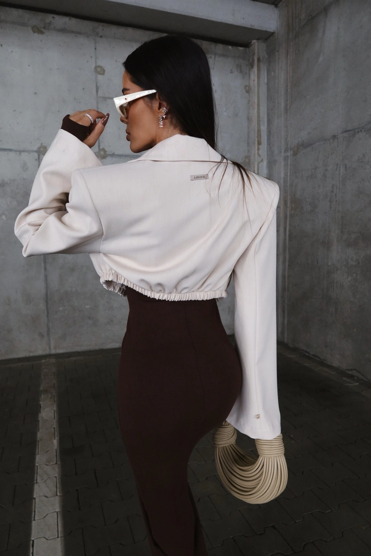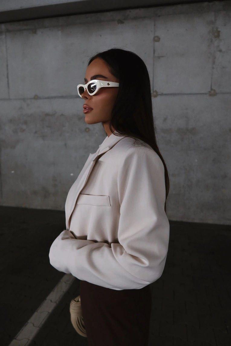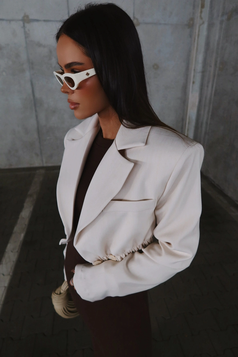 Ta marynarka robi całą stylówkę. Oversize’owy krój w wersji cropped i taliowanie gumką dają idealny balans między elegancją a streetem. Ale to rękawy są tu gwiazdą – szerokie, zapięciem na guziki. Możesz spiąć je od góry, od dołu albo zostawić luźno – za każdym razem dają zupełnie inny efekt.Skład: 73% poliester 21% wiskoza 6% spandex
