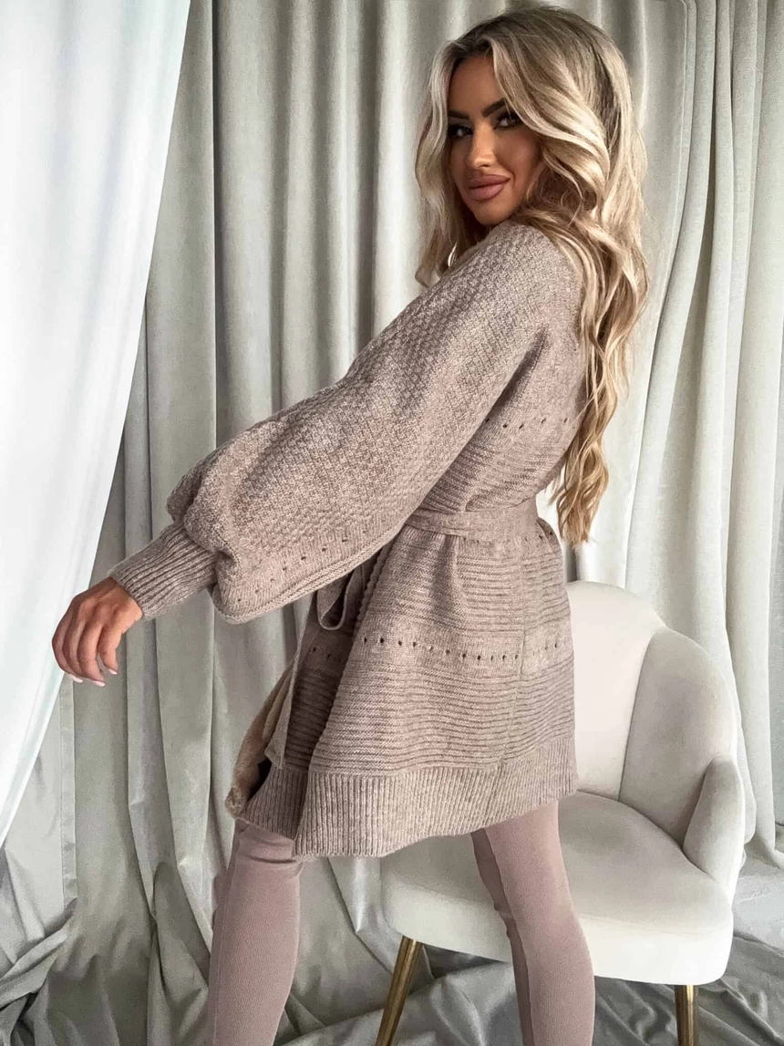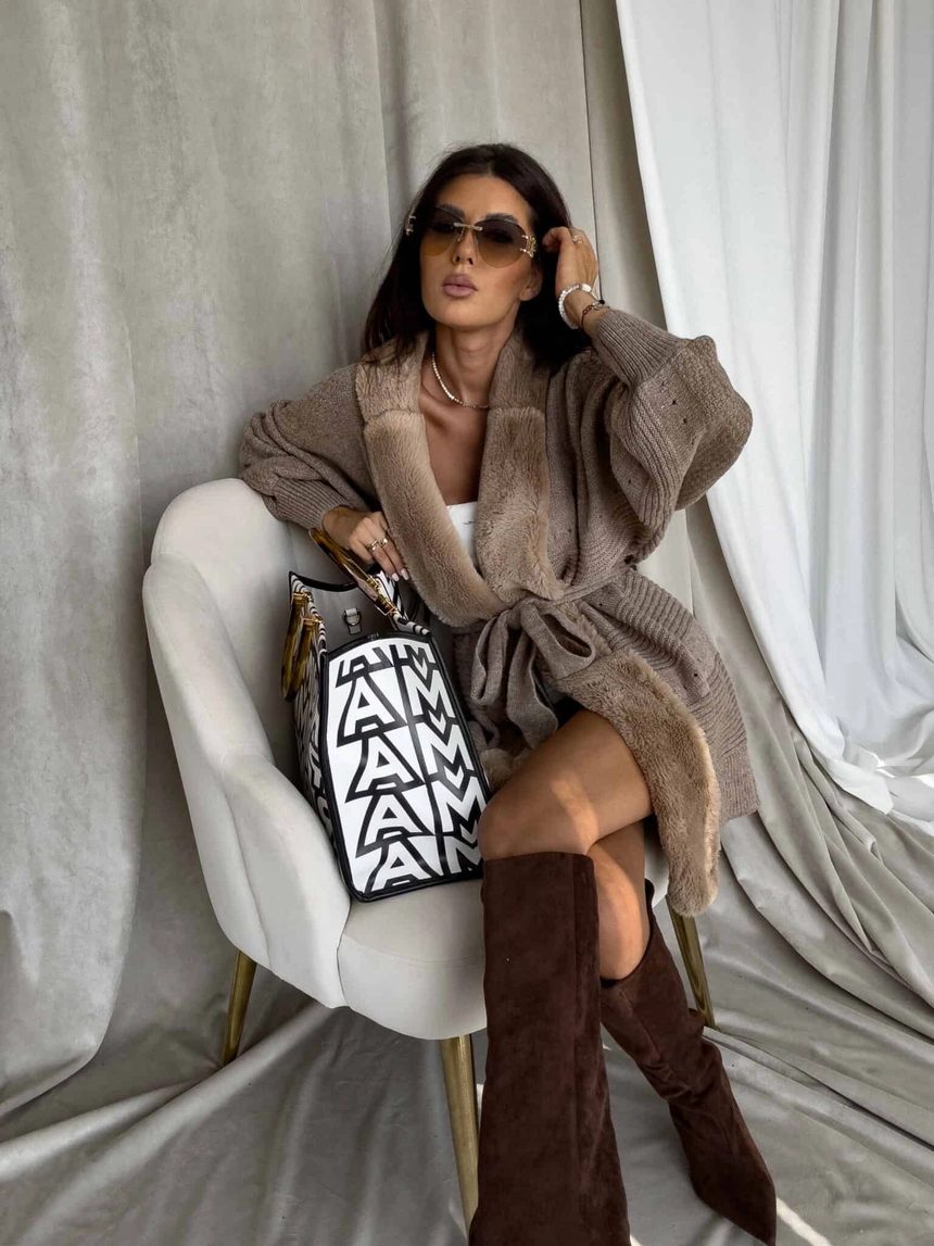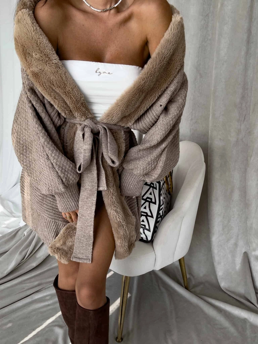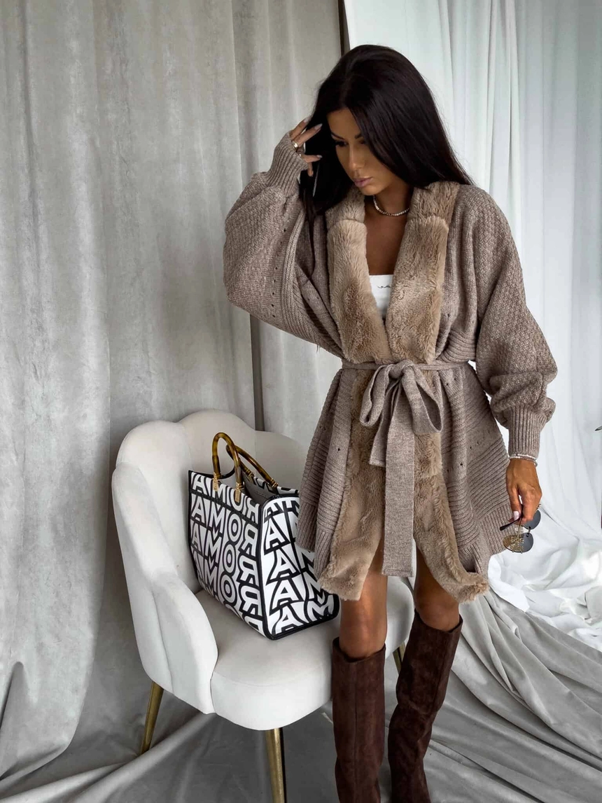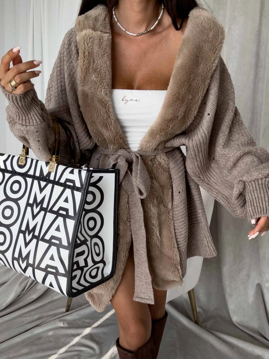 Kardigan DREAM to połączenie klasyki i nowoczesnych detali. Wyróżnia się kontrastem tekstur – tradycyjna dzianina została zestawiona z miękkim futerkiem. Luźny, oversize’owy krój zapewnia swobodę i komfort noszenia, a bufiaste rękawy zakończone są elastycznymi ściągaczami. Wiązanie w pasie – wykonane z tego samego materiału – pozwala dopasować kardigan do sylwetki, podkreślając talię.